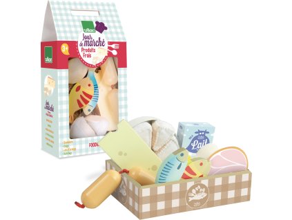 Pekný lepenkový box obsahuje 2 ryby, plátok šunky, vajcia, krabicu mlieka, syr a špekáčiky. Tento set je ideálním doplnkom do kuchyniek Vašich detí, 11 dielna sada.