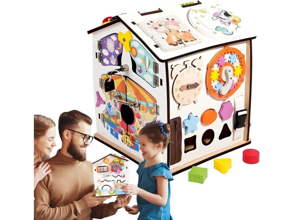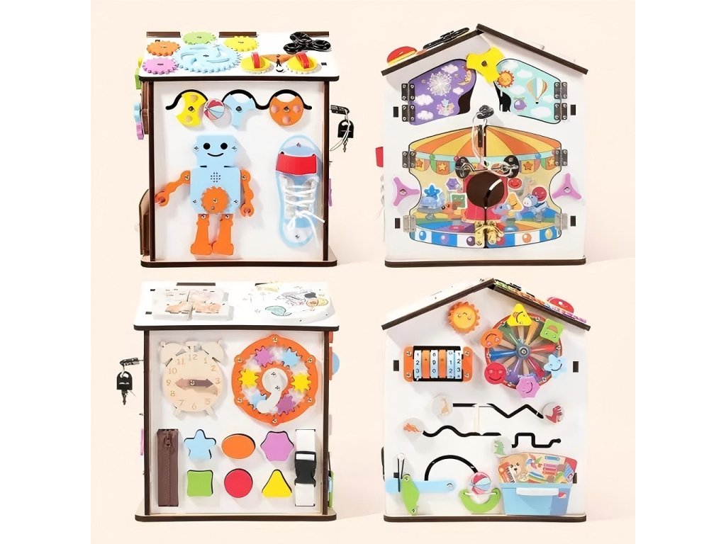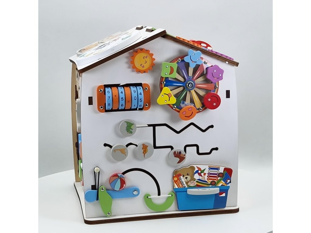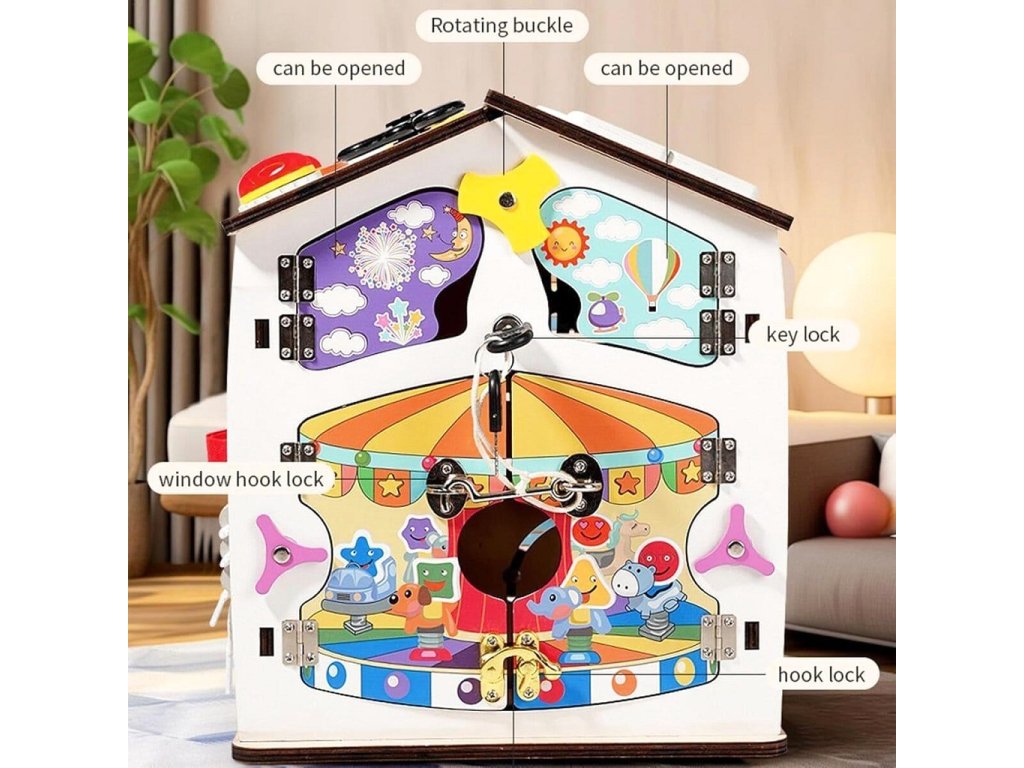Domček je ideálny aj pre tréning praktických zručností. Deti si vyskúšajú otváranie a zatváranie rôznych typov dvierok, zámkov, petlíc a západiek, naučia sa pracovať so zipsom, či prackami. Tým si precvičujú trpezlivosť, presnosť a logické uvažovanie a zároveň sa zábavnou formou pripravujú na bežné každodenné činnosti.