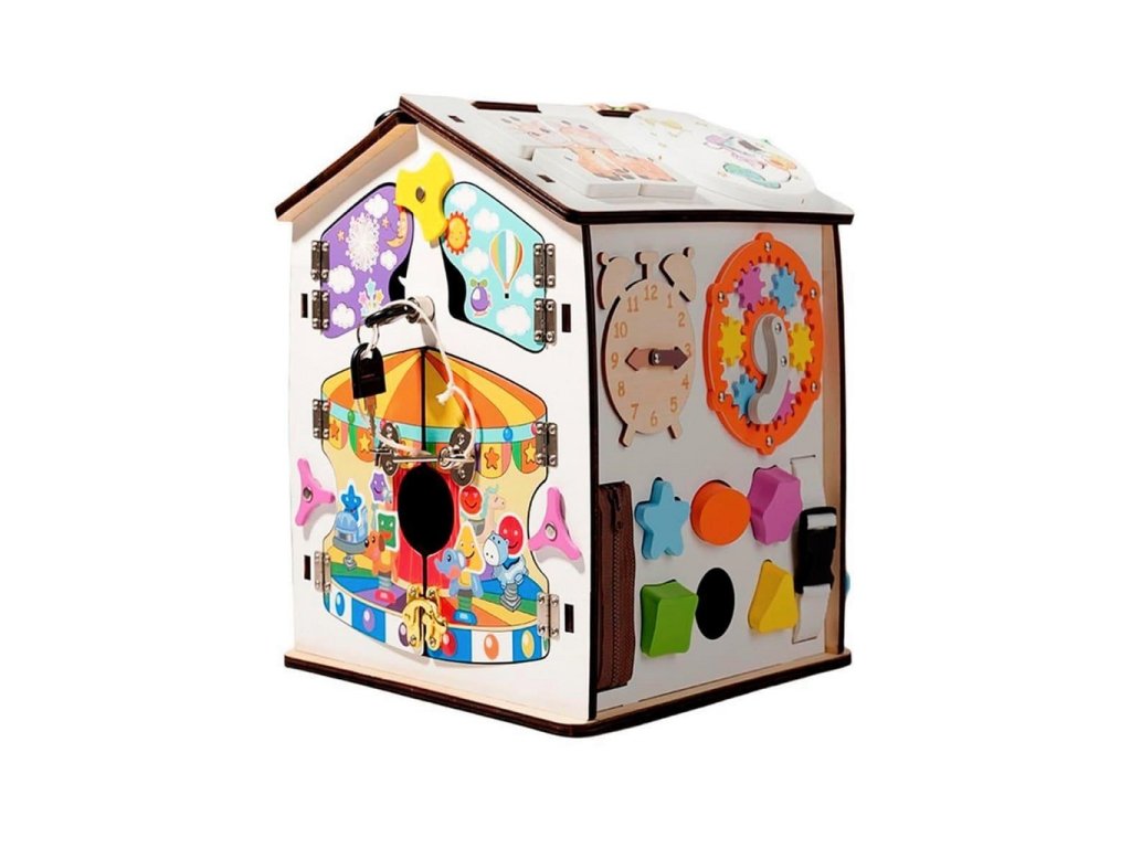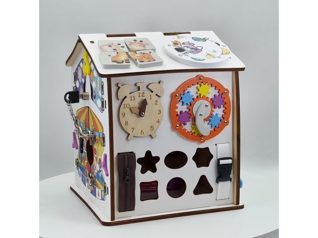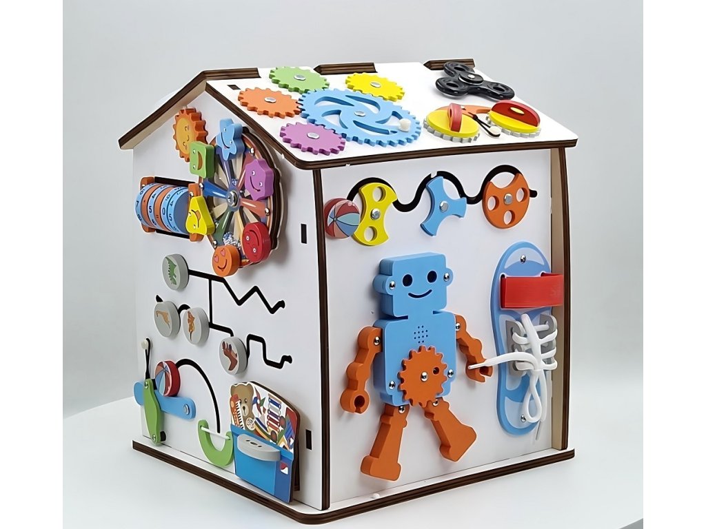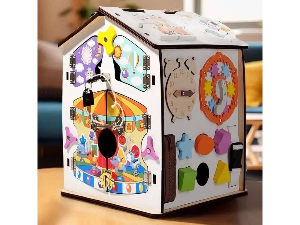 Domček je ideálny aj pre tréning praktických zručností. Deti si vyskúšajú otváranie a zatváranie rôznych typov dvierok, zámkov, petlíc a západiek, naučia sa pracovať so zipsom, či prackami. Tým si precvičujú trpezlivosť, presnosť a logické uvažovanie a zároveň sa zábavnou formou pripravujú na bežné každodenné činnosti.