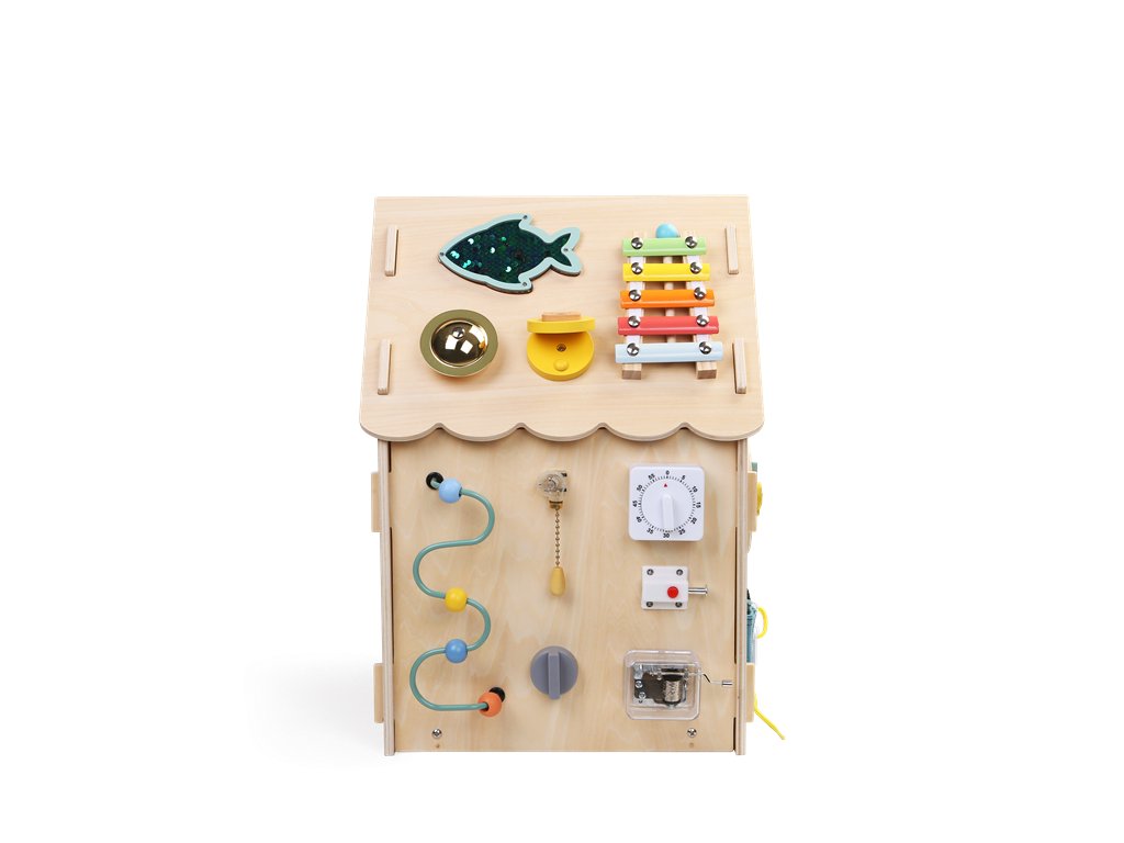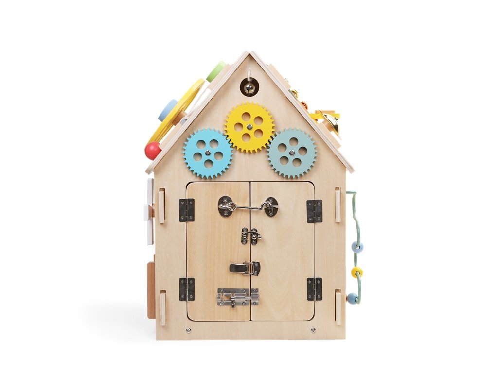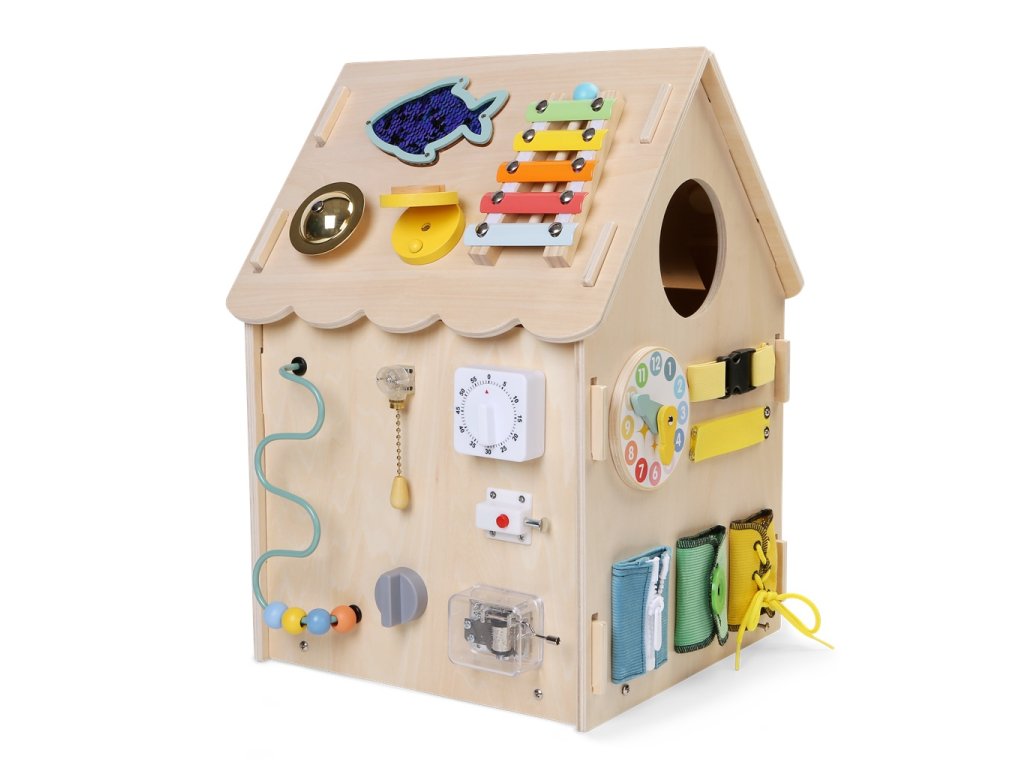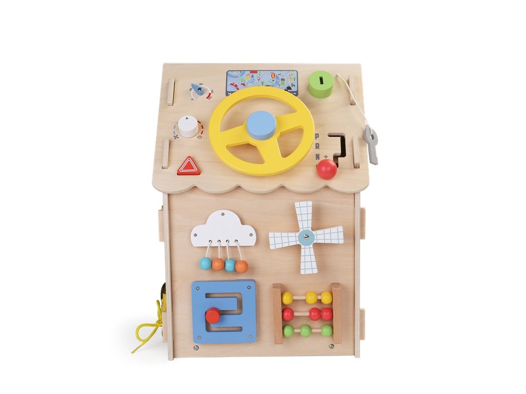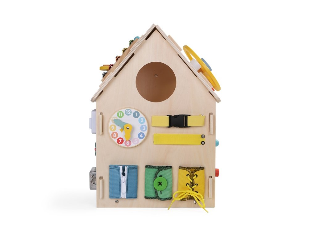 Deti môžu otáčať farebným volantom, skúšať radiacu páku, viesť guľôčku labyrintom, točiť ozubenými kolieskami a sledovať, ako do seba zapadajú. Domček ponúka aj počítadlo, otáčací veterník a závesné korálkové oblaky, ktoré rozvíjajú zmyslové vnímanie aj jemnú motoriku. Nechýba ani tréning praktických zručností! Deti si môžu skúšať otváranie a zatváranie rôznych typov zámkov, závor a západiek, učia sa zaviazať šnúrky, zapnúť zips či gombík. Precvičujú si trpezlivosť, presnosť aj logické myslenie a pripravujú sa tak zábavným spôsobom na úkony každodenného života. Domček je vyrobený z kvalitného prírodného dreva a natretý netoxickými farbami. Všetky hrany sú hladké a bezpečné pre detské ruky. Skvelý darček pre zvedavé deti od 3 rokov. Hračka podporuje samostatnosť, kreativitu a prirodzenú túžbu objavovať svet okolo seba.