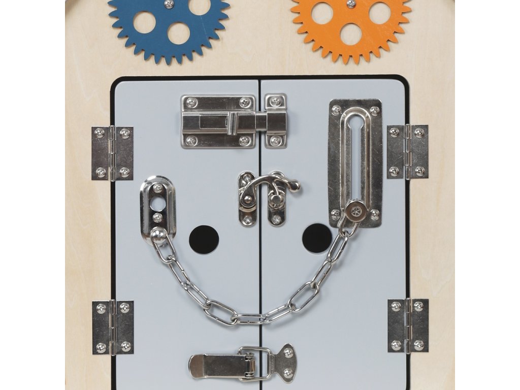 Deti tu nájdu rôzne druhy zámkov, západiek a háčikov, ktoré po odomknutí odhalia tajomné dvierka, spinner na roztočenie, otočnú minútku, funkčný vypínač so svetielkom, či farebný labyrint s rybičkou. Xylofón s paličkou zoznámia deti s prvými tónmi a rytmom, zatiaľ čo hodiny naučia porozumieť času. Nechýba ani hrajúci telefón ktorý Vás zabaví najrôznejšími zvukmi aj veselými melódiami!