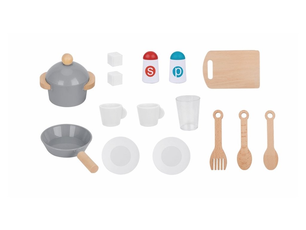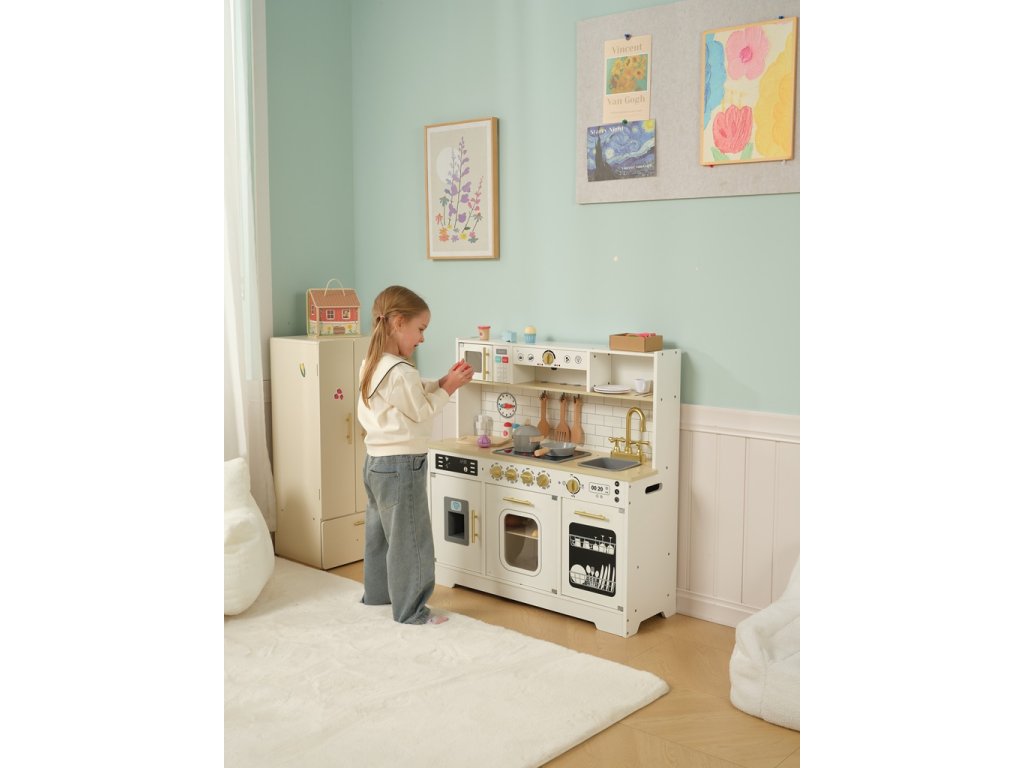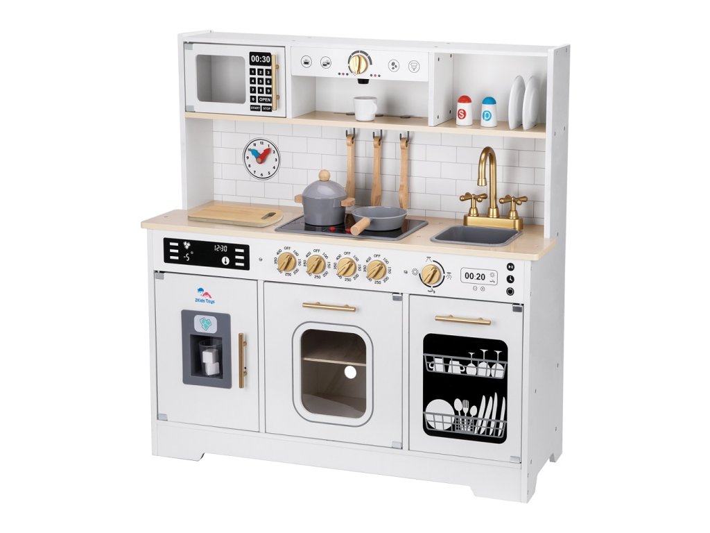 Táto veľká detská kuchynka je ideálnou hračkou pre všetkých malých kuchárov a kuchárky, ktorí milujú varenie a chcú objavovať svet kulinárskych dobrodružstiev. Moderný dizajn v elegantnej kombinácii šedej farby a zlatých doplnkov dopĺňajú realistické spotrebiče a bohaté príslušenstvo, ktoré deťom umožní rozvíjať kreativitu, samostatnosť a hru na role.Kuchynka má pevnú konštrukciu v tvare obdĺžnika a nemožno ju výškovo nastavovať. Na bočných stranách sú praktické otvory pre ľahké nadvihnutie a premiestnenie celej kuchynky. Deti tu nájdu varnú dosku so svietiacimi platničkami, ktoré je možné zapínať a vypínať, a tiež cvakavé otočné gombíky, ktoré dodávajú hre reálny zvukový efekt.Súčasťou kuchynky je mikrovlnná rúra s otváracími dvierkami (tlačidlá sú iba dekoratívne), rúra na pečenie a umývačka riadu, ktoré fungujú ako úložné skrinky. Nechýba ani kávovar, drez s otočným kohútikom a priestranná chladnička s funkčným výrobníkom ľadu. Po vložení dvoch kociek ľadu do hornej časti stačí priložiť pohárik spredu a zatlačiť ho smerom dozadu a ľadové kocky naozaj spadnú dovnútra, čo je obľúbená funkcia všetkých detí.Kuchynka je doplnená bohatým príslušenstvom, ktoré zahŕňa hrniec s pokrievkou, panvičku, doštičku, kuchynské náčinie v podobe 3 kusov varečiek, 2 tanieriky, 2 hrnčeky, pohár, soľničku, koreninu, dve kocky „ľadu“ a hodiny s otočnými ručičkami. Vďaka tomu majú malí kuchári všetko potrebné na prípravu i servírovanie svojich kuchárskych výtvorov. Hlavné vlastnosti: cvakavý zvuk pri otáčaní gombíkovsvietiace platničky varnej dosky (možno zapnúť/vypnúť)otváracie dvierka spotrebičovfunkčný výrobník ľadu s dvoma kockamibohaté príslušenstvo pre hru na varenierôzne odkladacie a úložné priestorymoderný dizajn v šedej farbe so zlatými doplnkamirozvíja kreativitu, sociálne zručnosti a dlhotrvajúcu hru na rolevyrobené z FSC® certifikovaného dreva2xAA batérie nie sú súčasťou balenia Značka a certifikát FSC® (Forest Stewardship Council) zaručuje, že drevo, z ktorého bol výrobok vyrobený, nebolo vyťažené nelegálne a pochádza z lesov obhospodarovaných šetrným či prírode blízkym spôsobom, v ktorom sú dodržiavané prísne environmentálne a sociálne požiadavky. Značka FSC® na výrobku znamená, že svojim nákupom pomáhate chrániť lesy a podporujete šetrné, zodpovedné či prírode blízke hospodárenie, vďaka ktorému sú naše lesy stabilnejšie, zdravšie, majú prirodzenú druhovú skladbu a lepšie odolávajú negatívnym následkom klimatických zmien.Dodatočné parametre