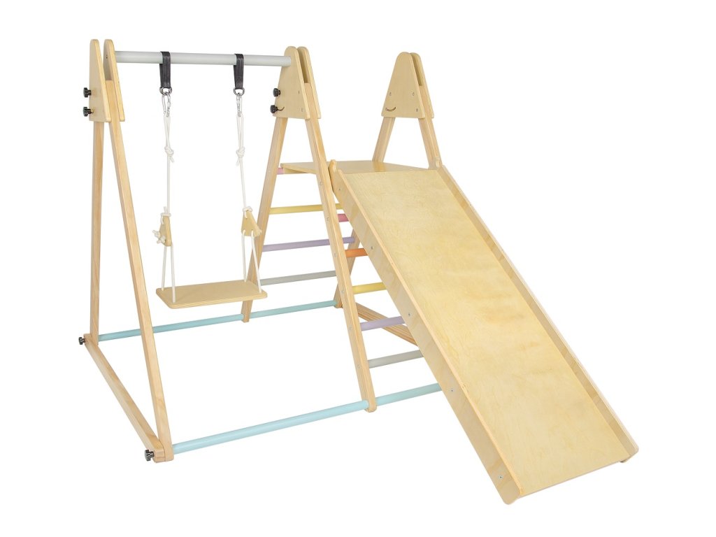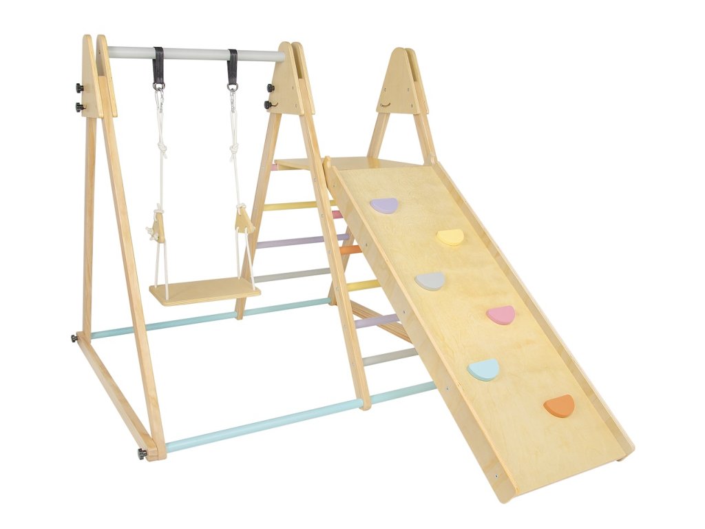 Drevená hracia zostava je určená na vnútorné použitie a ponúka nielen praktický, vkusný dizajn, ale aj funkčné využitie. Vzhľadom k dizajnu a zvolenej farebnosti - prírodného dreva kombinovaného s tlmenými, pastelovými odtieňmi - sa stáva skvelým doplnkom do každej izbičky! Multifunkčnosť tejto hracej zostavy ponúka širokú škálu aktivít ako preliezanie, hojdanie, kĺzanie alebo lezenie. Vďaka týmto činnostiam deti rozvíja motorické zručnosti, rovnováhu či koordináciu pohybu. Výrobok je tvorený z hojdačky, rebriny a dosky s pastelovými úchytmi. Vyžaduje sa montáž dospelej osoby. Dodáva sa s detailným návodom na zostavenie (CZ, SK, EN). Hlavné vlastnosti: na vnútorné použitiemultifunkčné vlastnostinosnosť max. 40 kgtrénuje motoriku a rovnováhuskvelý doplnok do herného kútikaprodukt je možné využiť na pohybovú terapiuDodatočné parametre