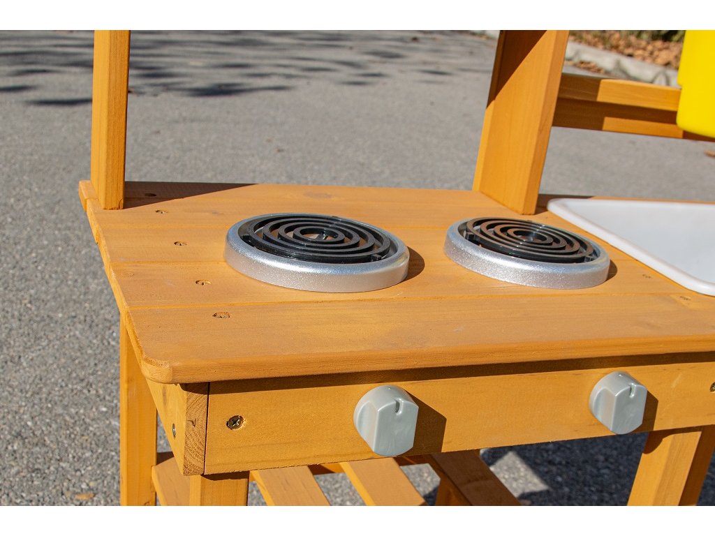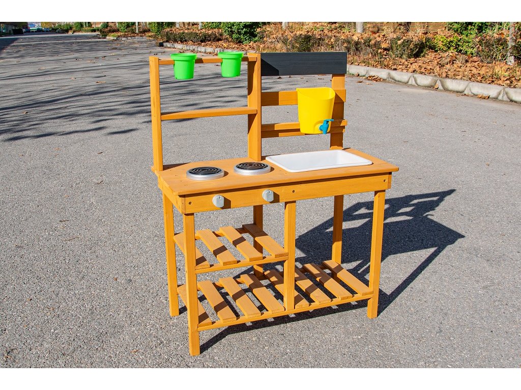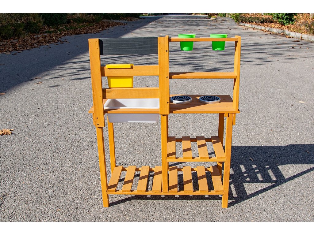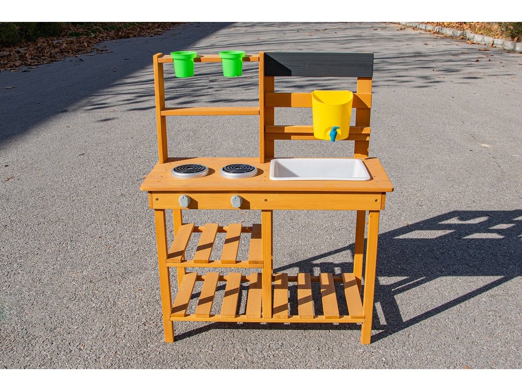 Doprajte deťom desiatu priamo pod holým nebom av objatí prírody. Na mieste, kde pokrmy vonia sviežim vánkom a slnko opeká bochníkmi z piesku a vody, vzniká priestor na hru plnú fantázie. Táto záhradná kuchynka ponúka skvelú príležitosť, ako u detí rozvíjať kreativitu, samostatnosť a kulinárske zručnosti pri hre na čerstvom vzduchu.Kuchynka je vybavená užitočnými prvkami, ako je džbán s kohútikom, drez, dve platničky na varenie a dva kvetináče. Nechýbajú ani rozsiahle úložné priestory, ktoré sa hodia na uloženie všetkého príslušenstva. A aké je dnes menu? Čistá fantázia! Hlavné vlastnosti: kompaktné rozmerymultifunkčné a rozmanité využitierozmerný úložný priestorDodatočné parametre