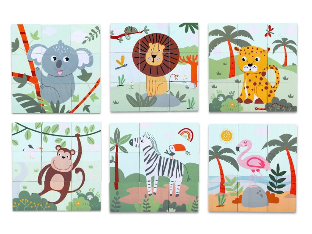 Objavte svet divokých zvierat s klasickými drevenými kockami! Deti si pri skladaní užijú množstvo zábavy a zároveň precvičia logiku, trpezlivosť aj jemnú motoriku. Každá strana kociek tvorí časť obrázku, otočením a správnym zložením vznikne celkom 6 rôznych motívov so zvieratkami zo safari: opice, plameniak, zebra, lev, leopard a koala. Kocky sú vyrobené z kvalitného dreva a majú tú správnu veľkosť pre detské ručičky. Vďaka pestrým ilustráciám sú ideálne už pre malé deti, ktoré sa tak hravou formou zoznamujú so zvieratami a rozvíjajú svoje schopnosti. Hlavné vlastnosti: 9 kociekkvalitné drevené prevedenie6 farebných obrázkov zvieratrozvoj jemnej motoriky a logického mysleniavhodné pre deti od 2 rokovDodatočné parametre