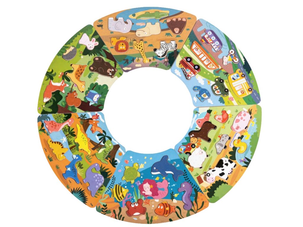 Rozvíjajte jemnú motoriku a logické myslenie Vášho dieťaťa s hravým vkladacím puzzle! Sada 6 prepojiteľných puzzle dohromady vytvára kruh plný pestrých a rozmanitých scén s domácimi, lesnými aj exotickými zvieratkami, podvodným svetom, dopravnými prostriedkami a dinosaurami. Každé puzzle obsahuje farebné a roztomilé tvary, ktoré sa dajú vkladať do výrezov, alebo ich využiť samostatne pri voľnej hre. Vďaka tomu môžu deti rozpoznávať zvieratká, dopravné prostriedky či obyvateľov podmorského sveta, tvoriť vlastné scény a hrať sa podľa svojej fantázie. Kombinácia hravých obrázkov spolu s kvalitným prevedením robia z tejto hračky pekný doplnok každej izbičky alebo herne. Hlavné vlastnosti: kruh 6 rôznorodých scén – domáce, lesné a exotické zvieratá, dopravné prostriedky, podmorský svet a dinosaurycelkom 6 podložiek a 42 dielikovrozvíja jemnú motoriku a logické myslenierozmanité vkladacie tvarytvary je možné využiť aj samostatne pri hranívhodné pre deti od 18 mesiacovDodatočné parametre