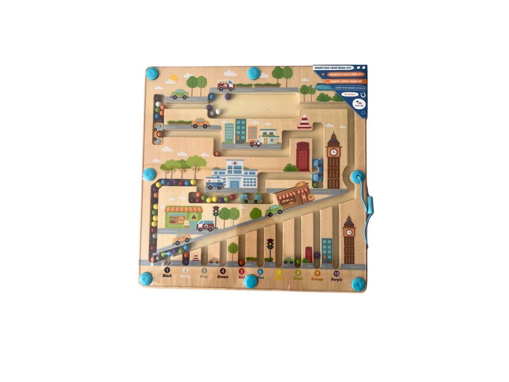 Zábavná drevená hra, ktorá pomáha deťom rozvíjať jemnú motoriku, orientovať sa v priestore a rozširovať slovnú zásobu pomenovávaním farieb a predmetov v meste. Deti sa tiež učia základy počtov formou hry. Drevená základňa v dizajne mesta je krytá odolnou priehľadnou plastovou doskou, hračka je vďaka tomu bezpečná.