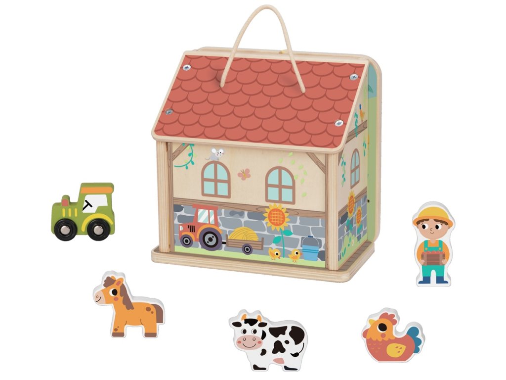 To je ale krásny slnečný deň! Deti si užijú veľa zábavy s farmou so zvieratkami, traktorom a farmárom. Zábavnou formou sa naučia rozpoznávať zvieratká a vďaka roztomilým ilustráciám sa dozvedia množstvo užitočných informácií o tom, čo sa na farme pestuje, aké náradie sa používa a čím sa zvieratká kŕmia. Zadná stena farmy je vyklápacia a obojstranne pomaľovaná. Do vnútorného priestoru si deti upratajú všetky figúrky a vďaka praktickému uchu si môžu svoju obľúbenú hračku vziať vždy so sebou. Hračka inšpiruje k rozprávaniu príbehov a zlepšuje komunikačné zručnosti. Vďaka kvalitnému spracovaniu a kombinácii žiarivých farieb s farbou prírodného dreva bude krásnym doplnkom každej detskej izbičky alebo herne. Hlavné vlastnosti: farma, figúrka farmára, kravičky, sliepočky, koníčka a traktorarozvíja zručnosť a jemnú motorikuvedie k predstavivej hrevyklápacia zadná stena a praktické ucho na prenášanievyrobené z dreva s certifikáciou FSC®pre deti od 2 rokov Značka a certifikát FSC® (Forest Stewardship Council) zaručuje, že drevo, z ktorého bol výrobok vyrobený, nebolo vyťažené nelegálne a pochádza z lesov obhospodarovaných šetrným či prírode blízkym spôsobom, v ktorom sú dodržiavané prísne environmentálne a sociálne požiadavky. Značka FSC® na výrobku znamená, že svojim nákupom pomáhate chrániť lesy a podporujete šetrné, zodpovedné či prírode blízke hospodárenie, vďaka ktorému sú naše lesy stabilnejšie, zdravšie, majú prirodzenú druhovú skladbu a lepšie odolávajú negatívnym následkom klimatických zmien.Dodatočné parametre