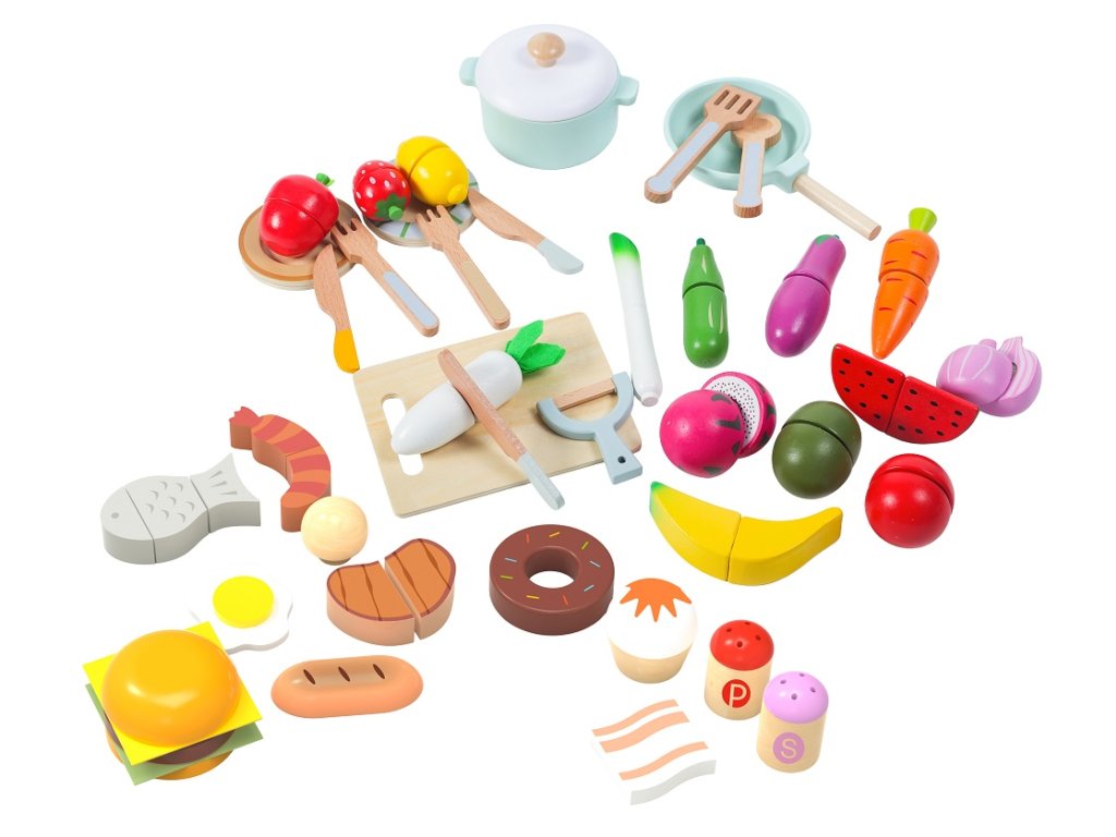 Premeňte detskú hru na naozajstný kulinársky zážitok.Táto bohatá drevená súprava do detskej kuchynky ponúka všetko, čo malí kuchári a kuchárky potrebujú na varenie, krájanie i servírovanie. Nájdete tu pestrý výber ovocia, zeleniny, pečiva, sladkostí i kuchynského náčinia, ktoré dohromady tvoria dokonale plnohodnotné zázemie na detské varenie. Deti si môžu pripraviť raňajky, obed aj dezert, učiť sa rozpoznávať potraviny a rozvíjať fantáziu pri hraní rolí. Vďaka krájacím dielikom na suchý zips si navyše precvičia jemnú motoriku a koordináciu ruka-oko. Skvelá hračka pre malých milovníkov varenia, ktorá zabaví na dlhé hodiny a zároveň prirodzene rozvíja dôležité zručnosti. Hlavné vlastnosti: obsahuje 42 kusov - ovocie, zelenina, pečivo, sladkosti, mäso, riad aj kuchynské náčiniekvalitné drevené prevedenie s hladkým a bezpečným povrchompodporuje kreativitu, predstavivosť a sociálne zručnostiideálny doplnok do detskej kuchynky alebo obchodíkukrásne farebné spracovanie vhodné pre chlapcov aj dievčatáDodatočné parametre