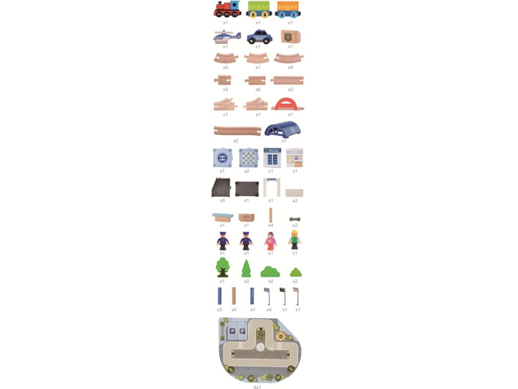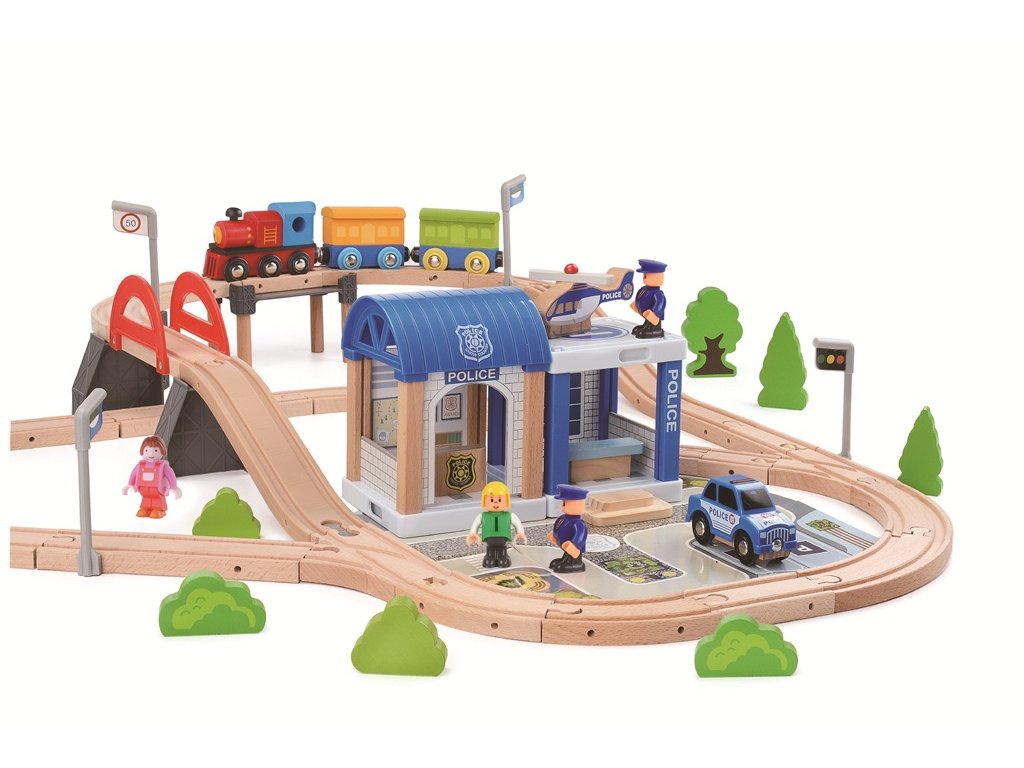 Táto moderná drevená vláčikodráha s motívom rušného mesta poteší každého malého strojvodcu aj staviteľa. Sada obsahuje vláčik s tromi vagónmi, koľaje vrátane vyvýšeného nadjazdu, priestrannú vlakovú stanicu s prístreškom, policajné auto, postavičky, dopravné značky, lampy, stromy a ďalšie detaily, ktoré dotvárajú atmosféru skutočného mesta. Vďaka výškovo rozmanitým koľajniciam a realistickému príslušenstvu sa deti môžu hrať na rôzne dopravné situácie, plánovať jazdu, stavať trasy alebo pomáhať obyvateľom mesta pri cestovaní. Hra rozvíja kreativitu, jemnú motoriku aj priestorovú predstavivosť. Ideálne ako darček alebo doplnok detskej izbičky. A pre ešte väčšiu zábavu je možné vláčikodráhu prepojiť s vláčikodráhou Dediny 110 dielov (kód produktu 2D98208), a spoločne tak vytvoriť rozľahlé železničné impérium plné zábavy!Dodatočné parametre