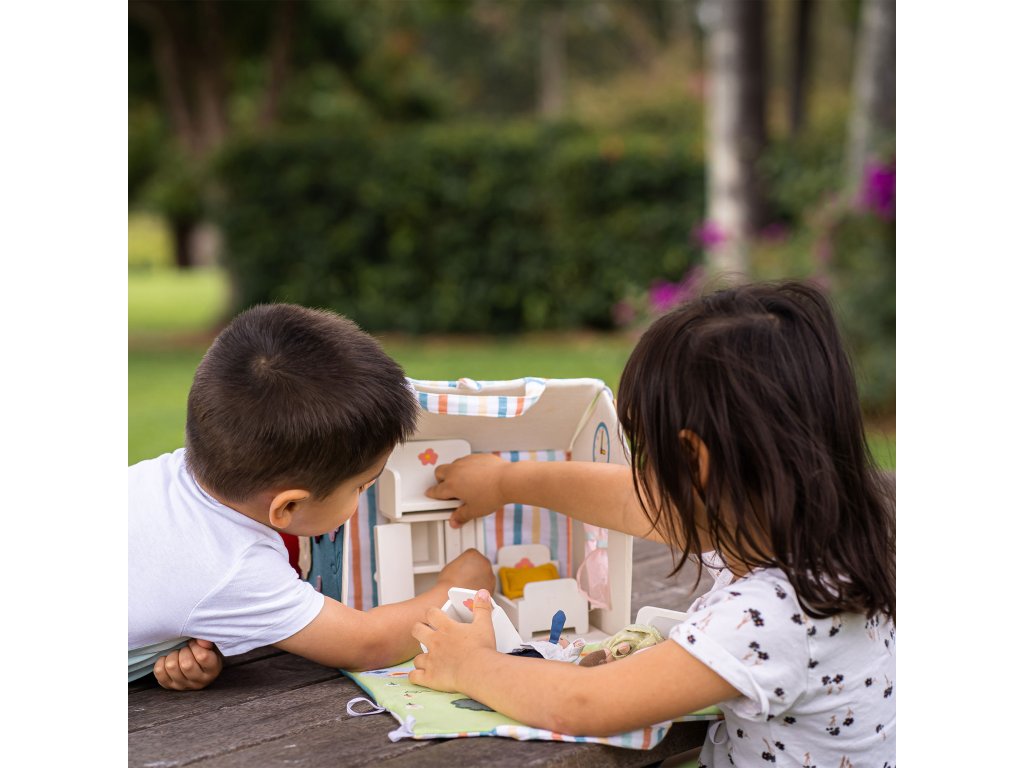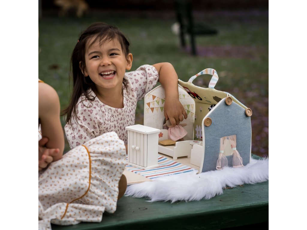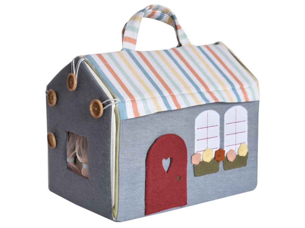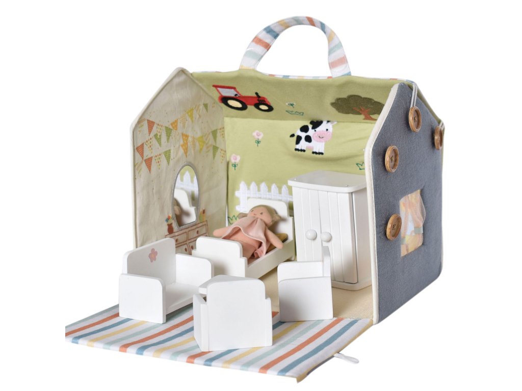 Hra s bábikou rozvíja okrem jemnej motoriky aj schopnosť pomáhať, vcítiť sa, posilňuje vrodený cit pre starostlivosť a cez hrané príbehy napomáha rozvoju fantázie a predstavivosti. Keďže malé deti ešte nevedia vyjadriť svoje emócie slovami, často ich vyjadrujú práve prostredníctvom hry s bábikami, kam prenášajú kúsok svojho vlastného sveta.Nádherný Bonikka látkový domček pre bábiky s dreveným nábytkom a roztomilou mini bábikou je ideálny na hranie so súrodencami alebo kamarátmi. Bábiku so zariadením ľahko detičky schovajú do domčeka a vďaka praktickému ušku si ho môžu vziať kamkoľvek so sebou. Domček sa predáva rozložený, takže si dieťa užije veľa zábavy pri jeho rozbaľovaní a skladaní.Domček je krásne dekorovaný. Vo vnútri nájdete scénu z farmy so zvieratkami, okno so závesom, zrkadielko pre bábiku a z vonkajšej strany otvárajúce sa červené dvere a oblečenie visiace na šnúre.Bonikka domček pre bábiky otvára dvere nekonečnej kreativite prostredníctvom hrania rolí. Okrem fantázie pomáha zlepšiť motorické zručnosti dieťaťa, návyky pri rozprávaní príbehov a iné fyzické, ako aj kognitívne zručnosti.Obsah domčeka: Krásna malá látková bábika v šatách. Drevená posteľ, komoda, 3 sedačky a stolík. Vhodné pre deti od 3 rokov.Veľkosť: cca 28 cm x 20 cm x 23 cm.Zloženie: Domček pre bábiky je vyrobený z 90 % bavlny a 10 % polyesteru a pevného kartónu vo vnútri stien. Nábytok je vyrobený z ekologického kaučukového dreva.Údržba: Utrite do čista navlhčenou handričkou. Neprať, nebieliť, nesušiť v sušičke, nežehliť.Všetky Bonikka produkty sú vyrobené s ohľadom na životné prostredie. Vieme, že rešpektovať životné prostredie znamená rešpektovať celú našu planétu, ktorú tak chránime pre ďalšie generácie.Dodatočné parametre