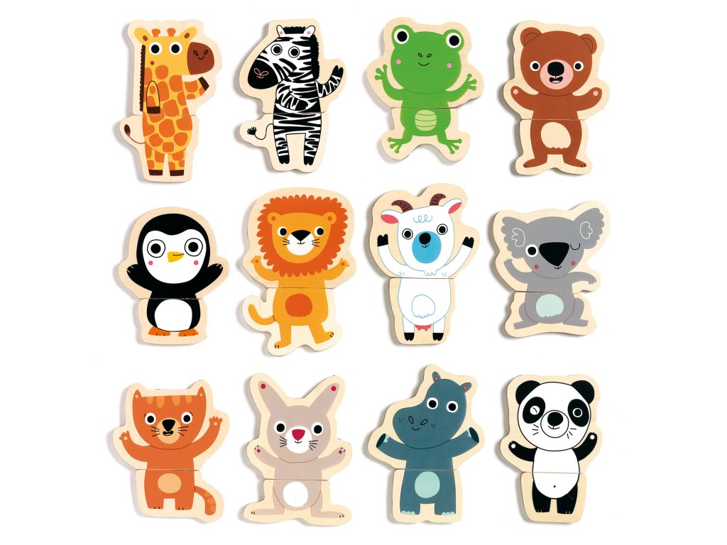 Štyri krásna drevená zvieratka ktorých magnetické odnímateľné diely je možné miešať k vytvoreniu vtipného imaginárneho zvieratká. Ilustrované Ingela P. Arrhenius.