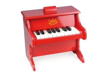 Krásny červený drevený klavír s 18 klávesmi. Rozmery: 30x25x32 cm