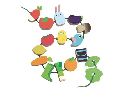 Krásna prevliekačka v motíve farmy. V kompaktnom balení nájdete 14 ilustrovaných drevených korálkov (napr. baklažán, paradajka, vtáčik, gumáky), ktoré deti môžu navliekať na...