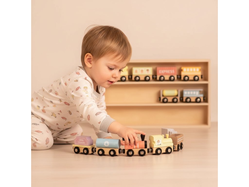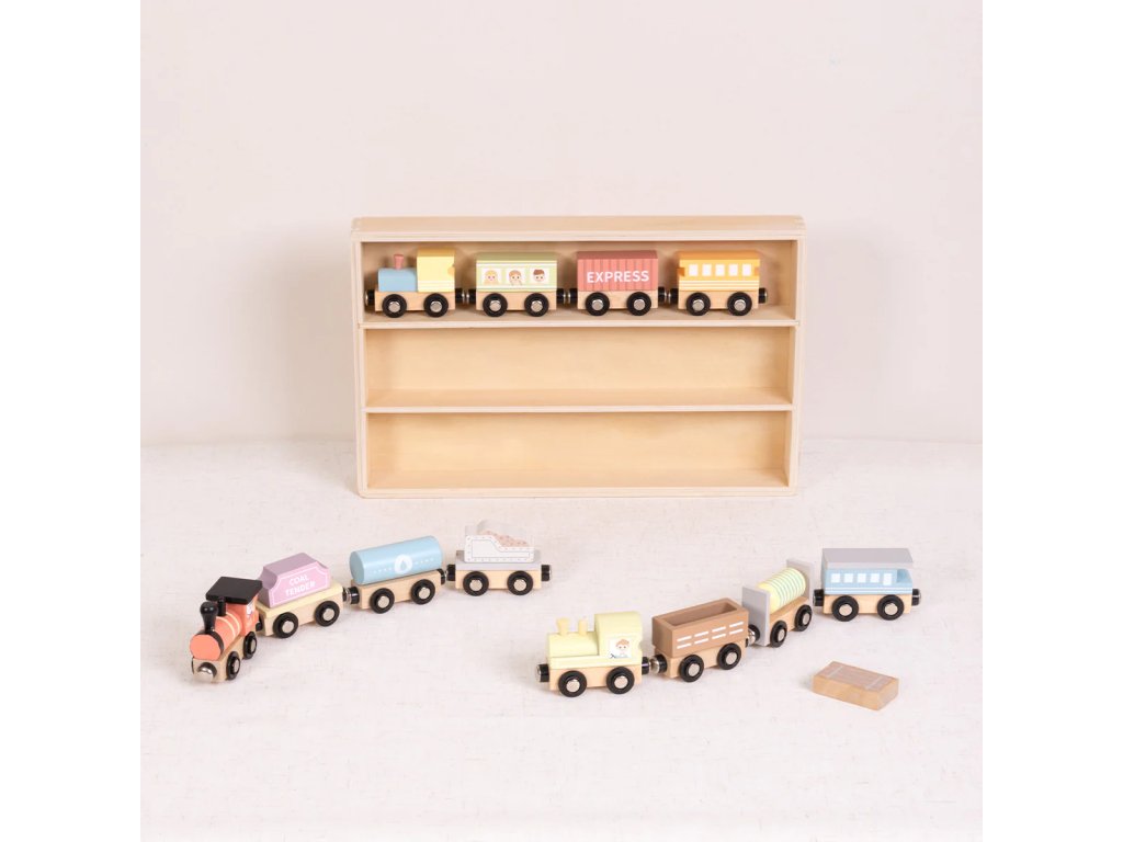 A készlet 3 fából készült mozdonyt és 9 különböző személy- és szállító kocsit tartalmaz. Mindegyik szépen összekapcsolható mágnesekkel. A fából készült vitrin állomásként vagy parkolóként szolgálhat a játék során. Miután játszottak benne, a gyerekek mindent újra feltakarítanak. Vonatok a fából készült vonatpályánA gyermekek önállóan is játszhatnak velük. Fejleszti a finommotoros készségeiket, a szem-kéz koordinációt és fejleszti a képzelőerejüket. Csoportos játék közben gyakorolják szociális és kommunikációs készségeiket. A vonatok fenntartható erdőgazdálkodásból származó fából és a gyermekek biztonságát szem előtt tartva készülnek.