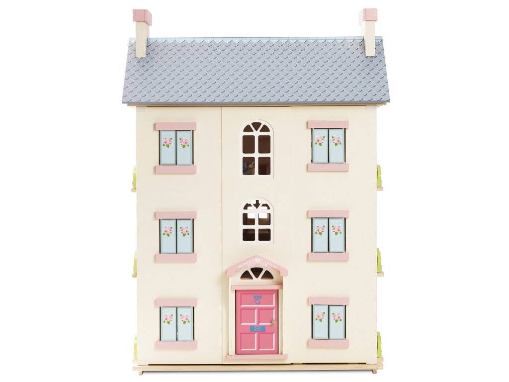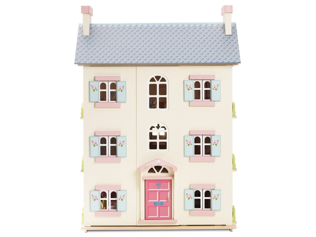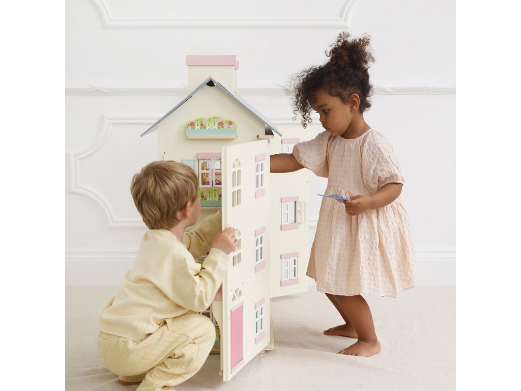 Vitajte doma! Tento veľký drevený štvorposchodový domček pre bábiky sa bude vynímať v zbierke hračiek vašich detí. Čaká ich zábava pri hre na role, tento nádherný domček je dosť veľký pre každého malého lorda alebo lady.Grandiózny dom je plný maľovaných detailov v jemnej pastelovej ružovej a modrej, nájdete tu aj motívy kvetov. Krásne klasické aj oblúkové okná a ružové dvere len čakajú na otvorenie. Okenice sú pohyblivé, deti ich môžu na noc zavrieť, ráno zase dovnútra pustiť svetlo. Po otvorení prednej strany sa deti môžu ponoriť do sveta predstavivosti. Steny izieb sú dekorované individuálne, nájdete tu drevené schodisko s okrasným zábradlím. Šedá škridlová strecha s 2 komínmi je oddeliteľná, odhalí pôdu, namiesto schodiska na ňu vedie rebrík. Vysnívaný dom pre bábiky bude špeciálnym darčekom pre mnoho detí, môžete si ho taktiež odovzdávať z generácie na generáciu.Vybavenie domčeka a bábiky môžete zakúpiť zvlášť – podporte detskú predstavivosť doplnkami od Le Toy Van, ktoré pasujú do všetkých domčekov z kolekcie Daisylane. Hračky s účelomVšetky hračky firmy Le Toy Van sú vyrobené s cieľom - aby dlho vydržali. Dizajnované s láskou skúsenými remeselníkmi za použitia etických praktík a udržateľných materiálov, ktoré sú láskavejšie k našej planéte. Hlavné vlastnosti: pre bábiky do 15 cmudržateľné FSC drevovyrobené eticky s láskoutestované podľa najprísnejších štandardovmaľované netoxickými farbami na báze vodyinšpiruje k predstavivej hrepomáha s rozvojom kreativity, reči a koordinácie Ocenenia hračky:Made For Mums Gold Award 2018Good Toy Guide Approved Daisylane kolekcia: Prestížna kolekcia domčekov pre bábiky a doplnkov firmy Le Toy Van. Pred viac ako 25 rokmi zakladateľ Georges navrhol svoj úplne prvý domček pre bábiky, stavebný kameň tejto firmy. Vyrobené eticky z udržateľných materiálov, drevené domčeky pre bábiky Daisylane sú jedinečné a nebudú detskú predstavivosť držať späť. Rodinné dedičstvo, naozajstná investícia do hrania. Značka a certifikát FSC® (Forest Stewardship Council) zaručuje, že drevo, z ktorého bol výrobok vyrobený, nebolo vyťažené nelegálne a pochádza z lesov obhospodarovaných šetrným či prírode blízkym spôsobom, v ktorom sú dodržiavané prísne environmentálne a sociálne požiadavky. Značka FSC® na výrobku znamená, že svojim nákupom pomáhate chrániť lesy a podporujete šetrné, zodpovedné či prírode blízke hospodárenie, vďaka ktorému sú naše lesy stabilnejšie, zdravšie, majú prirodzenú druhovú skladbu a lepšie odolávajú negatívnym následkom klimatických zmien.Dodatočné parametre
