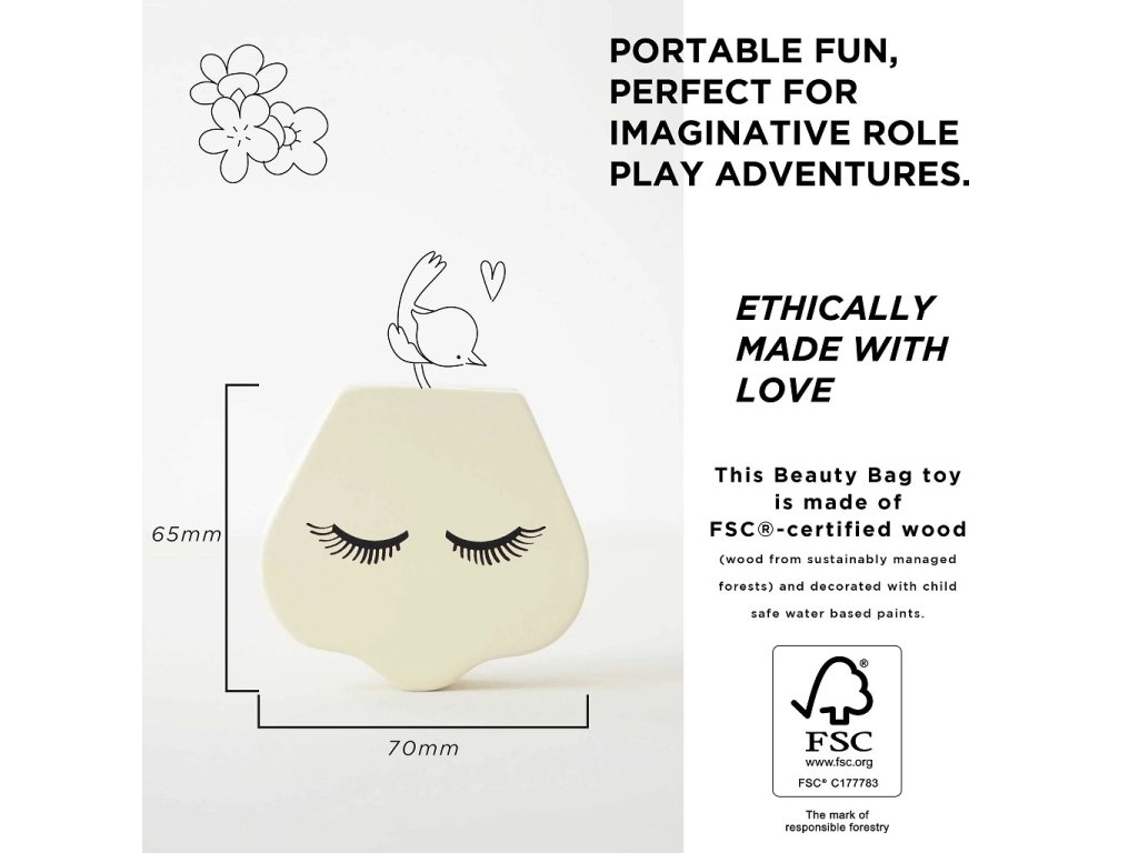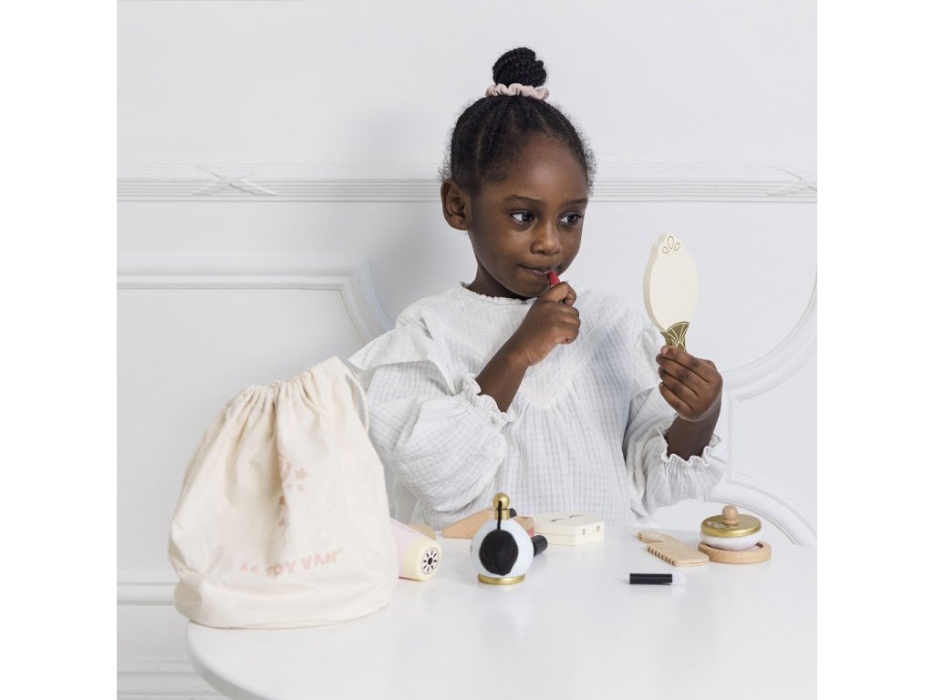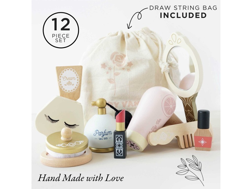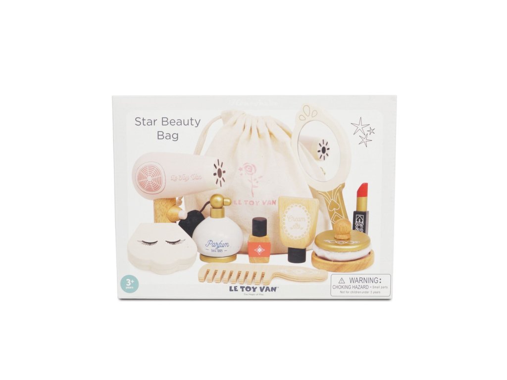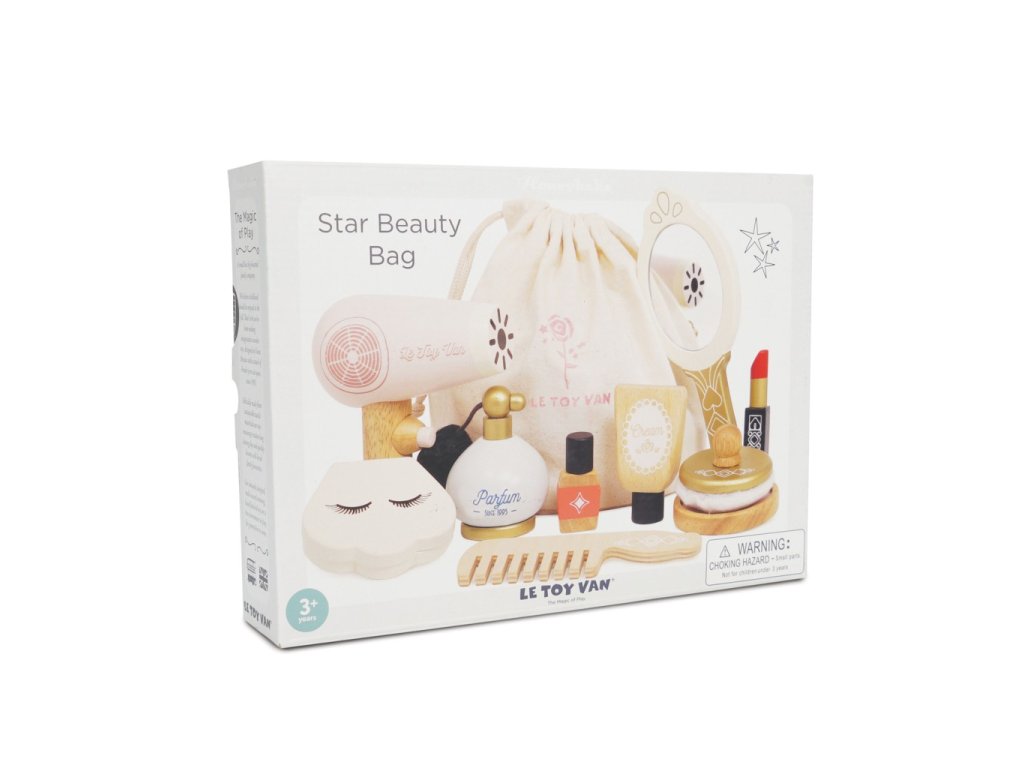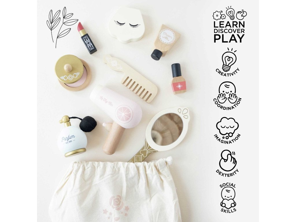 Buďte hviezdami vo vlastnej show! Kozmetickú tašku si zamilujú malé kostymérky a kostyméri, s jej obsahom vytvoria úžasný make-up a účes. Taška je vyrobená z prírodnej bavlny, jej vybavenie je z hladkého a zaobleného dreva, to všetko je ručne maľované netoxickými farbami. Malí vizážisti a vizážistky môžu začať tvoriť svoje dielo. Nechýba krém, očné tiene a aplikátor, púder a labutienka, parfum, rúž, fén, hrebeň, zrkadlo, lak na nechty a štetec, textilné vrecúško. Perfektná hračka pre hru na role je vyrobená z FSC dreva, zdobia ju farby, ktoré sú bezpečné pre deti. Hlavné vlastnosti: taška z prírodnej bavlny, drevené doplnkyFSC drevovyrobené eticky s láskoutestované podľa najprísnejších štandardovmaľované netoxickými farbami na báze vodyinšpiruje k predstavivej hre Honeybake kolekcia: Hračky v tejto kolekcii sú vhodné na objavovanie, pomôžu deťom s rozvojom predstavivosti, sociálnych a verbálnych zručností a kognitívnych funkcií. Tradičný dizajn s modernými detailmi deti určite bude baviť. Honeybake je kolekcia Le Toy Van, ktorá vyhrala najviac ocenení, a to za dizajn, kvalitu, bezpečnosť a tiež za vzdelávaciu a hernú hodnotu. Značka a certifikát FSC® (Forest Stewardship Council) zaručuje, že drevo, z ktorého bol výrobok vyrobený, nebolo vyťažené nelegálne a pochádza z lesov obhospodarovaných šetrným či prírode blízkym spôsobom, v ktorom sú dodržiavané prísne environmentálne a sociálne požiadavky. Značka FSC® na výrobku znamená, že svojim nákupom pomáhate chrániť lesy a podporujete šetrné, zodpovedné či prírode blízke hospodárenie, vďaka ktorému sú naše lesy stabilnejšie, zdravšie, majú prirodzenú druhovú skladbu a lepšie odolávajú negatívnym následkom klimatických zmien.Dodatočné parametre