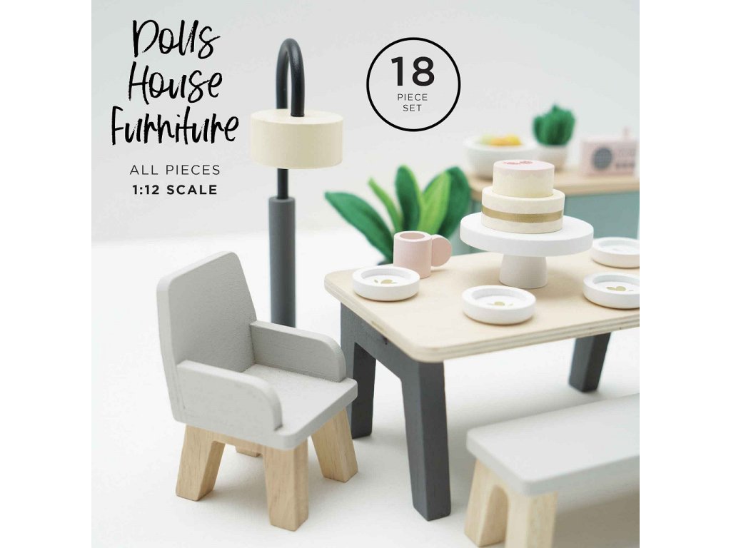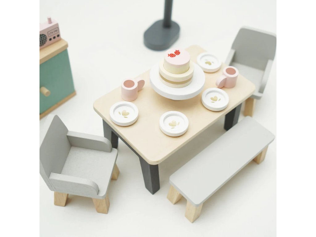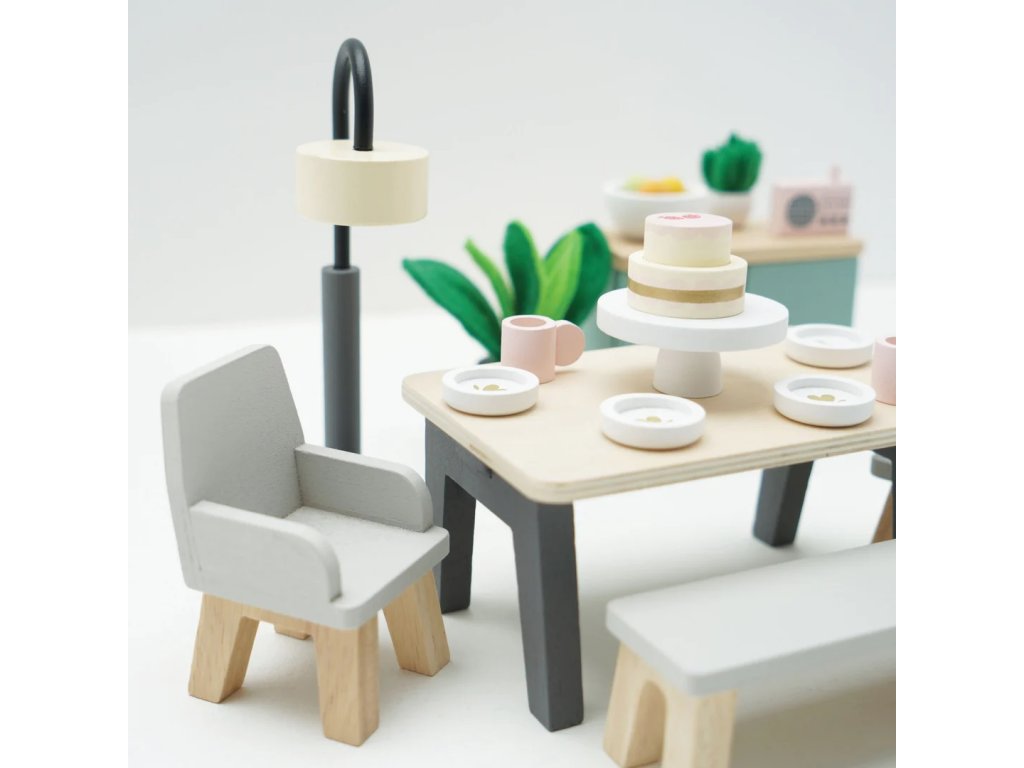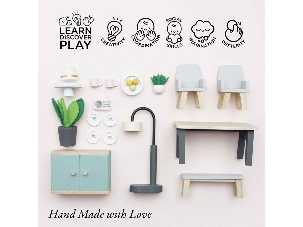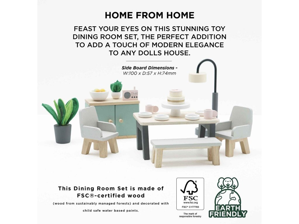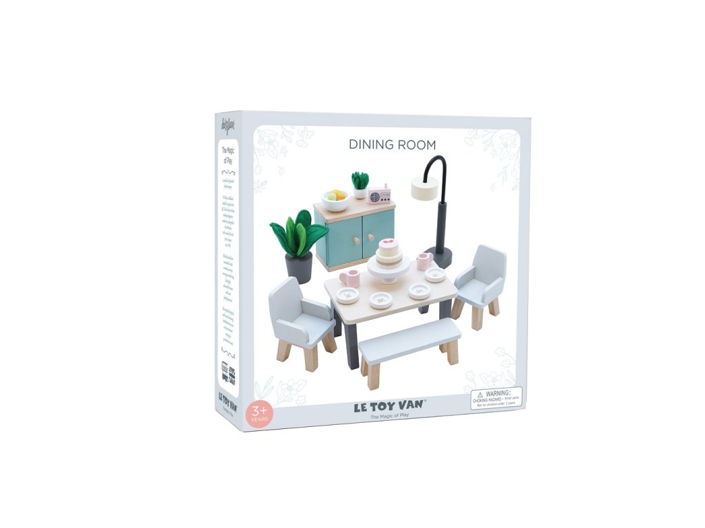 Pokochajte sa týmto úžasným detským jedálenským setom s nádychom modernej elegancie, ktorý je dokonalým doplnkom do každého miniatúrneho domčeka pre bábiky. Štýlová a udržateľná je táto 18dielna sada vyrobená z FSC ® certifikovaného dreva. Drevený stôl s dvoma kreslami a lavicou, dopĺňa voľne stojaca lampa, príborník, 2 rastliny s realistickými plstenými listami, misa na ovocie s dreveným ovocím, rádio, 4 jedálenské taniere s dvoma hrnčekmi a tiež vynikajúca torta naaranžovaná na stojane na pokušenie malých hostí . Táto sada je kompatibilná s naším radom úžasných domčekov pre bábiky. Hračky s účelomVšetky hračky firmy Le Toy Van sú vyrobené s cieľom - aby dlho vydržali. Dizajnované s láskou skúsenými remeselníkmi za použitia etických praktík a udržateľných materiálov, ktoré sú láskavejšie k našej planéte. Hlavné vlastnosti: vybavenie jedálne z radu nábytku Daisylanekompatibilný so všetkými našimi domčekmi Le Toy Van Dollsvytvorte si s týmto setom vlastné príbehyinšpiruje k sociálnej hre, rozvíja komunikačné zručnostidekorované pomocou netoxických farieb na vodnej bázevyrobené s certifikáciou FSC® Daisylane kolekcia: Prestížna kolekcia domčekov pre bábiky a doplnkov firmy Le Toy Van. Pred viac ako 25 rokmi zakladateľ Georges navrhol svoj úplne prvý domček pre bábiky, stavebný kameň tejto firmy. Vyrobené eticky z udržateľných materiálov, drevené domčeky pre bábiky Daisylane sú jedinečné a nebudú detskú predstavivosť držať späť. Rodinné dedičstvo, naozajstná investícia do hrania. Značka a certifikát FSC® (Forest Stewardship Council) zaručuje, že drevo, z ktorého bol výrobok vyrobený, nebolo vyťažené nelegálne a pochádza z lesov obhospodarovaných šetrným či prírode blízkym spôsobom, v ktorom sú dodržiavané prísne environmentálne a sociálne požiadavky. Značka FSC® na výrobku znamená, že svojim nákupom pomáhate chrániť lesy a podporujete šetrné, zodpovedné či prírode blízke hospodárenie, vďaka ktorému sú naše lesy stabilnejšie, zdravšie, majú prirodzenú druhovú skladbu a lepšie odolávajú negatívnym následkom klimatických zmien.Dodatočné parametre