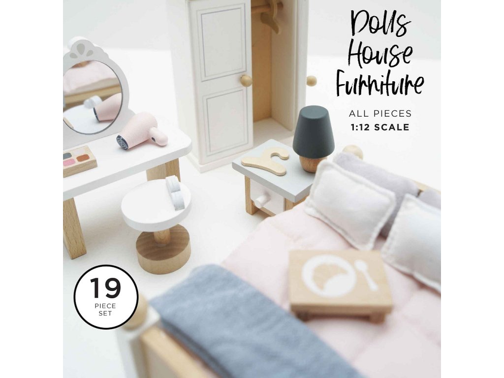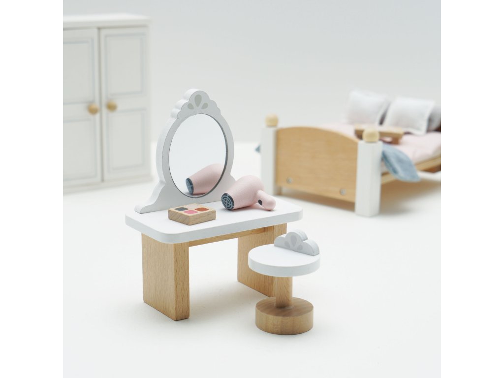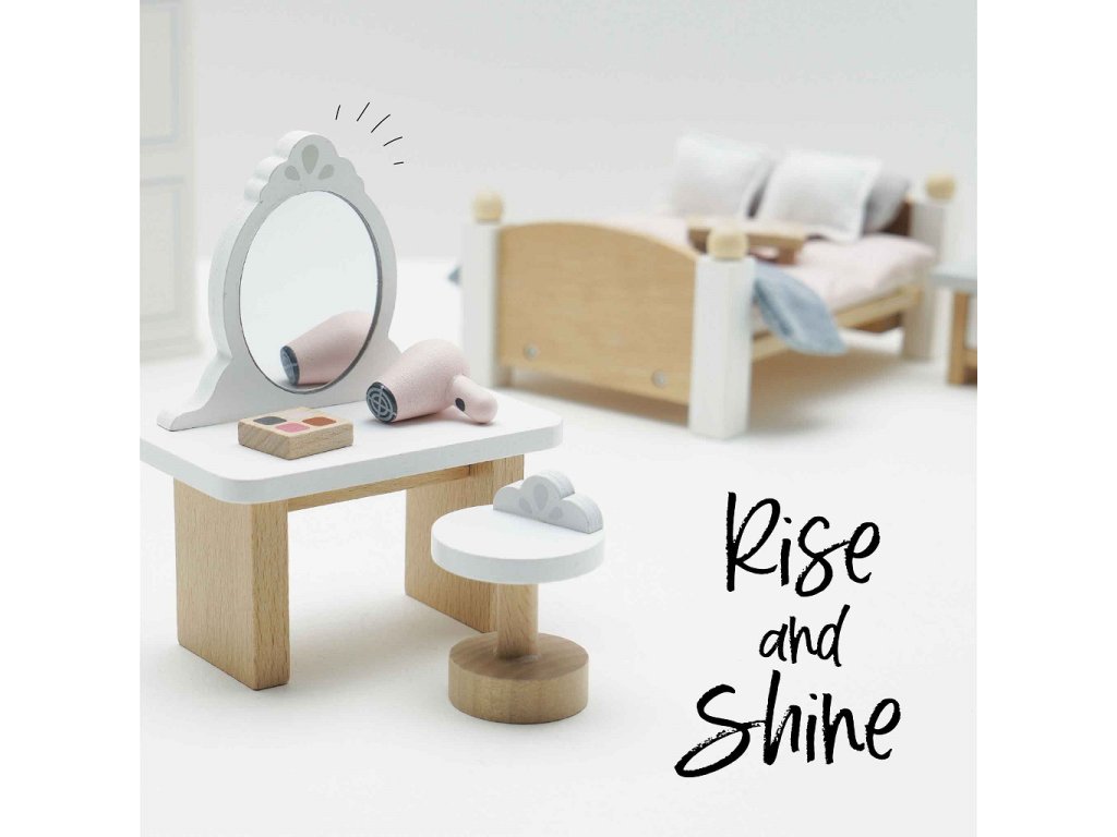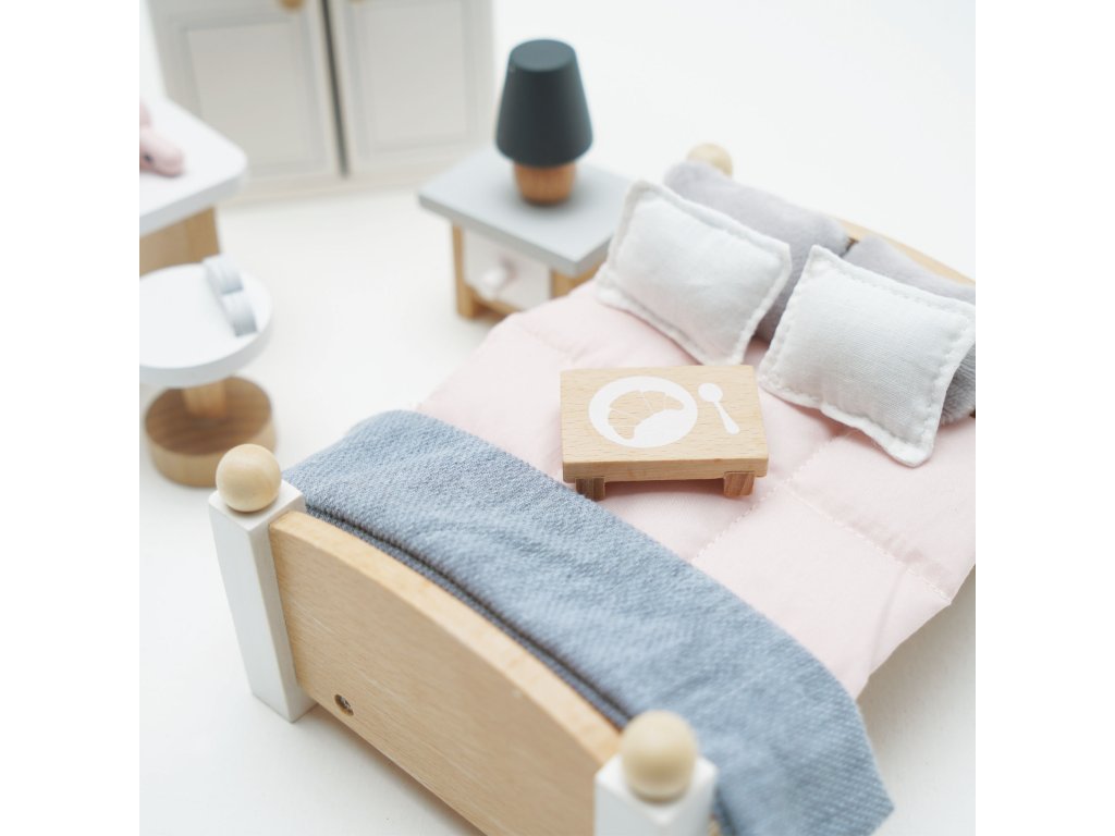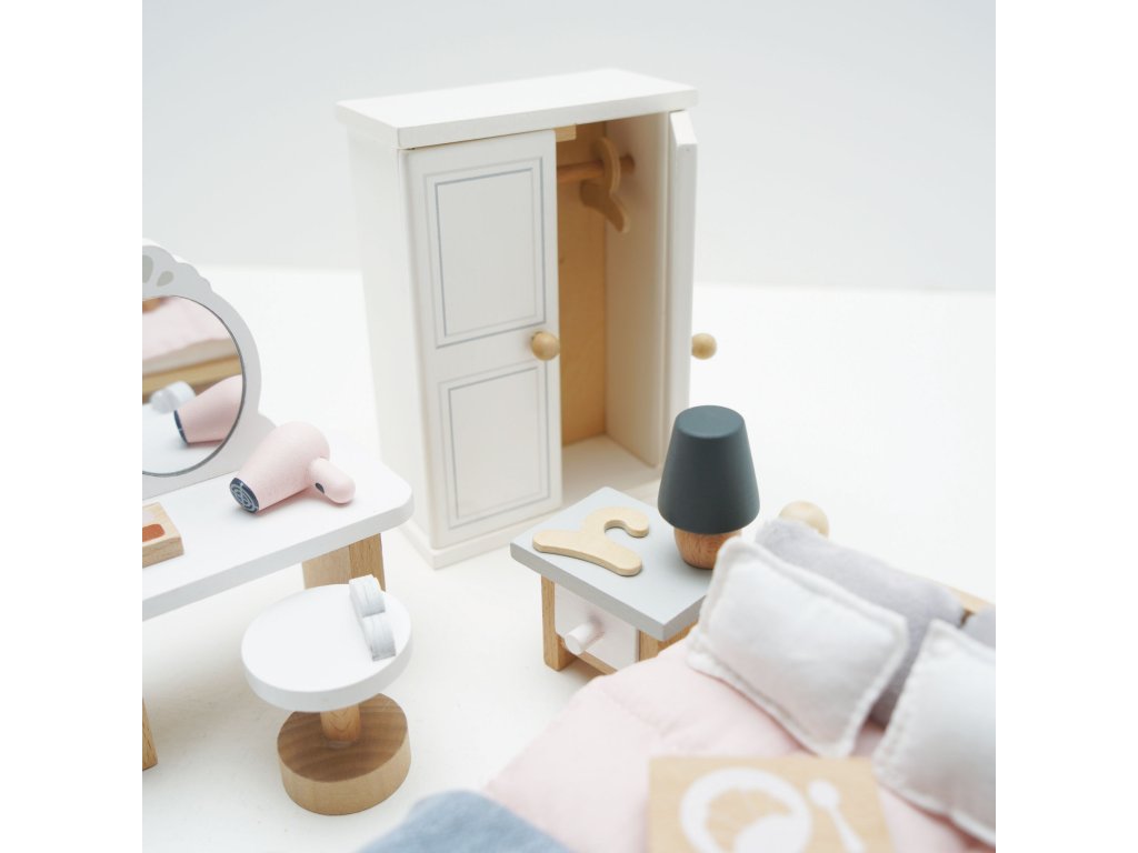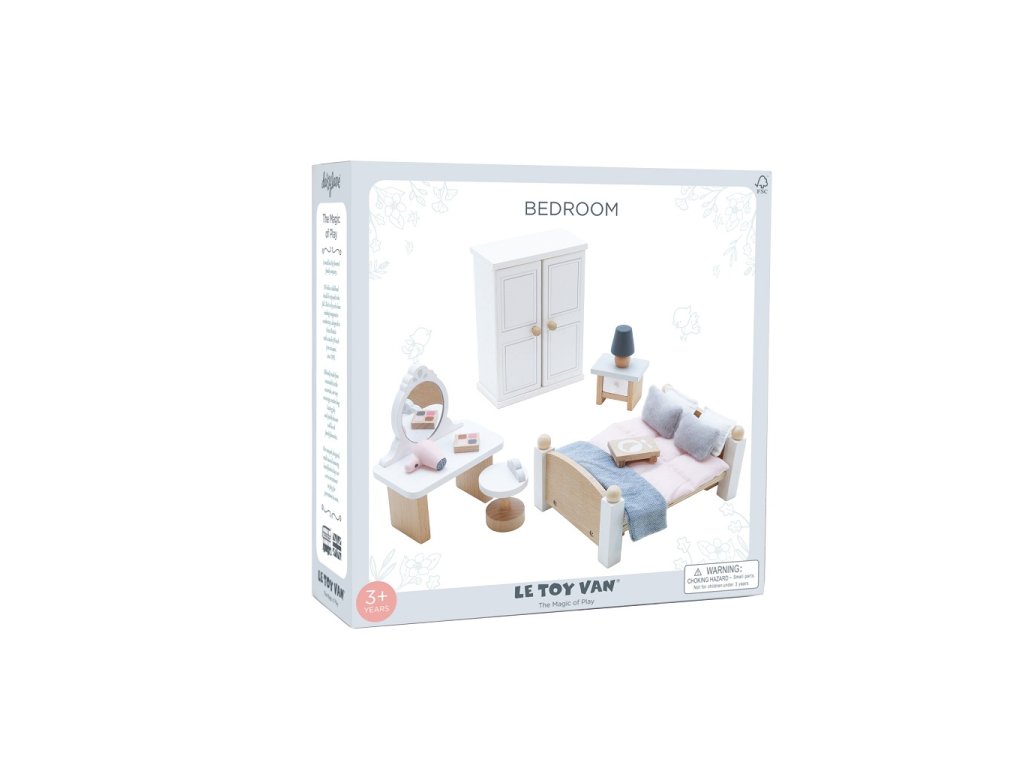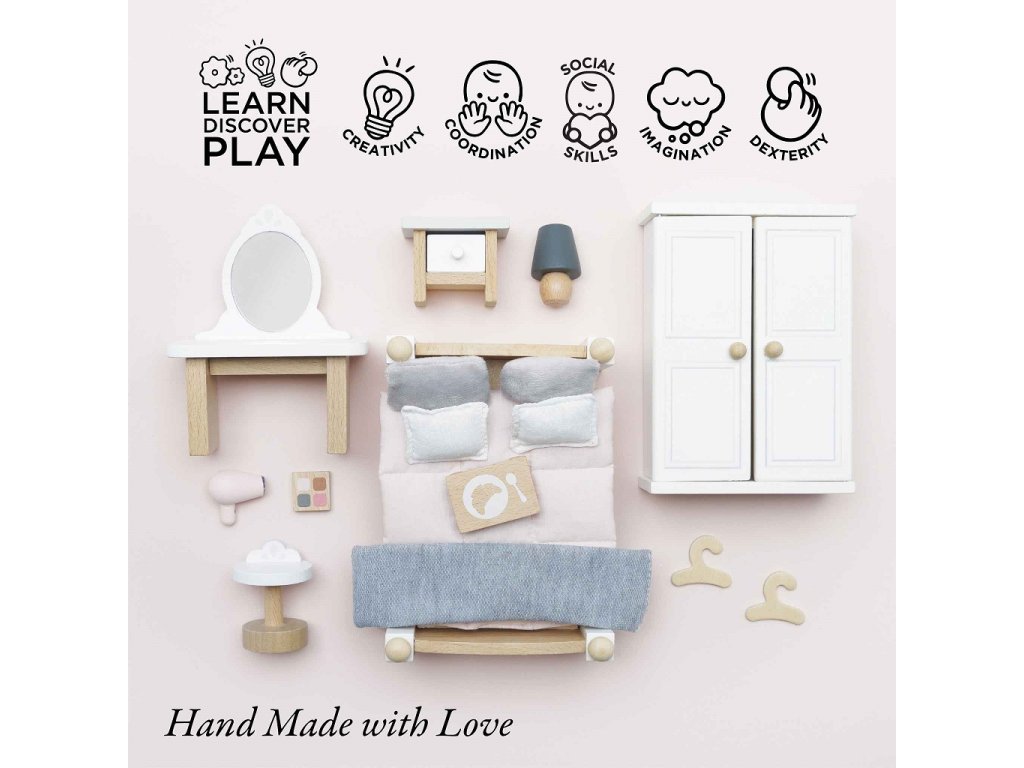 Táto miniatúrna sada do spálne je skutočným splneným snom. S klasickým dizajnom v krásnych neutrálnych tónoch je kompatibilný so všetkými našimi drevenými domčekmi pre bábiky a je úžasným doplnkom každej detskej izby. Pokojný spánok láka vďaka pohodlnej manželskej posteli s útulnou prikrývkou a mäkkými vankúšmi. To všetko doplnené štýlovým prikrývkou a dreveným podnosom na podávanie chutných raňajok v posteli. Nechýba ani šatníková skriňa s vešiakmi na kabáty, nočný stolík s lampičkou a navyše nádherný toaletný stolík, taburet a doplnky. Hlavné vlastnosti: vytvorte si s týmto setom vlastné príbehyinšpiruje k sociálnej hre, rozvíja komunikačné zručnostivyrobené z udržateľného FSC® drevamaľované netoxickými farbami Daisylane kolekcia: Prestížna kolekcia domčekov pre bábiky a doplnkov firmy Le Toy Van. Pred viac ako 25 rokmi zakladateľ Georges navrhol svoj úplne prvý domček pre bábiky, stavebný kameň tejto firmy. Vyrobené eticky z udržateľných materiálov, drevené domčeky pre bábiky Daisylane sú jedinečné a nebudú detskú predstavivosť držať späť. Rodinné dedičstvo, naozajstná investícia do hrania. Značka a certifikát FSC® (Forest Stewardship Council) zaručuje, že drevo, z ktorého bol výrobok vyrobený, nebolo vyťažené nelegálne a pochádza z lesov obhospodarovaných šetrným či prírode blízkym spôsobom, v ktorom sú dodržiavané prísne environmentálne a sociálne požiadavky. Značka FSC® na výrobku znamená, že svojim nákupom pomáhate chrániť lesy a podporujete šetrné, zodpovedné či prírode blízke hospodárenie, vďaka ktorému sú naše lesy stabilnejšie, zdravšie, majú prirodzenú druhovú skladbu a lepšie odolávajú negatívnym následkom klimatických zmien.Dodatočné parametre