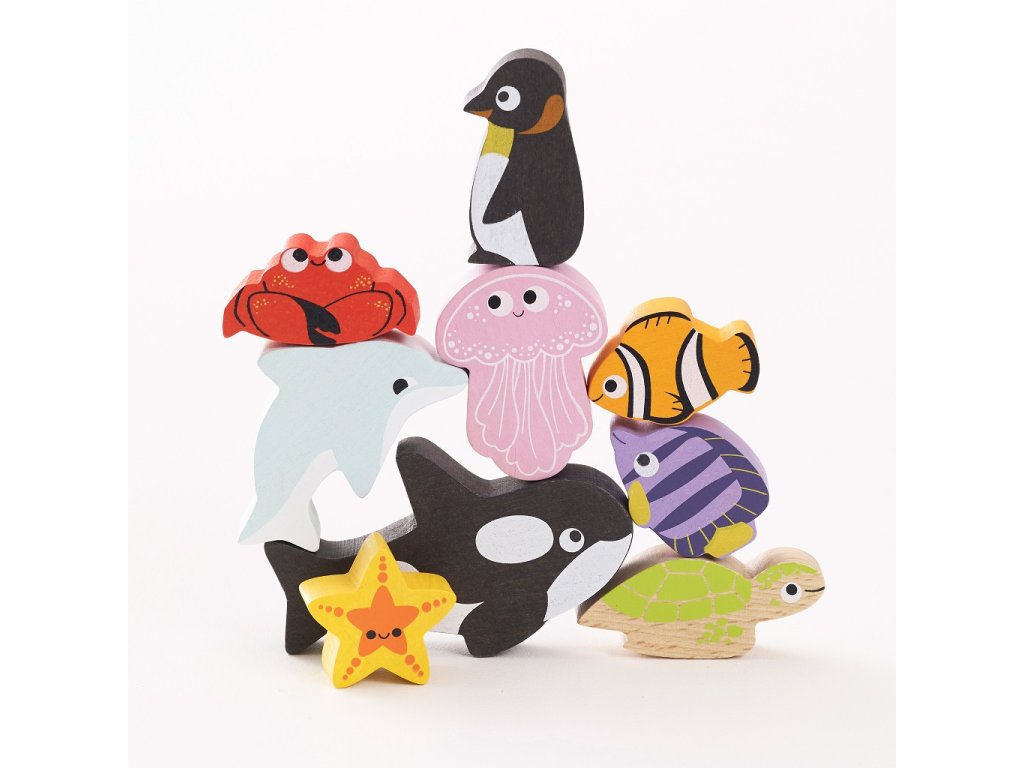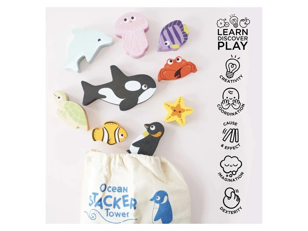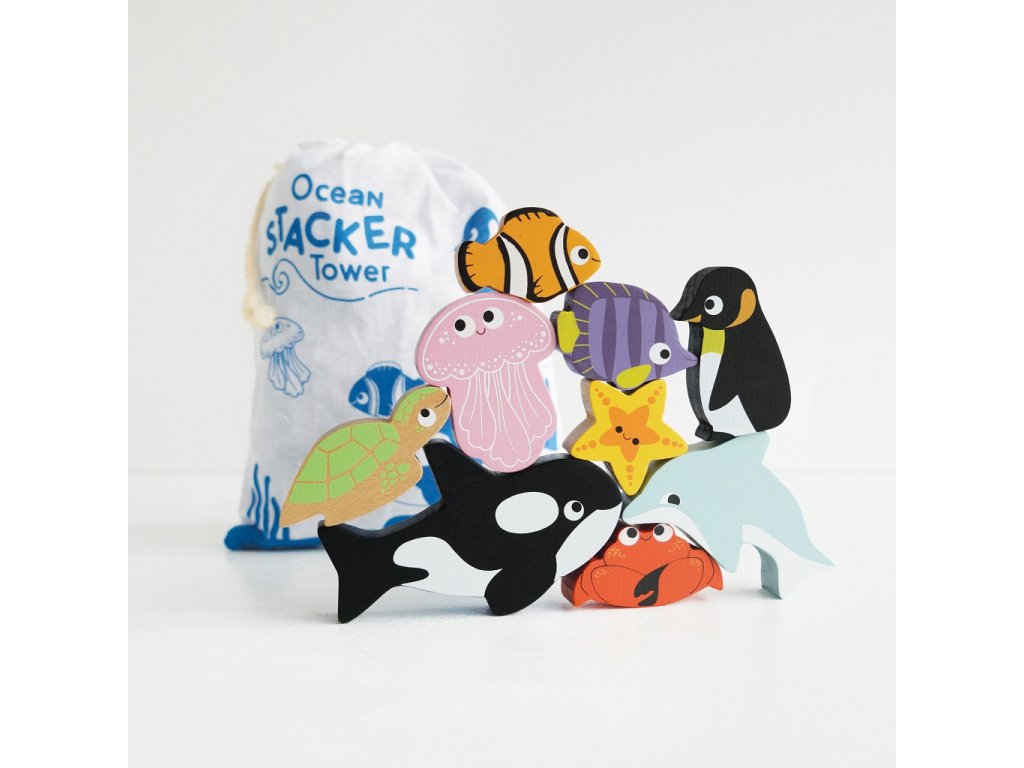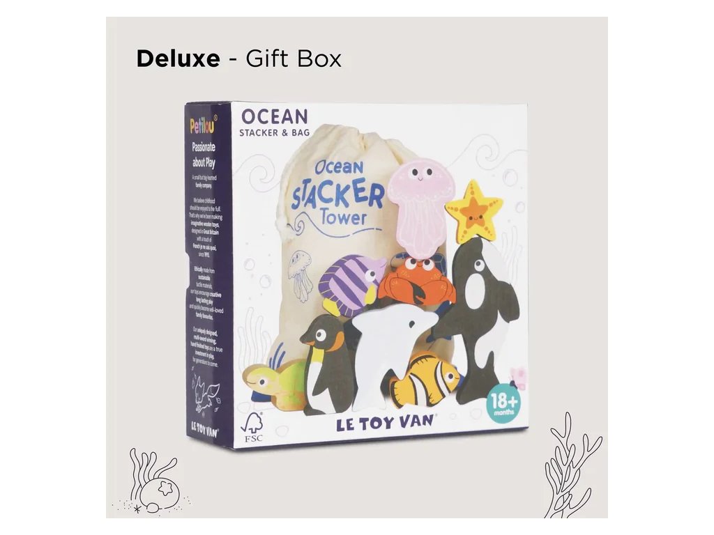 Vitajte v podmorskom svete plnom dobrodružstva! Užite si senzorickú zábavu so skladacou vežou podmorských zvieratiek. Túto udržateľnú hračku si zamilujú aj najmenšie deti, skladajte dieliky na seba a potom sledujte, ako padajú. Maľované netoxickými farbami, ktoré sa neodlupujú. Sada sa skladá z 9 zvieracích dielikov, ktoré majú veľkosť tak akurát pre detské ruky. Veľryba, delfín, hviezdica, tučniak, morská korytnačka, medúza a ďalší morskí priatelia. Deti získajú nové poznatky o oceáne a jeho obyvateľoch, zároveň si precvičia zručnosť a tak dôležitú jemnú motoriku. Hračka je perfektná na cesty, dieliky sú zabalené v bavlnenom vrecúšku.Táto hračka je bez obsahu plastu, cieľom Le Toy Van je zbaviť sa všetkého plastu v obalových materiáloch ich hračiek. Skladacia veža deti inšpiruje k učeniu formou hry, je vyrobená z odolných materiálov skúsenými remeselníkmi, za použitia etických praktík a udržateľných materiálov, ktoré sú láskavejšie k našej planéte. Vyrobené z certifikovaného FSC dreva, dekorované farbami na báze vody, ktoré sú bezpečné pre deti. Hlavné vlastnosti: v balení bavlnené vrecúško a 9 zvieratiek z pevného drevavyrobené z FSC drevabez obsahu plastutestované podľa najprísnejších štandardovmaľované netoxickými farbami na báze vodyzaoblené hranypodporuje pri ranom vývojivhodné pre predstavivú hru Ocenenie hračky: Right Start Toy Award 2021The Veggie Award Finalist 2021Dodatočné parametre