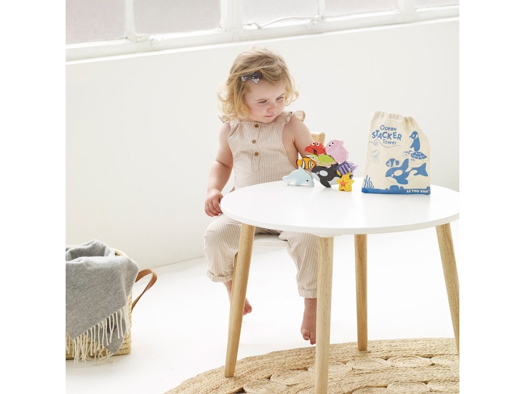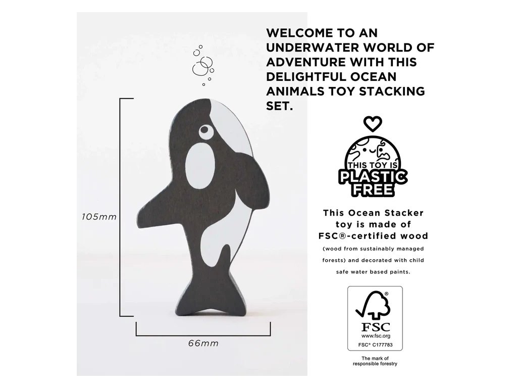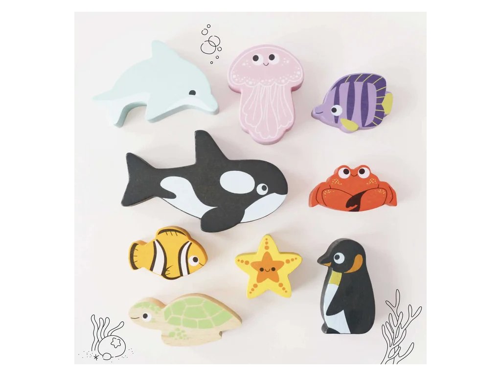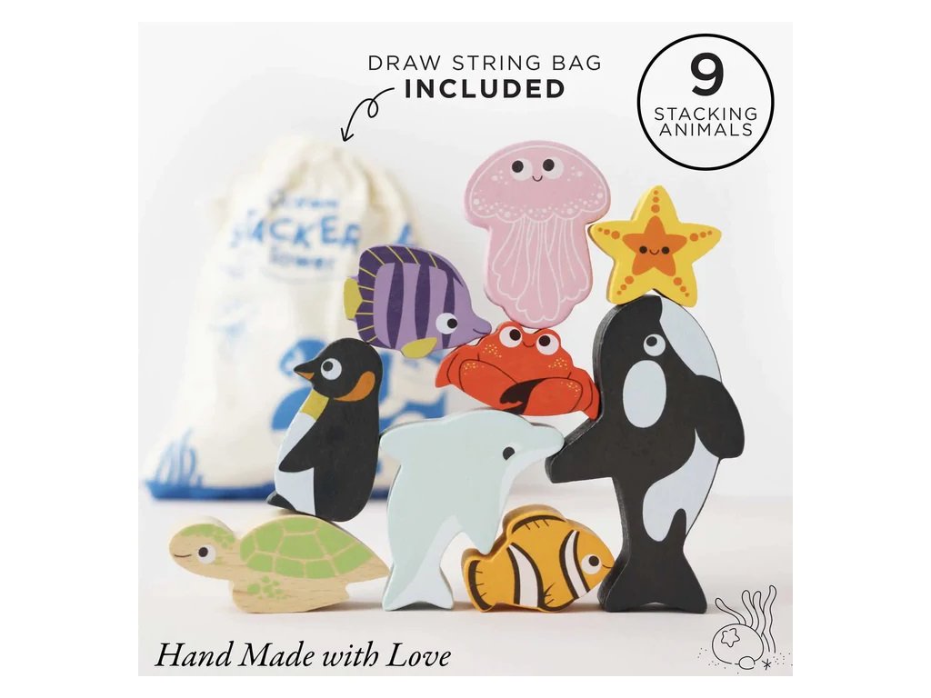 Vitajte v podmorskom svete plnom dobrodružstva! Užite si senzorickú zábavu so skladacou vežou podmorských zvieratiek. Túto udržateľnú hračku si zamilujú aj najmenšie deti, skladajte dieliky na seba a potom sledujte, ako padajú. Maľované netoxickými farbami, ktoré sa neodlupujú. Sada sa skladá z 9 zvieracích dielikov, ktoré majú veľkosť tak akurát pre detské ruky. Veľryba, delfín, hviezdica, tučniak, morská korytnačka, medúza a ďalší morskí priatelia. Deti získajú nové poznatky o oceáne a jeho obyvateľoch, zároveň si precvičia zručnosť a tak dôležitú jemnú motoriku. Hračka je perfektná na cesty, dieliky sú zabalené v bavlnenom vrecúšku.Táto hračka je bez obsahu plastu, cieľom Le Toy Van je zbaviť sa všetkého plastu v obalových materiáloch ich hračiek. Skladacia veža deti inšpiruje k učeniu formou hry, je vyrobená z odolných materiálov skúsenými remeselníkmi, za použitia etických praktík a udržateľných materiálov, ktoré sú láskavejšie k našej planéte. Vyrobené z certifikovaného FSC dreva, dekorované farbami na báze vody, ktoré sú bezpečné pre deti. Hlavné vlastnosti: v balení bavlnené vrecúško a 9 zvieratiek z pevného drevavyrobené z FSC drevabez obsahu plastutestované podľa najprísnejších štandardovmaľované netoxickými farbami na báze vodyzaoblené hranypodporuje pri ranom vývojivhodné pre predstavivú hru Ocenenie hračky: Right Start Toy Award 2021The Veggie Award Finalist 2021Dodatočné parametre