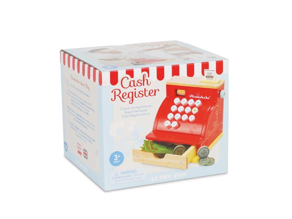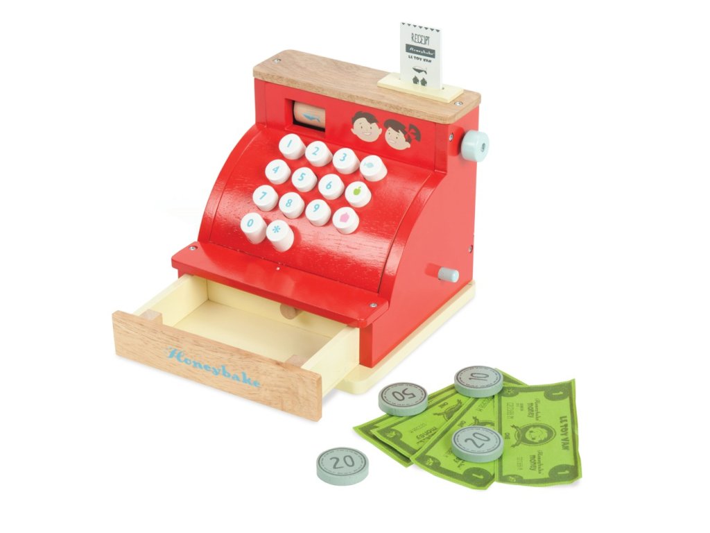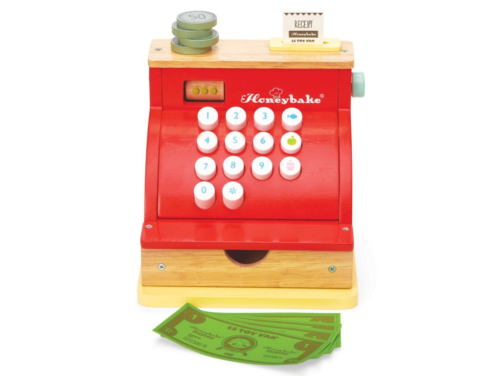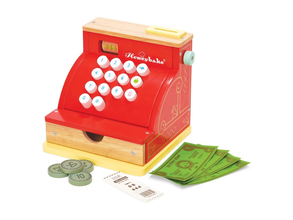 Táto roztomilá pokladňa v retro štýle deti naučí počítať a poznávať číslice zábavnou formou. Jej doplnky sú drevená účtenka, papierové bankovky a drevené mince, šuplík pokladne je možné jednoducho otvoriť. Hračka má vintage design, pestro červenú farbu a zlatisté detaily. Táto edukatívna hračka je vyrobená z odolného a udržateľného dreva, vydrží vám naozaj dlho. Hračky s účelomVšetky hračky firmy Le Toy Van sú vyrobené s cieľom - aby dlho vydržali. Dizajnované s láskou skúsenými remeselníkmi za použití etických praktík a udržateľných materiálov, ktoré sú láskavejšie k našej planéte. Hlavné vlastnosti: vyrobené eticky z udržateľného drevatestované podľa najprísnejších štandardovmaľované netoxickými farbami na báze vodyinšpiruje k predstavivej hrerozvíja kognitívne zručnosti Honeybake kolekcia: Hračky v tejto kolekcii sú vhodné na objavovanie, pomôžu deťom s rozvojom predstavivosti, sociálnych a verbálnych zručností a kognitívnych funkcií. Tradičný dizajn s modernými detailmi deti určite bude baviť. Honeybake je kolekcia Le Toy Van, ktorá vyhrala najviac ocenení, a to za dizajn, kvalitu, bezpečnosť a tiež za vzdelávaciu a hernú hodnotu.Dodatočné parametre