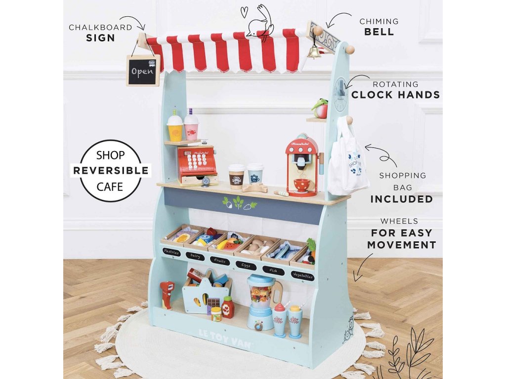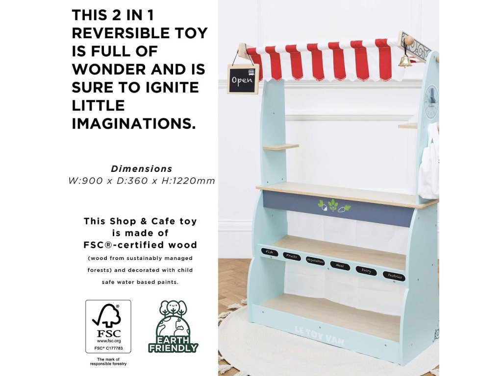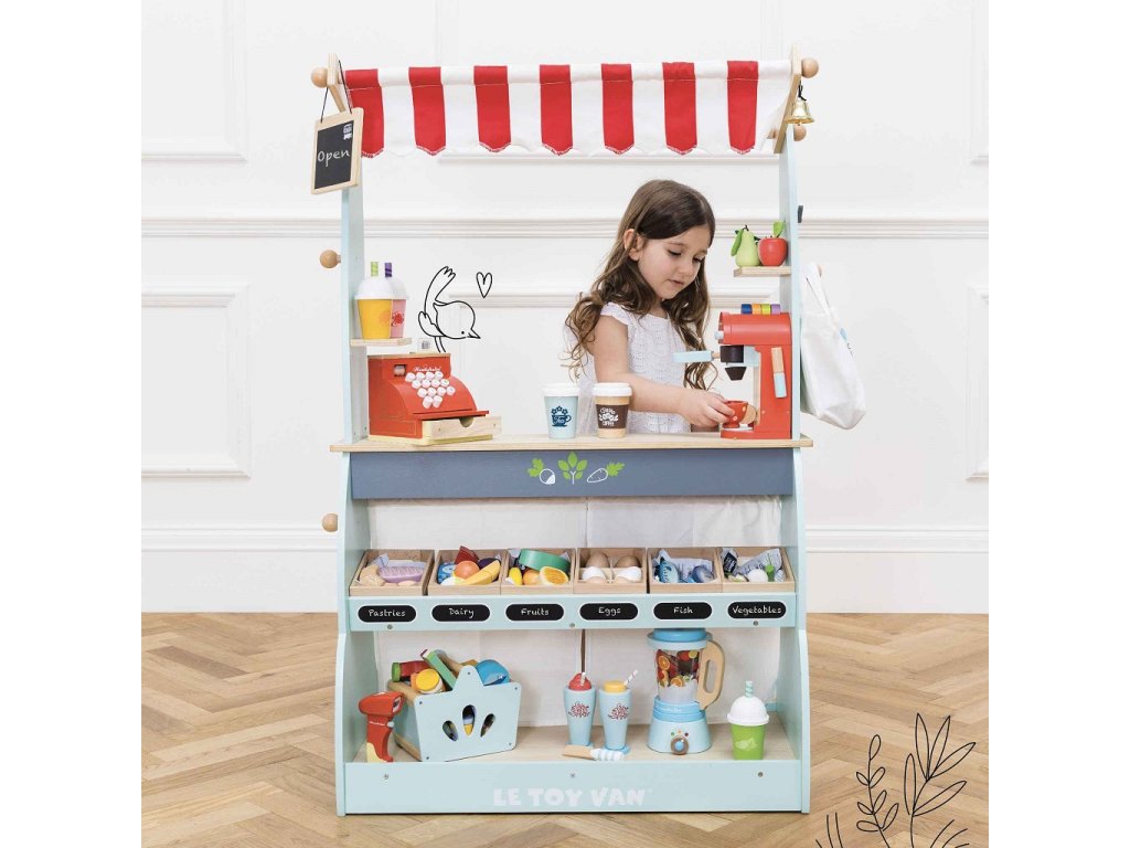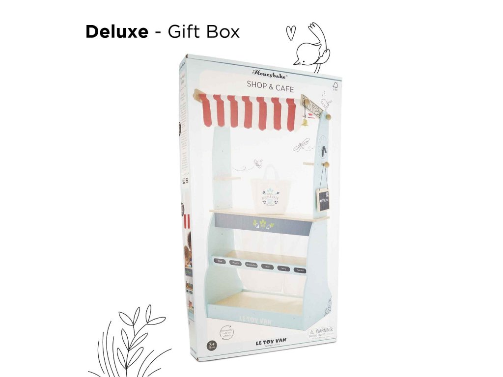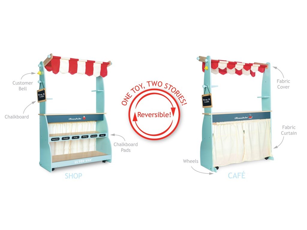 Skvelý a všetkými obľúbený drevený predajný pult vyhral niekoľko ocenení! Deťom poslúži ako obchod aj kaviareň, naozaj záleží len na ich predstavivosti. Pult 2 v 1 stačí otočiť, na jednej strane má predajné police, do ktorých sa zmestia debničky a produkty, na druhej strane priestor vhodný na prípravu a servírovanie horúcich nápojov. Nechýba ani obojstranná tabuľka na kriedu, textilná nákupná taška a zvonček. Deti si pri predstavivej hre precvičia nielen sociálne zručnosti. Možno kombinovať s debničkami s jedlom od Le Toy Van. Hračky s účelomVšetky hračky firmy Le Toy Van sú vyrobené s cieľom - aby dlho vydržali. Dizajnované s láskou skúsenými remeselníkmi za použití etických praktík a udržateľných materiálov, ktoré sú láskavejšie k našej planéte. Hlavné vlastnosti: vyrobené eticky z udržateľného drevatestované podľa najprísnejších štandardovmaľované netoxickými farbami na báze vodyinšpiruje k predstavivej hrerozvíja kognitívne zručnostikolieska pre jednoduchý transport Ocenenia hračky:Junior Design Bronze Award 2017Good Toy Guide RecommendedRight Start Best Toy Award Winner 2017 Honeybake kolekcia: Hračky v tejto kolekcii sú vhodné na objavovanie, pomôžu deťom s rozvojom predstavivosti, sociálnych a verbálnych zručností a kognitívnych funkcií. Tradičný dizajn s modernými detailmi deti určite bude baviť. Honeybake je kolekcia Le Toy Van, ktorá vyhrala najviac ocenení, a to za dizajn, kvalitu, bezpečnosť a tiež za vzdelávaciu a hernú hodnotu.Dodatočné parametre