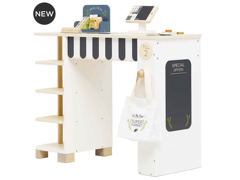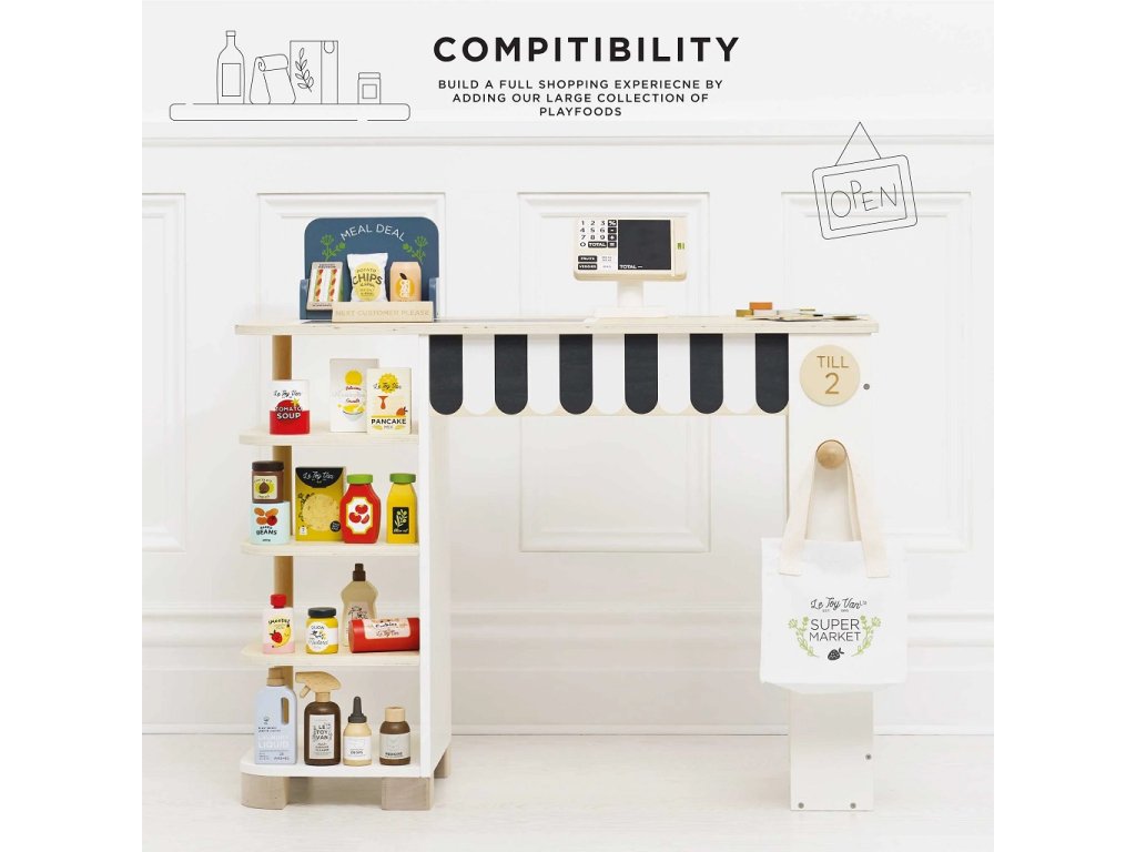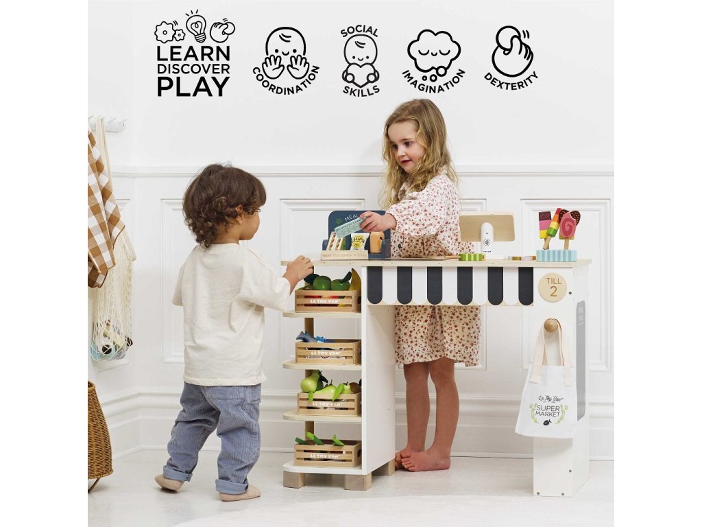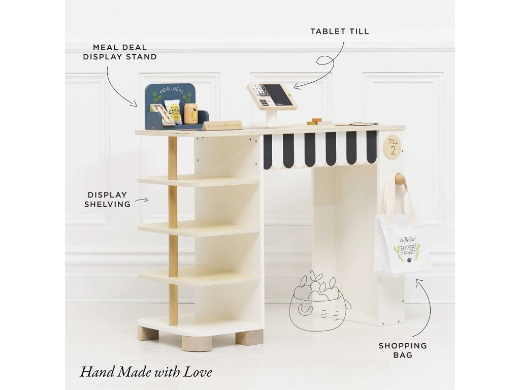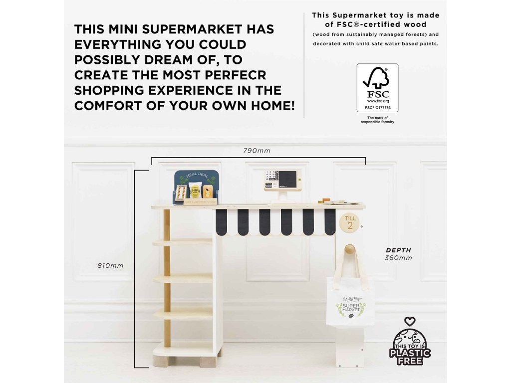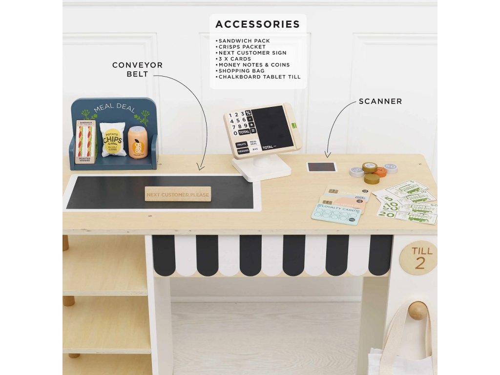 Tento predajný stánok má všetko, čo si len môžete priať, aby ste si v pohodlí domova vytvorili perfektný nákupný zážitok. Súčasťou je regál, na ktorý je možné umiestniť rôzne potraviny. Dodávané s kompletnou sadou realistických potravín obsahujúci napr. osviežujúcu plechovku nápoja, vrecko lupienkov, kečup, horčicu, cestoviny ... čo sľubuje autentický zážitok z nakupovania pre všetkých, ktorí radi nakupujú. Aby bol zážitok ešte zaujímavejší, je tu navyše elegantná pokladňa, ďalej popisovacia tabuľa, pásový dopravník, skener, hracie peniaze, nápis "budúci zákazník", kriedová tabuľa so špeciálnou ponukou, bavlnená "taška na celý život" a platobné, odmenové a vernostné karty . Všetky diely sú vyrobené z udržateľných materiálov, vrátane dreva s certifikáciou FSC a prírodnej bavlny. Súprava je 100% bez plastu. Hračky s účelomVšetky hračky firmy Le Toy Van sú vyrobené s cieľom - aby dlho vydržali. Dizajnované s láskou skúsenými remeselníkmi za použitia etických praktík a udržateľných materiálov, ktoré sú láskavejšie k našej planéte. Hlavné vlastnosti: multifunkčné, rôznorodé využitierozvíja komunikačné a sociálne zručnosti detívyrobené z dreva s certifikáciou FSC®vrátane bohatého príslušenstva100% bez plastu Značka a certifikát FSC® (Forest Stewardship Council) zaručuje, že drevo, z ktorého bol výrobok vyrobený, nebolo vyťažené nelegálne a pochádza z lesov obhospodarovaných šetrným či prírode blízkym spôsobom, v ktorom sú dodržiavané prísne environmentálne a sociálne požiadavky. Značka FSC® na výrobku znamená, že svojim nákupom pomáhate chrániť lesy a podporujete šetrné, zodpovedné či prírode blízke hospodárenie, vďaka ktorému sú naše lesy stabilnejšie, zdravšie, majú prirodzenú druhovú skladbu a lepšie odolávajú negatívnym následkom klimatických zmien. Honeybake kolekcia: Hračky v tejto kolekcii sú vhodné na objavovanie, pomôžu deťom s rozvojom predstavivosti, sociálnych a verbálnych zručností a kognitívnych funkcií. Tradičný dizajn s modernými detailmi deti určite bude baviť. Honeybake je kolekcia Le Toy Van, ktorá vyhrala najviac ocenení, a to za dizajn, kvalitu, bezpečnosť a tiež za vzdelávaciu a hernú hodnotu.Dodatočné parametre