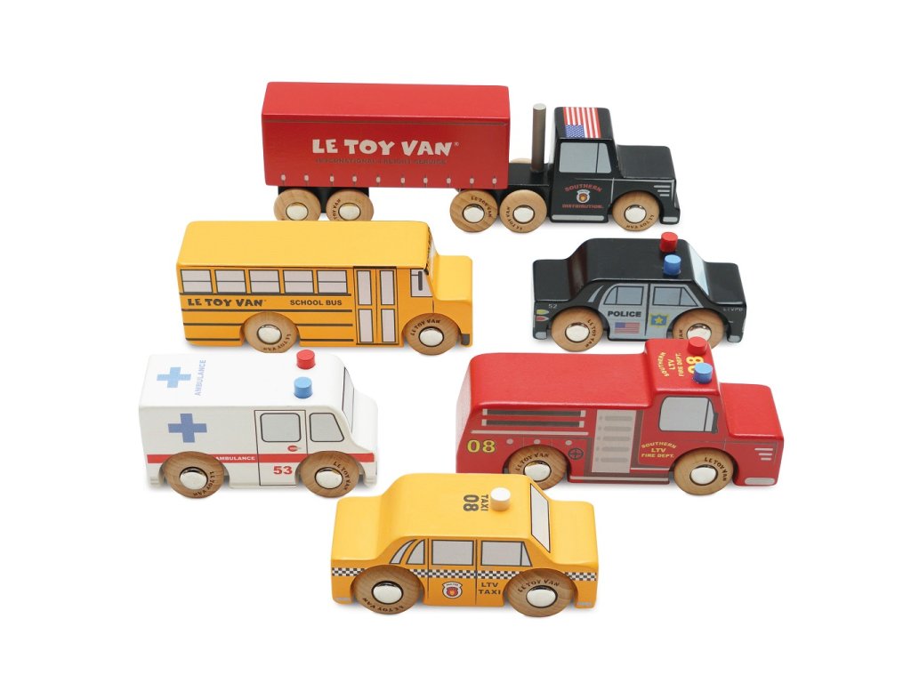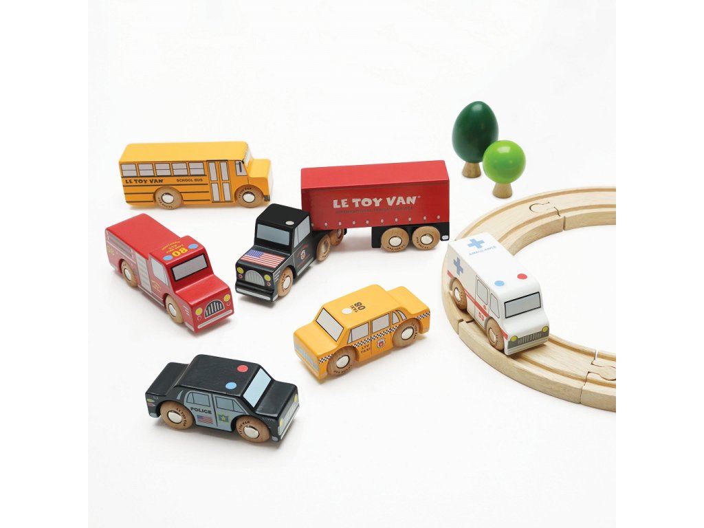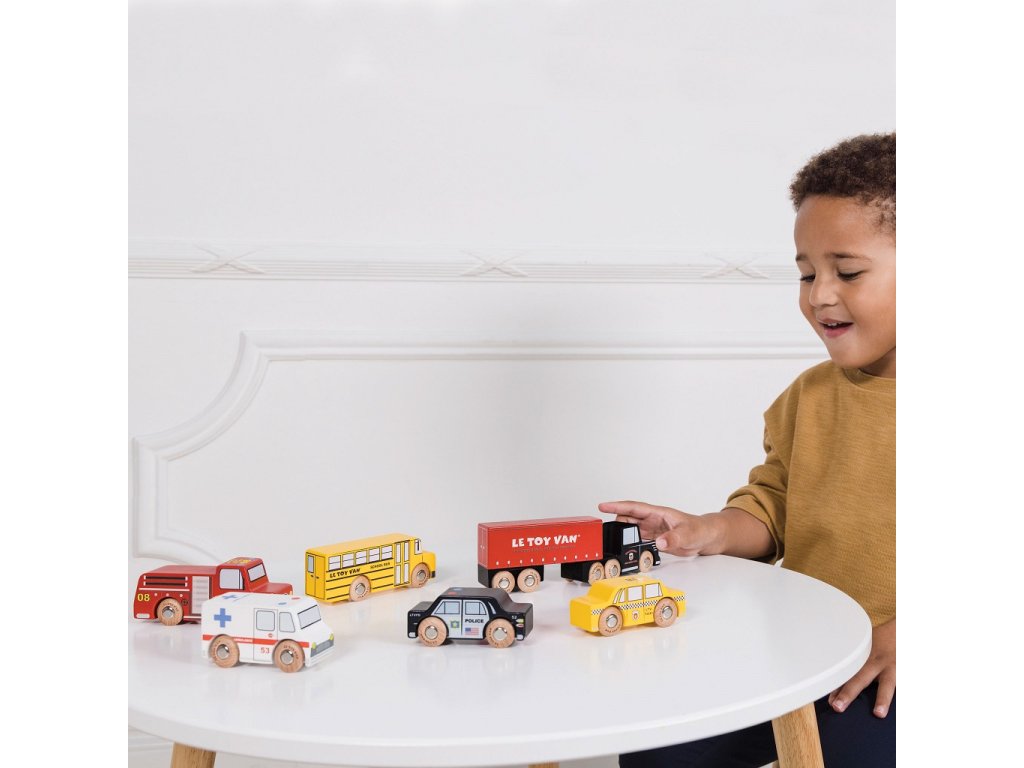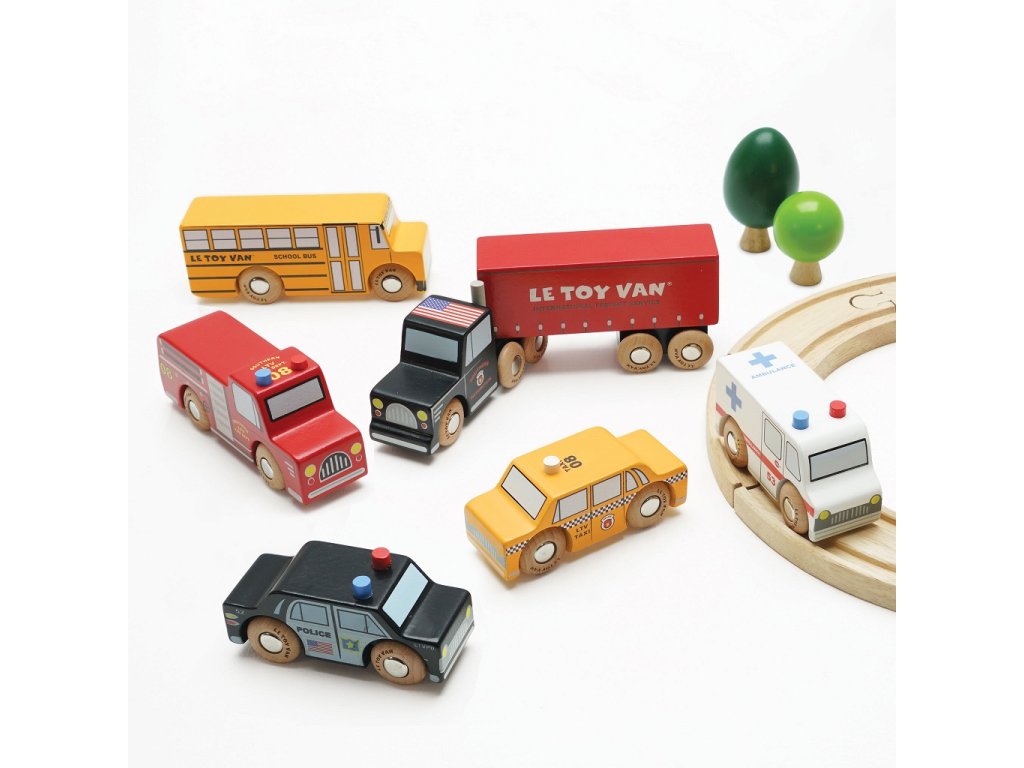 Týchto šesť drevených ikonických autíčok z USA deti určite inšpiruje k predstavivej hre. Vozidlá sú vyrobené z odolného a udržateľného kaučukového dreva, deti si pri hre môžu vytvárať vlastné príbehy, taktiež si potrénujú zručnosť a jemnú motoriku. V balení kĺbové nákladné auto s desiatimi kolesami, žltý školský autobus, policajné auto, žltý taxík, sanitka a hasičské auto. Kompatibilné s drevenými garážami a vláčikodráhrami Le Toy Van, taktiež s vláčikodráhami iných značiek. Hračky s účelomVšetky hračky firmy Le Toy Van sú vyrobené s cieľom - aby dlho vydržali. Dizajnované s láskou skúsenými remeselníkmi za použití etických praktík a udržateľných materiálov, ktoré sú láskavejšie k našej planéte. Hlavné vlastnosti: vyrobené eticky z udržateľného drevatestované podľa najprísnejších štandardovmaľované netoxickými farbami na báze vodyinšpiruje k predstavivej hrerozvíja kognitívne zručnosti Autá & stavby: Stavebná a motorická kolekcia Le Toy Van, ktorá vyhrala mnoho ocenení. Presnejšie zatiaľ cez 15 ocenení za predstavivé autá a stavebné hračky. Podporujú detskú fantáziu, sú ideálne k predstavivej hre, rozvíjajú kreativitu a hravo zlepšujú detskú koordináciu ruka‑oko. Značka a certifikát FSC® (Forest Stewardship Council) zaručuje, že drevo, z ktorého bol výrobok vyrobený, nebolo vyťažené nelegálne a pochádza z lesov obhospodarovaných šetrným či prírode blízkym spôsobom, v ktorom sú dodržiavané prísne environmentálne a sociálne požiadavky. Značka FSC® na výrobku znamená, že svojim nákupom pomáhate chrániť lesy a podporujete šetrné, zodpovedné či prírode blízke hospodárenie, vďaka ktorému sú naše lesy stabilnejšie, zdravšie, majú prirodzenú druhovú skladbu a lepšie odolávajú negatívnym následkom klimatických zmien.Dodatočné parametre