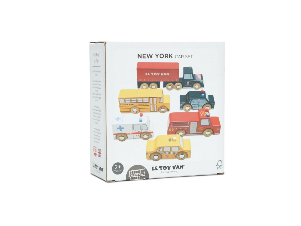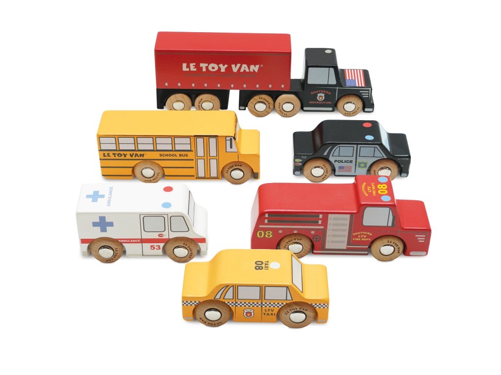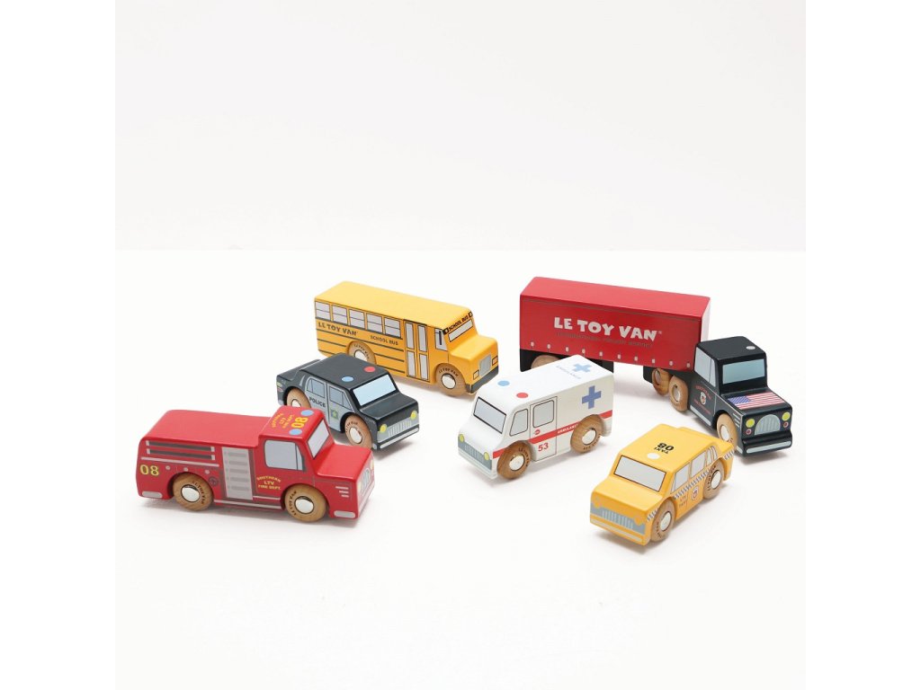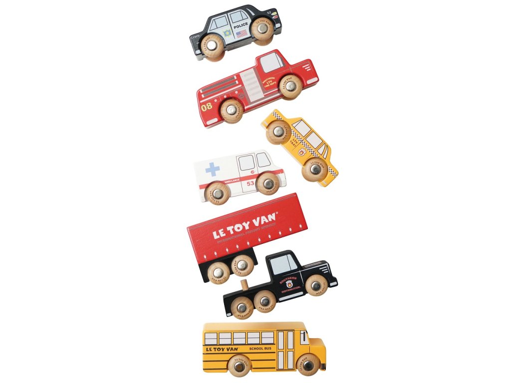 Týchto šesť drevených ikonických autíčok z USA deti určite inšpiruje k predstavivej hre. Vozidlá sú vyrobené z odolného a udržateľného kaučukového dreva, deti si pri hre môžu vytvárať vlastné príbehy, taktiež si potrénujú zručnosť a jemnú motoriku. V balení kĺbové nákladné auto s desiatimi kolesami, žltý školský autobus, policajné auto, žltý taxík, sanitka a hasičské auto. Kompatibilné s drevenými garážami a vláčikodráhrami Le Toy Van, taktiež s vláčikodráhami iných značiek. Hračky s účelomVšetky hračky firmy Le Toy Van sú vyrobené s cieľom - aby dlho vydržali. Dizajnované s láskou skúsenými remeselníkmi za použití etických praktík a udržateľných materiálov, ktoré sú láskavejšie k našej planéte. Hlavné vlastnosti: vyrobené eticky z udržateľného drevatestované podľa najprísnejších štandardovmaľované netoxickými farbami na báze vodyinšpiruje k predstavivej hrerozvíja kognitívne zručnosti Autá & stavby: Stavebná a motorická kolekcia Le Toy Van, ktorá vyhrala mnoho ocenení. Presnejšie zatiaľ cez 15 ocenení za predstavivé autá a stavebné hračky. Podporujú detskú fantáziu, sú ideálne k predstavivej hre, rozvíjajú kreativitu a hravo zlepšujú detskú koordináciu ruka‑oko. Značka a certifikát FSC® (Forest Stewardship Council) zaručuje, že drevo, z ktorého bol výrobok vyrobený, nebolo vyťažené nelegálne a pochádza z lesov obhospodarovaných šetrným či prírode blízkym spôsobom, v ktorom sú dodržiavané prísne environmentálne a sociálne požiadavky. Značka FSC® na výrobku znamená, že svojim nákupom pomáhate chrániť lesy a podporujete šetrné, zodpovedné či prírode blízke hospodárenie, vďaka ktorému sú naše lesy stabilnejšie, zdravšie, majú prirodzenú druhovú skladbu a lepšie odolávajú negatívnym následkom klimatických zmien.Dodatočné parametre