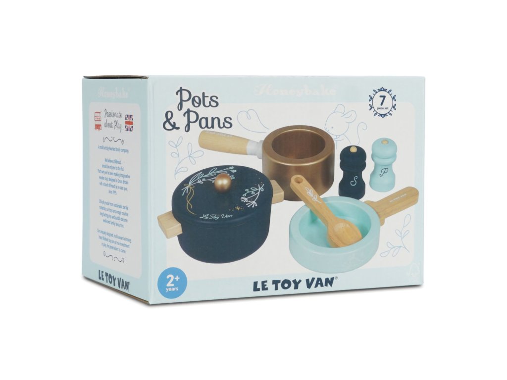 Sada riadu pre mladých začínajúcich kuchárov a kuchárky. Predstavivé dobroty môžu uvariť vo veľkom hrnci s pokrievkou, hrncami s rukoväťou a panvičke. Ďalšími doplnkami sady sú vareška, soľnička a korenička. Hračka je vyrobená z udržateľného masívneho dreva, maľovaná ručne netoxickými farbami na báze vody. Vhodné aj ako doplnok detských kuchyniek. Hračky s účelomVšetky hračky firmy Le Toy Van sú vyrobené s cieľom - aby dlho vydržali. Dizajnované s láskou skúsenými remeselníkmi za použití etických praktík a udržateľných materiálov, ktoré sú láskavejšie k našej planéte. Hlavné vlastnosti: vyrobené eticky z udržateľného drevatestované podľa najprísnejších štandardovmaľované netoxickými farbami na báze vodyinšpiruje k predstavivej hrerozvíja kognitívne zručnosti Honeybake kolekcia: Hračky v tejto kolekcii sú vhodné na objavovanie, pomôžu deťom s rozvojom predstavivosti, sociálnych a verbálnych zručností a kognitívnych funkcií. Tradičný dizajn s modernými detailmi deti určite bude baviť. Honeybake je kolekcia Le Toy Van, ktorá vyhrala najviac ocenení, a to za dizajn, kvalitu, bezpečnosť a tiež za vzdelávaciu a hernú hodnotu. Značka a certifikát FSC® (Forest Stewardship Council) zaručuje, že drevo, z ktorého bol výrobok vyrobený, nebolo vyťažené nelegálne a pochádza z lesov obhospodarovaných šetrným či prírode blízkym spôsobom, v ktorom sú dodržiavané prísne environmentálne a sociálne požiadavky. Značka FSC® na výrobku znamená, že svojim nákupom pomáhate chrániť lesy a podporujete šetrné, zodpovedné či prírode blízke hospodárenie, vďaka ktorému sú naše lesy stabilnejšie, zdravšie, majú prirodzenú druhovú skladbu a lepšie odolávajú negatívnym následkom klimatických zmien.Dodatočné parametre