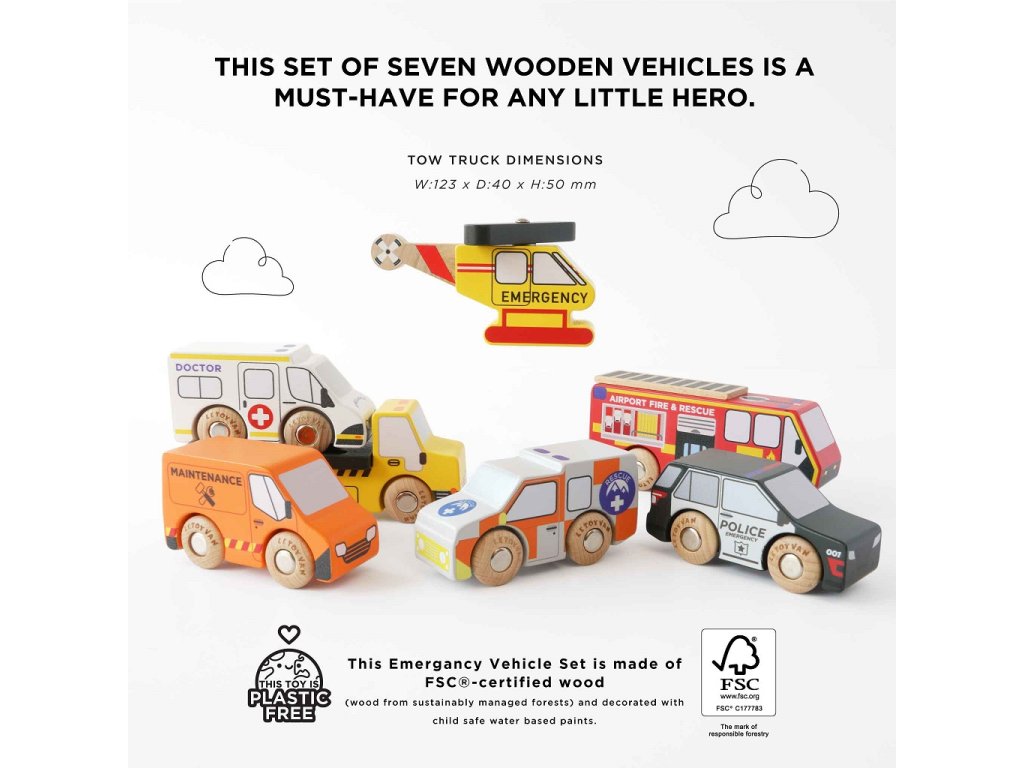 Táto sada 7 záchranných drevených vozidiel s certifikáciou FSC® je vyrobená z vysoko kvalitného dreva. Detailne prepracovaná sada obsahuje záchranársky vrtuľník s otáčajúcou sa vrtuľou, dodávku horskej služby, sanitku lekárov, dodávku údržby, letiskové hasičské, policajné a odťahové vozidlo, ktoré pojme jedno pokazené auto. Súprava je navrhnutá tak, aby podporila fantáziu detí ku kreatívnej hre a tiež pomohla rozvíjať kognitívne zručnosti, zručnosť a koordináciu ruka – oko. Hračka je zdobená netoxickými farbami odolnými proti odštiepeniu farby. Hračky s účelomVšetky hračky firmy Le Toy Van sú vyrobené s cieľom - aby dlho vydržali. Dizajnované s láskou skúsenými remeselníkmi za použitia etických praktík a udržateľných materiálov, ktoré sú láskavejšie k našej planéte. Hlavné vlastnosti: sada 7 drevených dopravných vozidielpomáha s rozvojom predstavivosti, reči a sociálnych zručnostívyrobené z dreva s certifikátom FSC®maľované netoxickými farbami s mnohými detailmitestované podľa najprísnejších štandardov pre vek 2 rok+hračka bez plastov Značka a certifikát FSC® (Forest Stewardship Council) zaručuje, že drevo, z ktorého bol výrobok vyrobený, nebolo vyťažené nelegálne a pochádza z lesov obhospodarovaných šetrným či prírode blízkym spôsobom, v ktorom sú dodržiavané prísne environmentálne a sociálne požiadavky. Značka FSC® na výrobku znamená, že svojim nákupom pomáhate chrániť lesy a podporujete šetrné, zodpovedné či prírode blízke hospodárenie, vďaka ktorému sú naše lesy stabilnejšie, zdravšie, majú prirodzenú druhovú skladbu a lepšie odolávajú negatívnym následkom klimatických zmien.Dodatočné parametre