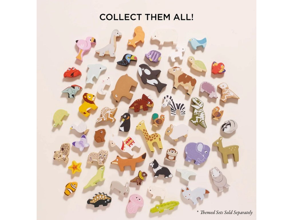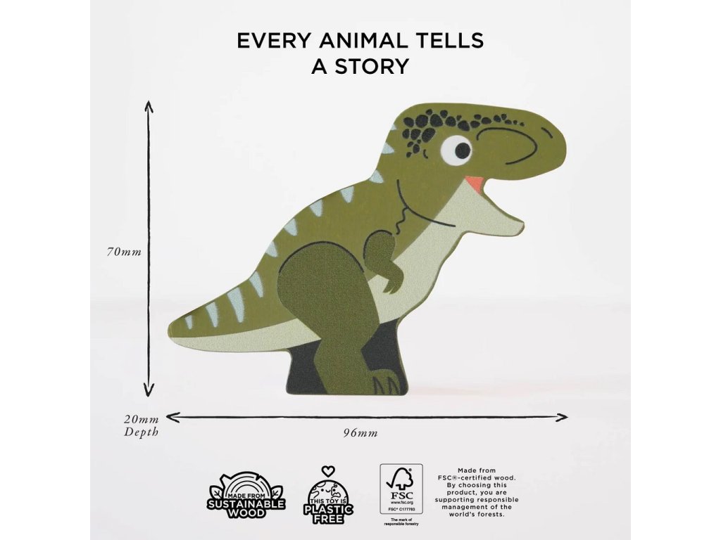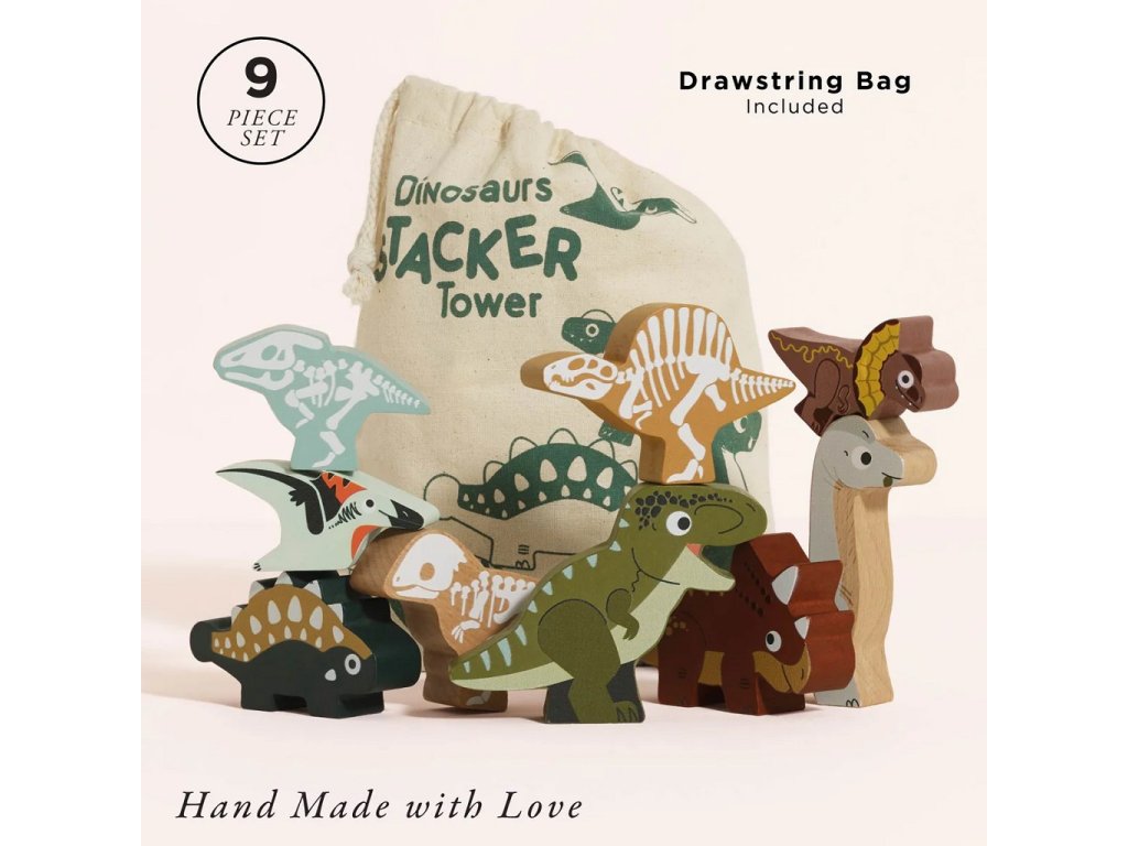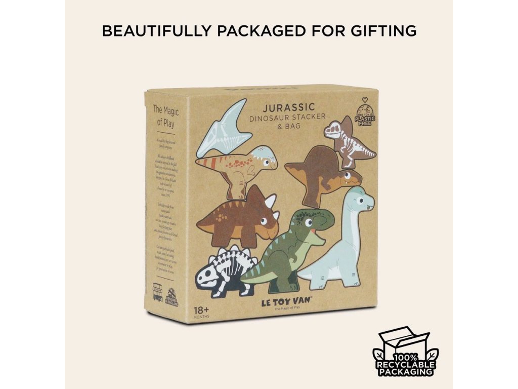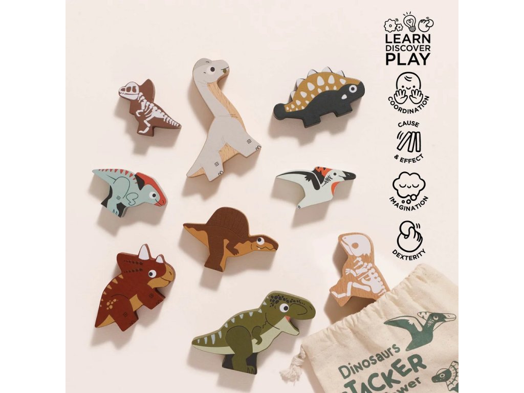 Dinosaury si deti môžu len tak rozložiť vedľa seba alebo ich rôzne skladať na seba do výšky. Vďaka jedinečnému dizajnu deti uvidia, ako dinosaury vyzerali zvonku ale aj akú mali kostru. Figúrky majú totiž z každej strany iný obrázok. Súčasťou sady je aj praktická plátená taška na uloženie figúrok. Figúrky sú vyrobené z dreva s certifikáciou FSC® (drevo z lesov obhospodarovaných udržateľným spôsobom) a ozdobené farbami na vodnej báze bezpečnými pre deti.
