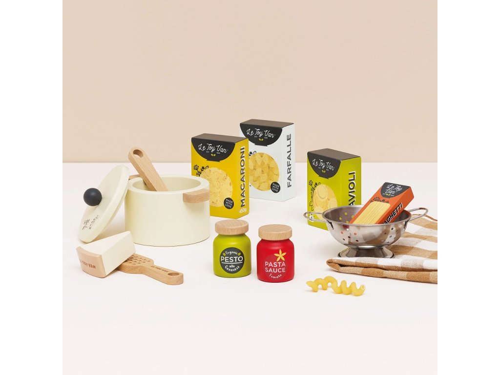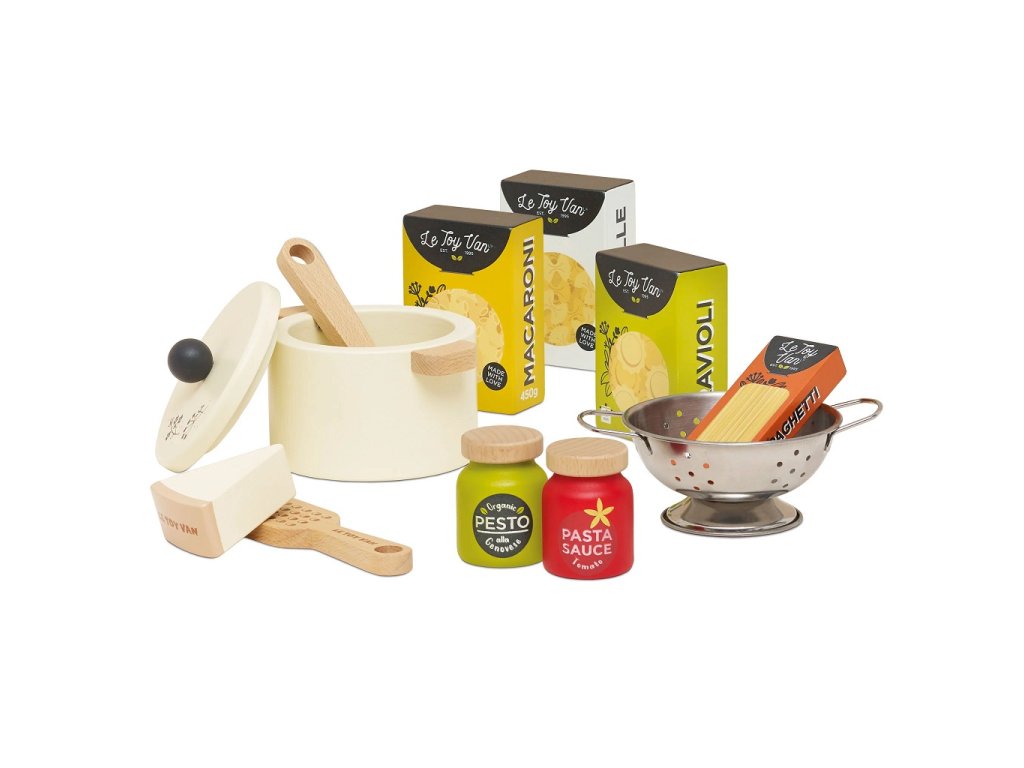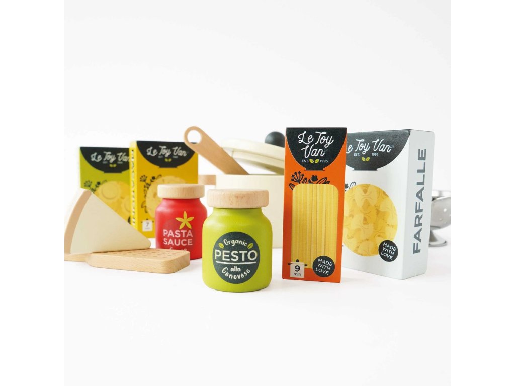 Predstavujeme súpravu cestovín pre malých nadšených kuchárov. Táto súprava obsahuje všetko, čo potrebujete na prípravu dokonalého talianskeho jedla. Súprava obsahuje hrniec s pokrievkou, kovový cedník, strúhadlo na syr a hrniec na varenie, ale nájdete v nej aj rôzne krabičky na cestoviny, nádobky na omáčku a nesmieme zabudnúť na parmezán. Podporuje rozvoj sociálnych zručností, inšpiruje k nápaditej hre a pomáha zdokonaľovať jemnú motoriku. Vyrobené z dreva s certifikátom FSC® (z udržateľne obhospodarovaných lesov), zdobené netoxickými farbami na vodnej báze, ktoré sú pre deti bezpečné. Hračky s cieľomVšetky hračky Le Toy Van sú vyrobené s určitým cieľom - aby dlho vydržali. Navrhnuté s láskou zručnými remeselníkmi s použitím etických postupov a udržateľných materiálov, ktoré sú šetrnejšie k našej planéte. Kľúčové vlastnosti: vyrobené z dreva s certifikátom FSC®maľované netoxickými farbami na báze vodytestované podľa najvyšších štandardovsúprava obsahuje 12 kusovhračka neobsahuje plasty Značka a certifikát FSC® (Forest Stewardship Council) zaručuje, že drevo, z ktorého bol výrobok vyrobený, nebolo vyťažené nelegálne a pochádza z lesov obhospodarovaných šetrným či prírode blízkym spôsobom, v ktorom sú dodržiavané prísne environmentálne a sociálne požiadavky. Značka FSC® na výrobku znamená, že svojim nákupom pomáhate chrániť lesy a podporujete šetrné, zodpovedné či prírode blízke hospodárenie, vďaka ktorému sú naše lesy stabilnejšie, zdravšie, majú prirodzenú druhovú skladbu a lepšie odolávajú negatívnym následkom klimatických zmien.Dodatočné parametre