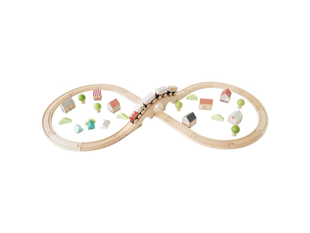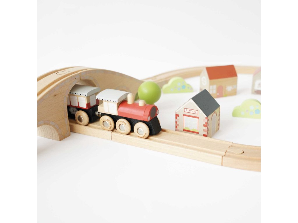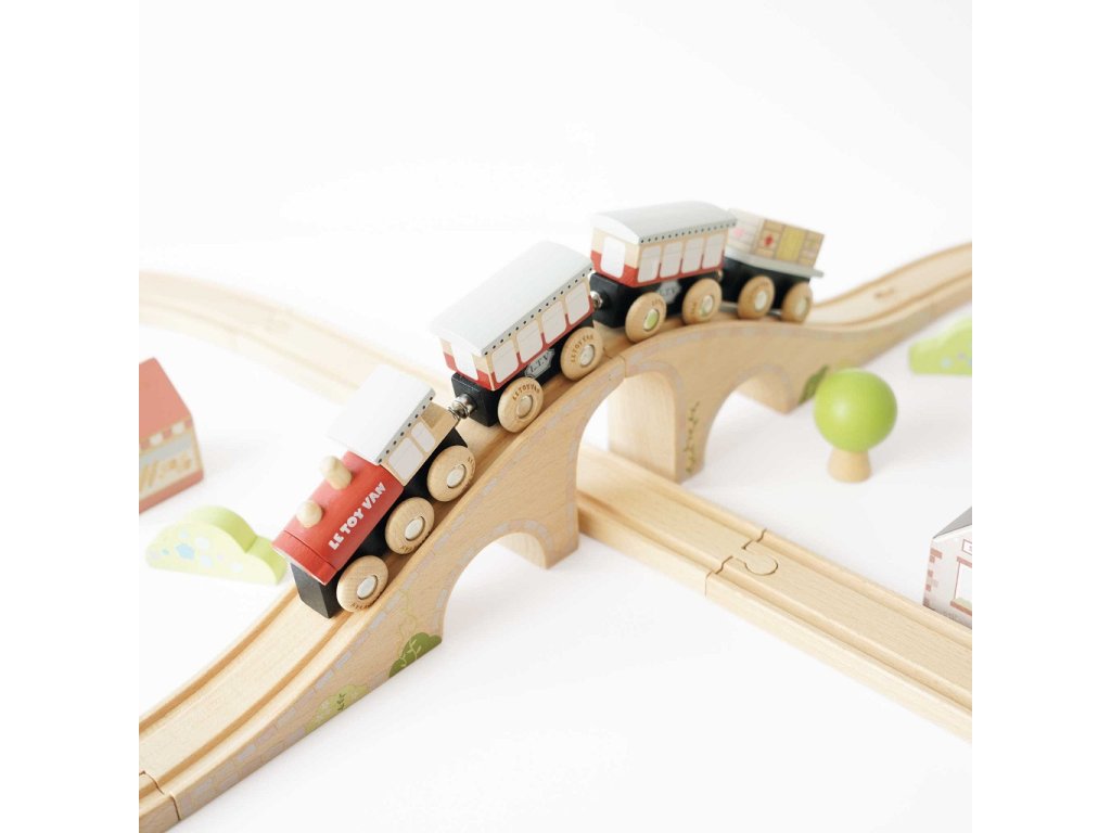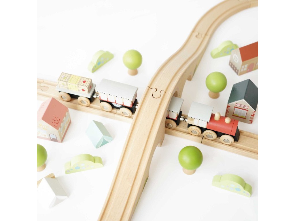 Táto drevená súprava je nielen úžasnou zábavou pre našich najmenších, ale aj skvelým bezplastovým doplnkom do detskej izbičky! 40-dielna súprava zahŕňa dráhu s klenutými kamennými mostami, vláčikmi, doplnkami a množstvom aktivít, ktoré inšpirujú k nápaditej hre. Drevené vagóny sú magnetické, preto sa ľahko spájajú. Detailné budovy ako stanica, farma a nemocnica spolu s kríkmi pridávajú hre viac realistickej atmosféry a posúvajú tak možnosti ďalej. Vláčikodráha je vyrobená z dreva s certifikáciou FSC® (drevo z lesov obhospodarovaných udržateľným spôsobom) a zdobená farbami na vodnej báze bezpečnými pre deti. Hračky s účelomVšetky hračky firmy Le Toy Van sú vyrobené s cieľom - aby dlho vydržali. Dizajnované s láskou skúsenými remeselníkmi za použitia etických praktík a udržateľných materiálov, ktoré sú láskavejšie k našej planéte. Hlavné vlastnosti: vyrobené eticky z FSC udržateľného drevamaľované netoxickými farbami na báze vodyobsahuje - 17 koľají/mostov, 4 vagóny, 3 stany, 7 budov a 9 stromovtestované podľa najprísnejších štandardovinšpiruje k nápaditej hre Značka a certifikát FSC® (Forest Stewardship Council) zaručuje, že drevo, z ktorého bol výrobok vyrobený, nebolo vyťažené nelegálne a pochádza z lesov obhospodarovaných šetrným či prírode blízkym spôsobom, v ktorom sú dodržiavané prísne environmentálne a sociálne požiadavky. Značka FSC® na výrobku znamená, že svojim nákupom pomáhate chrániť lesy a podporujete šetrné, zodpovedné či prírode blízke hospodárenie, vďaka ktorému sú naše lesy stabilnejšie, zdravšie, majú prirodzenú druhovú skladbu a lepšie odolávajú negatívnym následkom klimatických zmien.Dodatočné parametre