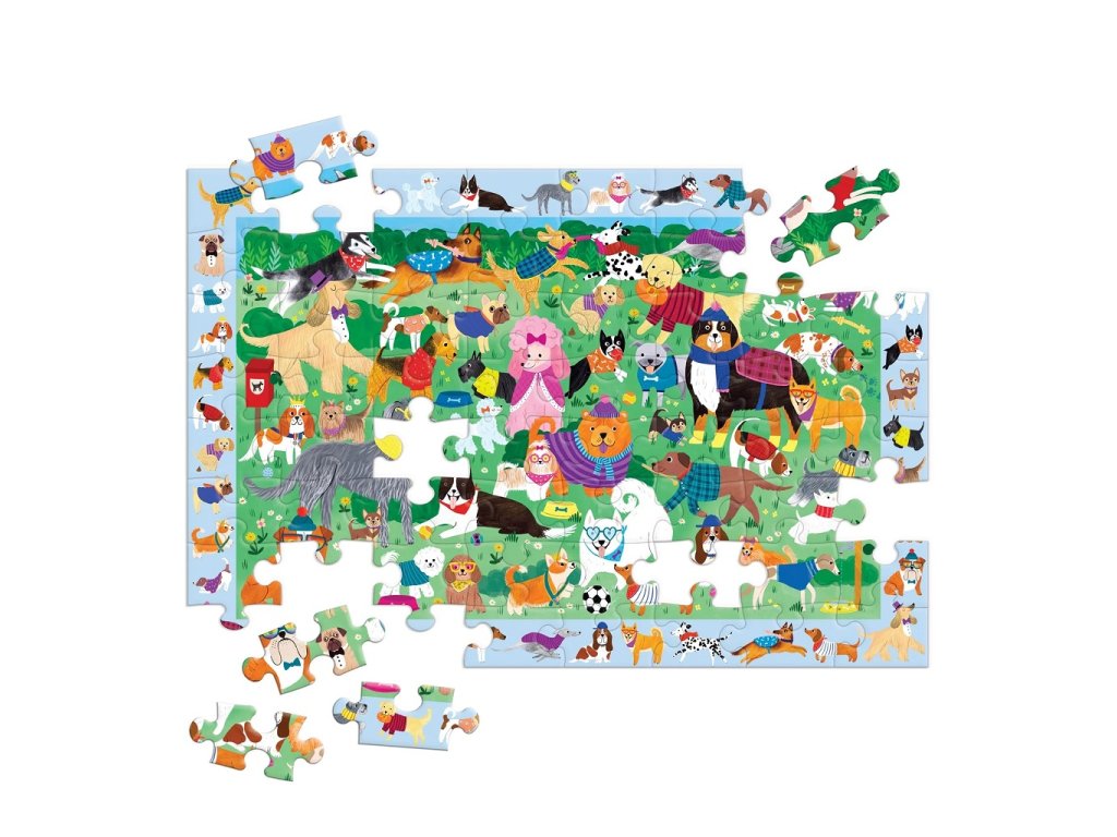 Táto skladačka prináša dobrodružný zážitok prostredníctvom obrázku. Najprv si deti môžu poskladať puzzle so scénou plnou roztomilých psíkov. Po zložení puzzle si deti môžu vyskúšať svoje pozorovacie schopnosti a nájsť viac ako 40 psíkov v ohraničení okolo obrázku. Sú tam všetky, môžete ich nájsť?