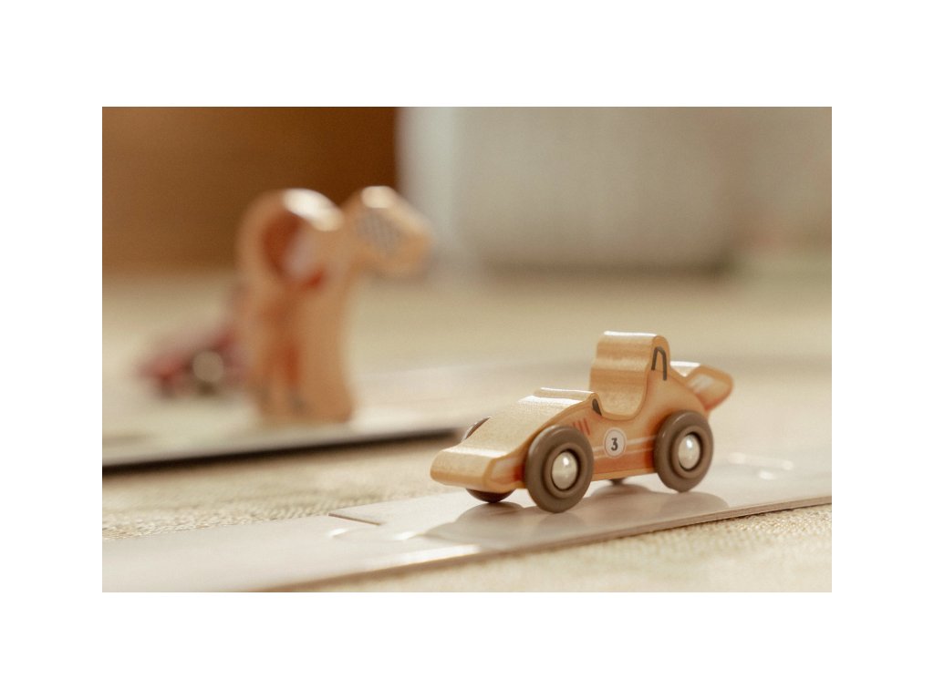 Drevený vozík v podobe ružového auta s krásnou kvetinovou potlačou je ako stvorený na prevážanie obľúbených hračiek, plyšákov a pod.