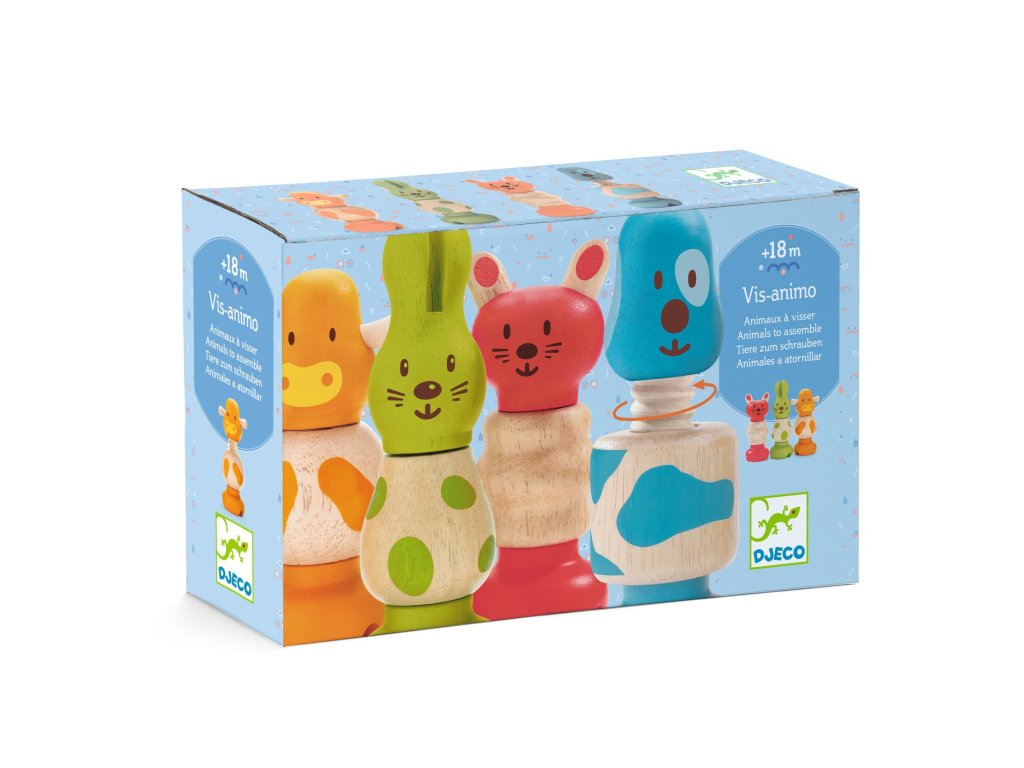 12 drevených farebných dielov sa dá navliekať, spájať, skrutkovať a vytvoriť tak 4 milé zvieratká. Alebo pomiešajte jednotlivé diely a nechajte dieťatko vytvoriť nové fantazijné zvieratká.