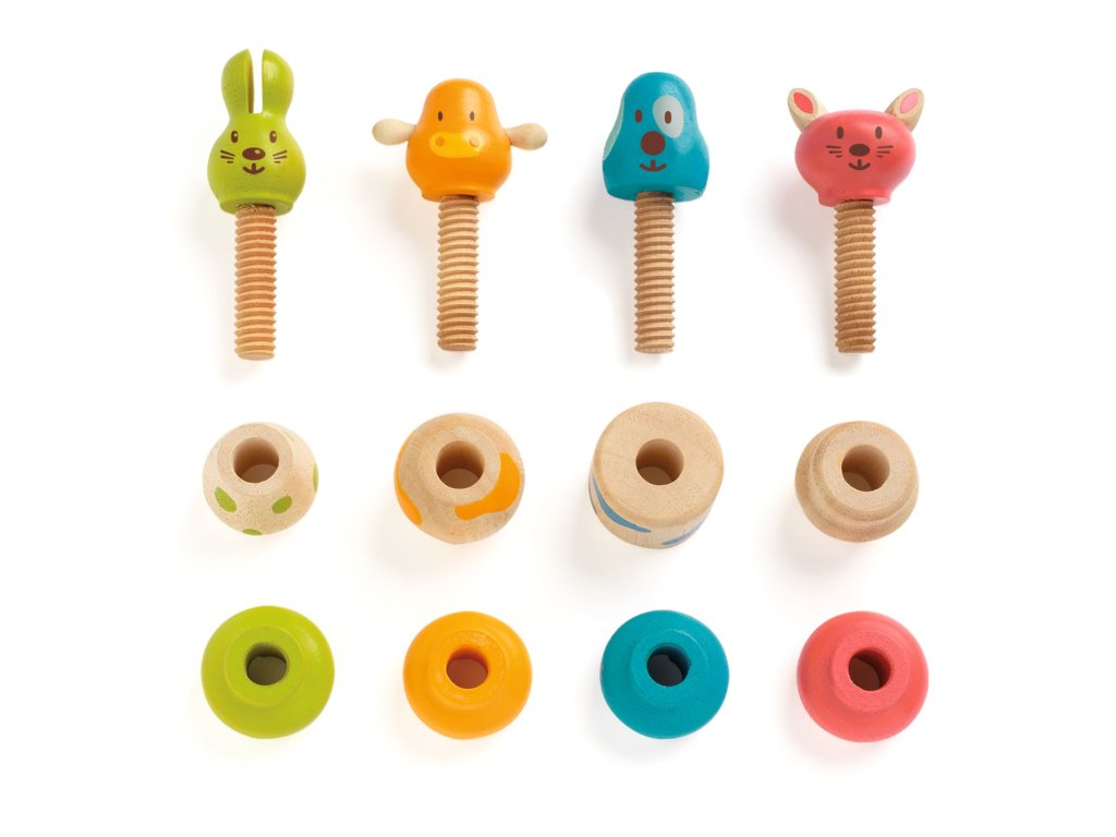 Batoľatá milujú opakujúci sa pohyb pri skrutkovaní jednotlivých dielov na kolík a to posilní ich zručnosť, silu v prstoch, dvojstrannú koordináciu a predstavivosť. Hračka je pevná, jednoduchá na manipuláciu a bezpečná pre detičky od 18 mesiacov.