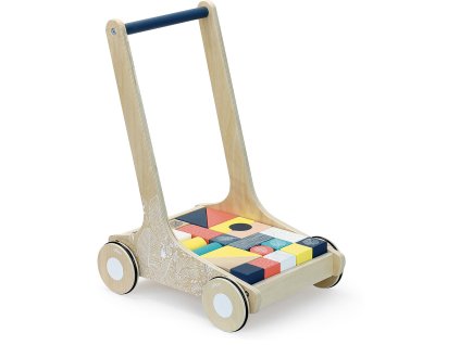 Drevený vozík s modrým madlom, bielou ilustráciou a pogumovanými kolieskami vezie 24 kociek farebných aj prírodných v rôznych tvaroch. Deti podporí pri chôdzi, hra s kockami...