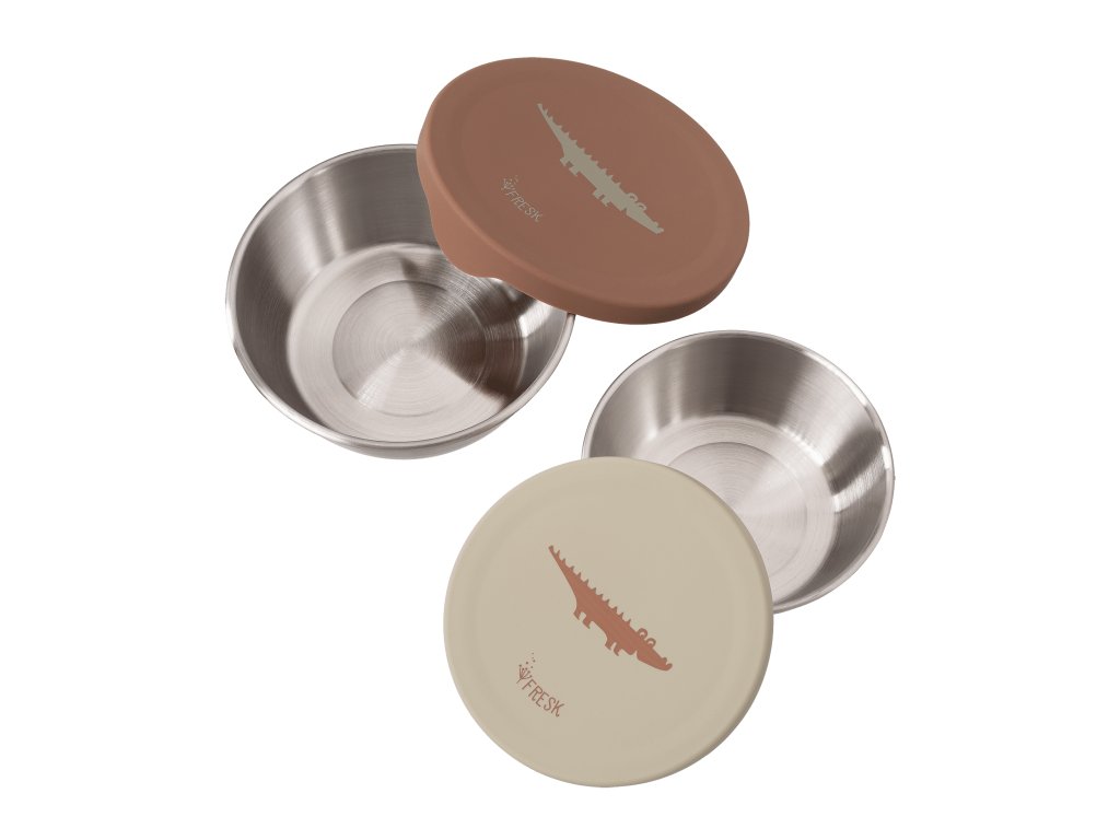 Dve dózy sú vyrobené z pevnej nehrdzavejúcej ocele a majú praktické silikónové viečka. Oceľové dno zabezpečuje, že nenaťahujú farbu ani vôňu z potravín, a flexibilné silikónové viečko ľahko otvoria aj malé detské rúčky.