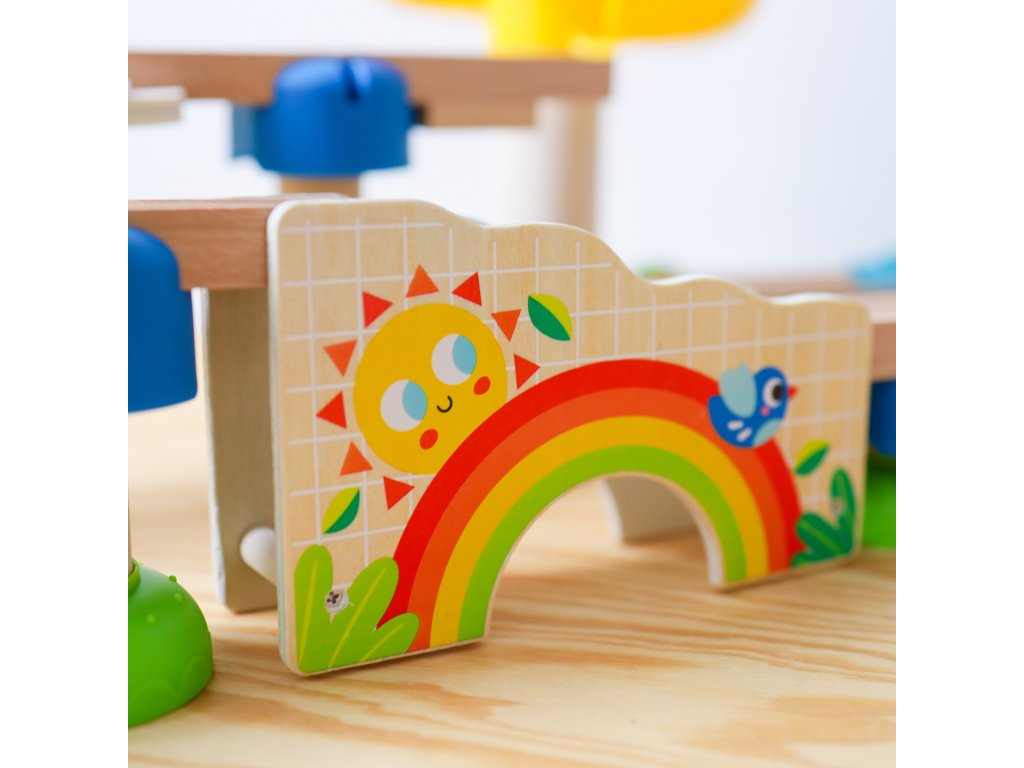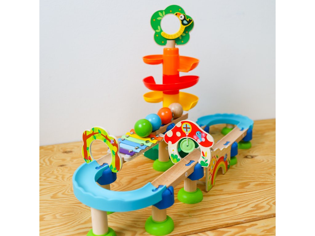 Deti si pri hre taktiež rozvíja svoju kreativitu a fantáziu, zlepšujú si jemnú motoriku alebo sa zoznamujú so základnými princípmi fyziky. Okrem toho ich stavanie aj pozorovanie guličky neskutočne zabaví. Guličky sú veľké a bezpečné! Drevené hračky pre deti Tooky Toy sú vyrobené z pevného kvalitného plastu a dreva natretého netoxickými farbami. Guľôčková dráha s dominom je vhodná pre deti od 3 rokov.