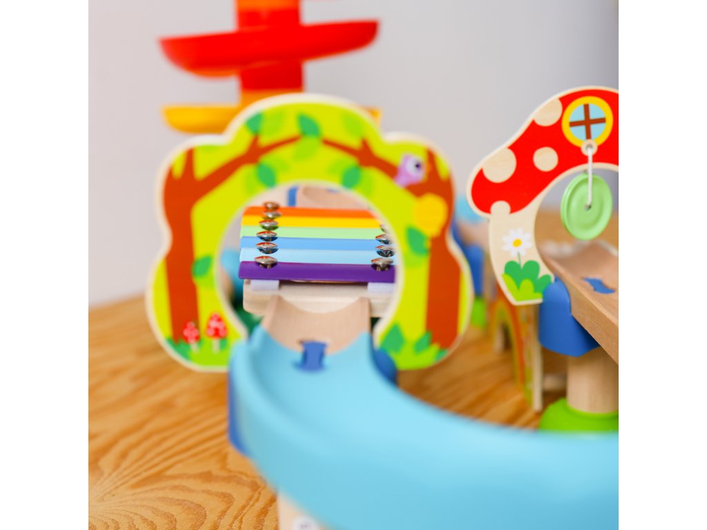 Juchú! Rýchla jazda lesom! Tri farebne odlišné kolieska ozdobené rôznymi vzormi stekajú po troch drevených rampách v obľúbenom lesnom vzhľade.