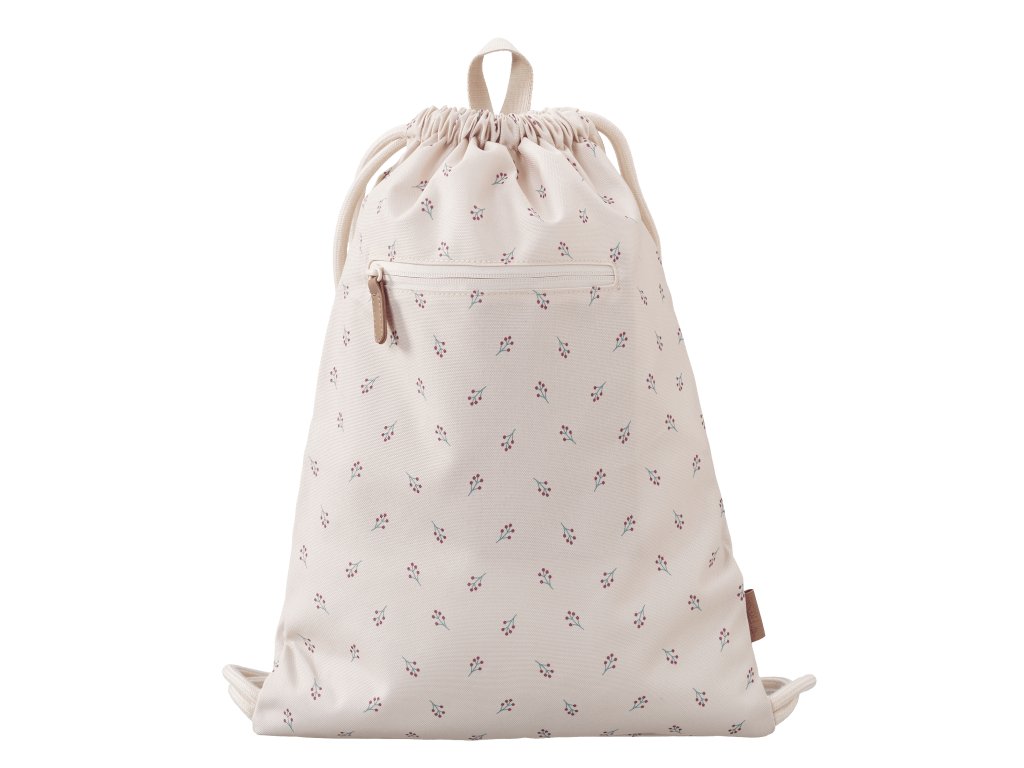 Štýlový ruksak z recyklovaných PET fliaš so vzorom bobuliek v krémovej farbe.