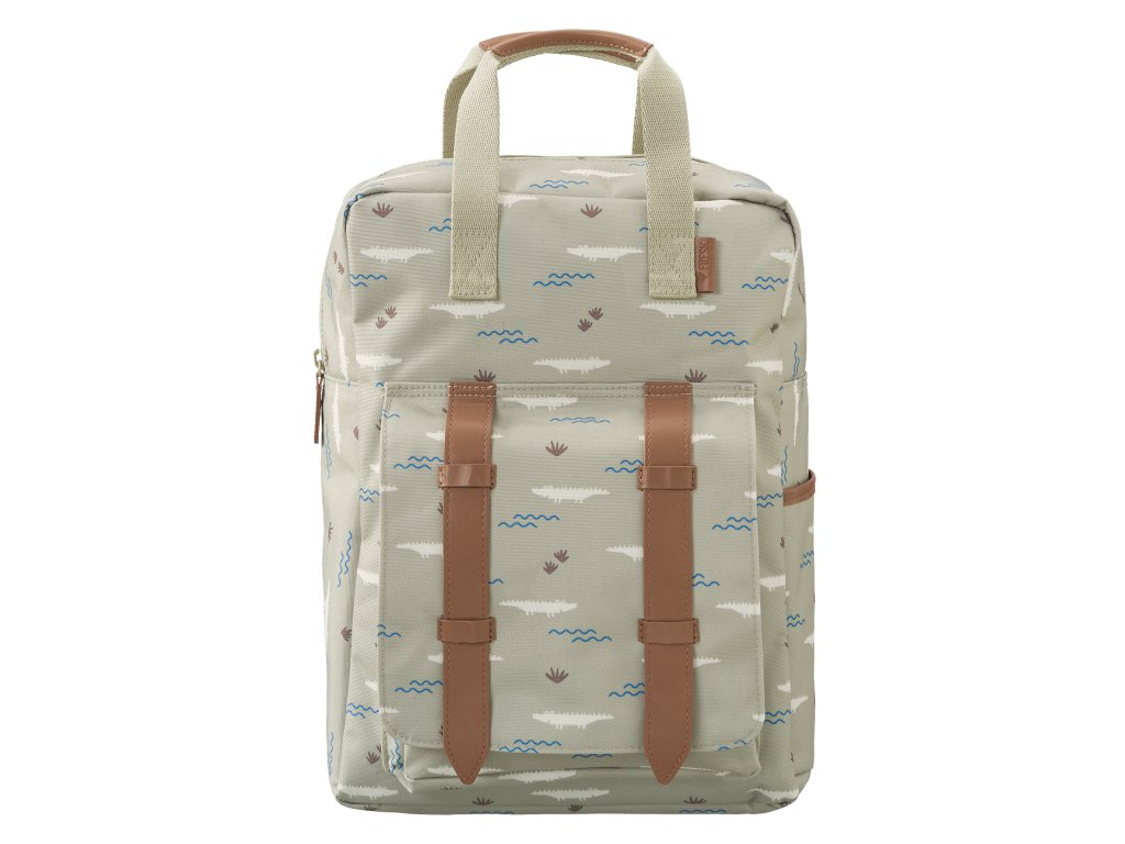 Roztomilý detský ruksak z recyklovaných PET fliaš so vzorom krokodílov v zelenej farbe.