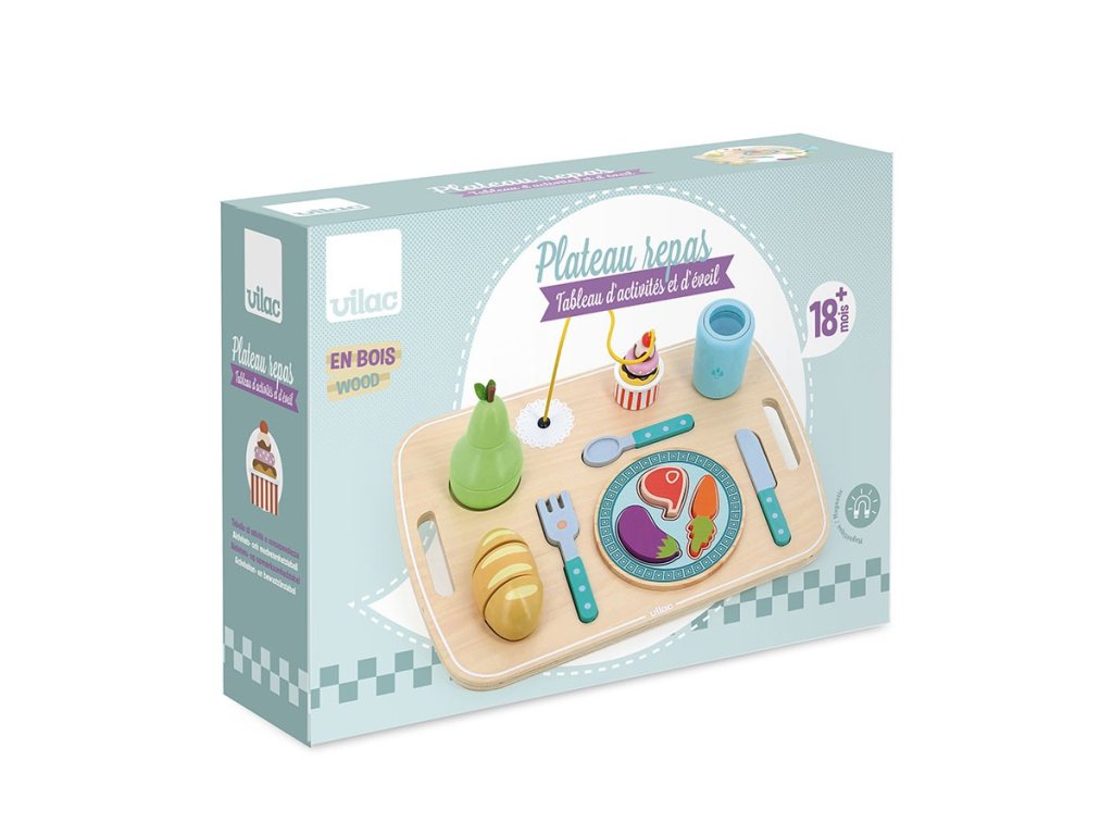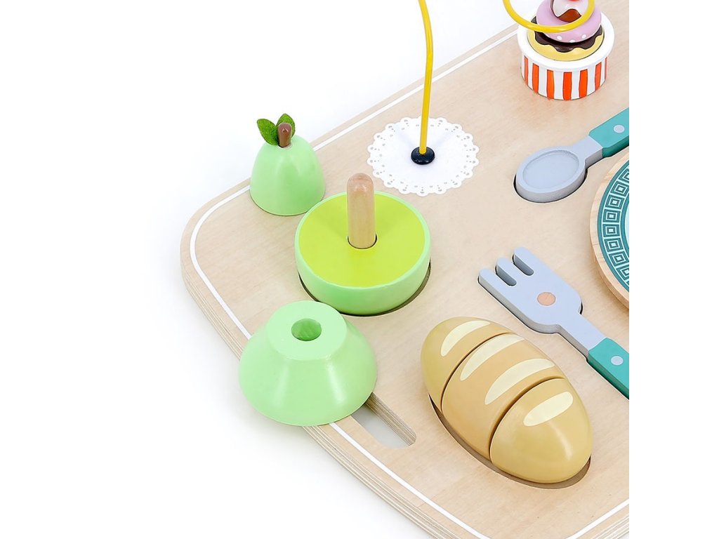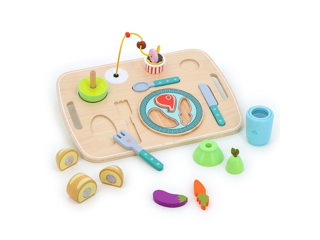Je čas zasadnúť do jedla – a zároveň sa hrať! Tento drevený podnos s aktivitami prináša deťom nielen zábavu, ale aj podporu pri rozvoji jemnej motoriky, koordinácie a logického myslenia. Každý prvok má na podnose svoje pevné miesto, a tak si deti hravou formou precvičujú priraďovanie a orientáciu v priestore.Nájdu tu krájací bochník chleba, stohovateľnú hrušku, zmrzlinu s pohyblivými dielikmi, mäso a zeleninu na zostavenie aj hrkálku v tvare pohára vody. Vďaka veselým farbám, príjemným tvarom a správnej veľkosti je hračka ideálna pre malé detské ručičky.Skvelá voľba pre prvú hru na „stolovanie“ – so štipkou fantázie a množstvom radosti. Dobrú chuť! Hlavné vlastnosti: podporuje nezávislosť, jemnú motoriku a koordináciu ruka-okopodnecuje kreatívne myslenie a vývoj predstavivostisenzorická stimuláciaedukácia cez hruhračka inšpirovaná Montessorivhodné od 18 mesiacov veku dieťaťaDodatočné parametre