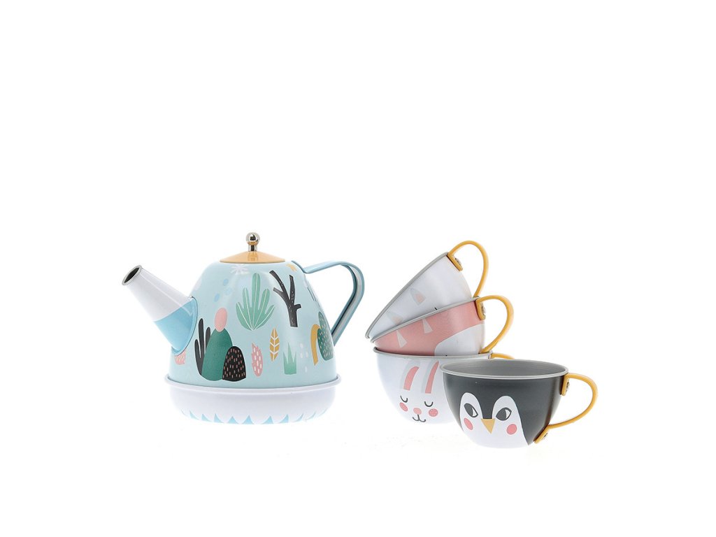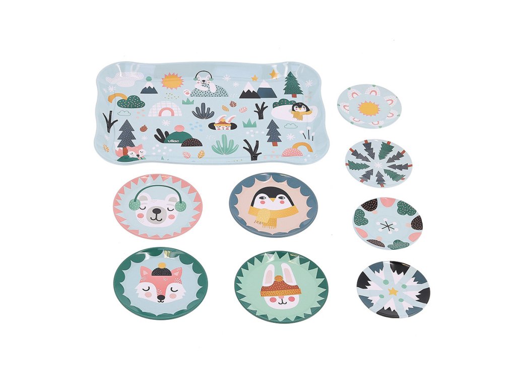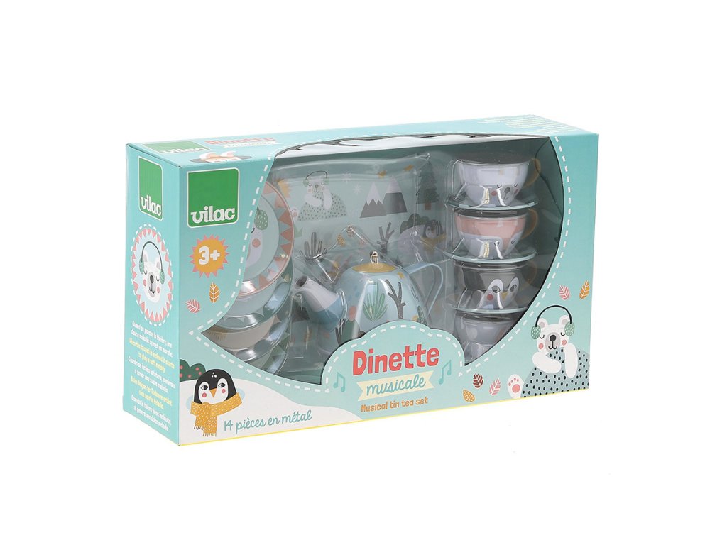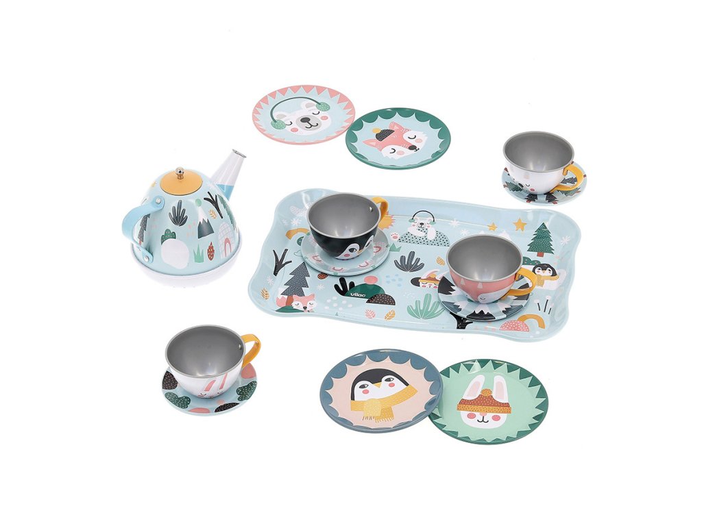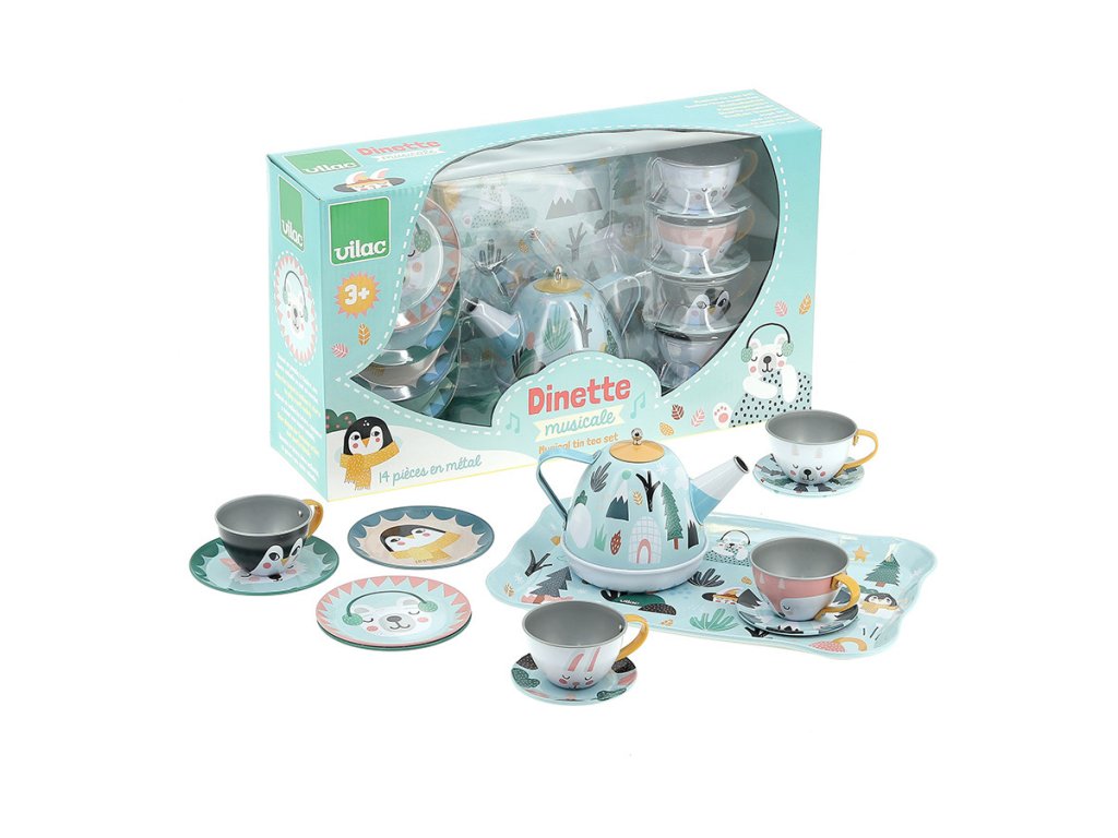 Kovový set riadu s krásnou zvieracie ilustrácií, s podtáčí. Tento set je špeciálny v tom, že pri servírovaní hrá hudbu. V balení nájdete 14 ks vybavenie: veľký tácka pre ľahký presun riadu, 4 hrnčeky s podtácky, 4 dezertné tanieriky a kanvičku, ktorá pri náklone začne hrať peknú melódiu. Veľkosť tak akurát pre detské ruky. Ilustrované Michelle Carlslund. Vyrobené vo Francúzsku. Hlavné vlastnosti: kovová sada riaduvnútri kanvice na čas je ukrytý naťahovací hudobný strojčekdizajn Michelle Carlslundobsahuje 14 ks Cestujte s nami v naivnom a elegantnom svete dánskej ilustrátorky Michelle Carlslund, svete jemných farieb, ktorý je plný roztomilých medveďov a priateľských vtáčikov. V roku 2010, keď Michelle ešte študovala grafický dizajn, vytlačila doma svoje ilustrácie a skúsila ich predať na dizajnovom trhu, kde sa stretli s veľkým úspechom! Niekoľko obchodíkov chcelo začať predávať jej výtvory, a tak ju napadlo, že by bolo fajn začať podnikať. Michelle sa rýchlo stala uznávanou nezávislou ilustrátorkou. Dnes možno jej ekologické grafické diela zakúpiť po celom svete v dizajnových butikoch, papiernictvách a detských obchodoch. Michelle sa inšpiruje všetkým okolo nej. Jej výtvory sú nežné a poetické, štylizovaný a detinský štýl, ktorý sa perfektne prelína s hračkami firmy Vilac. „Som hranolky milujúca, časová optimistka a tvorkyňa ekologických plagátov a ilustrátorka na voľnej nohe so sídlom v dánskej Kodani,“ to by povedala ilustrátorka Michelle Carlslundová, keby sa mala popísať jednou vetou.Dodatočné parametre
