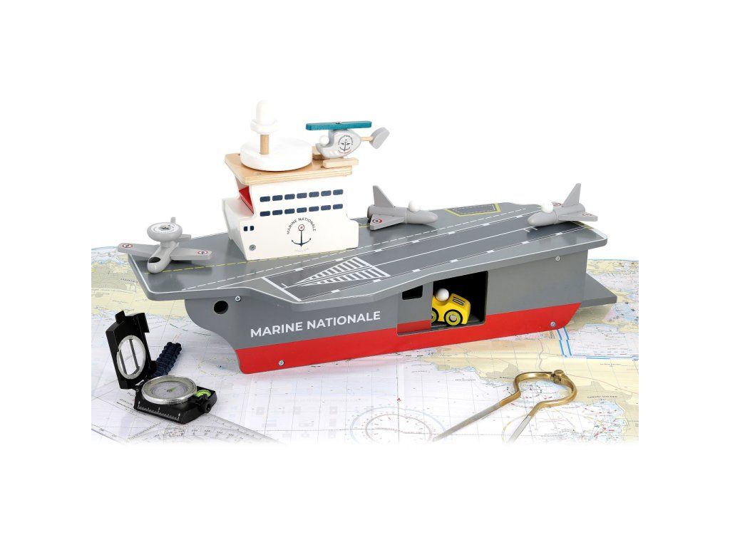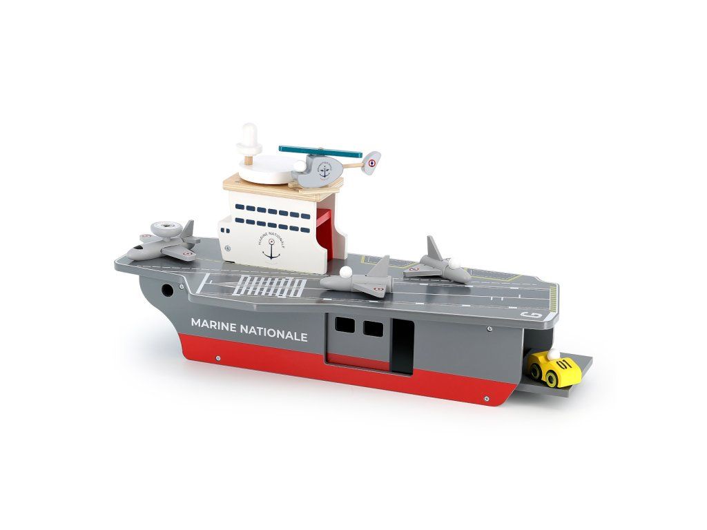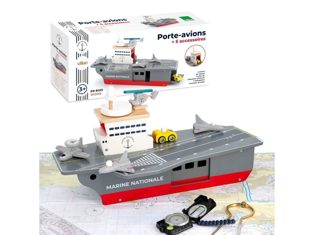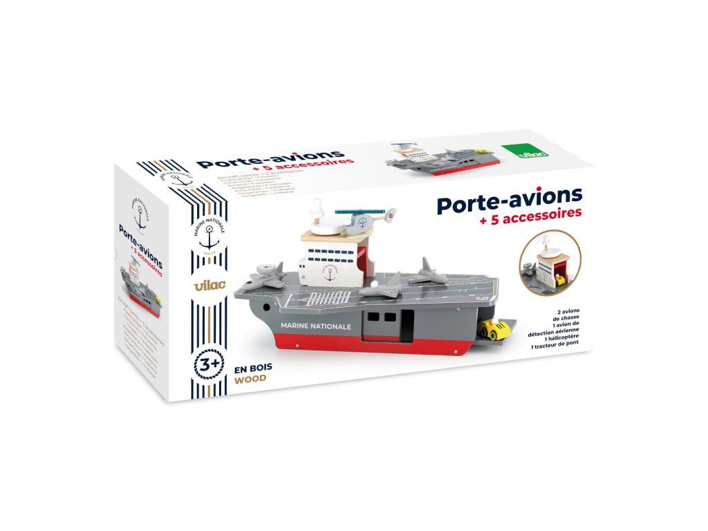 S lietadlovou loďou môžu Vaše deti vyraziť na šíre more brániť mier a bezpečie. Je vybavená radom lietadielok aj iných strojov a ponúka dostatok priestoru pre hry s figúrkami, alebo aj ďalšími hračkami. Ako praktický úložný priestor pre príslušenstvo dodávané s loďou môže slúžiť rozmerné podpalubie ukryté za dvojicou rôznych dvierok. S palubou je funkčne prepojené výťahom vo veži, ktorý je nápadito ovládaný kolesom v podobe radaru, umiestneným na streche. Hračka je vyrobená zo silnej a odolnej, pritom ale ľahkej preglejky. Svojou farebnosťou a maľovanými detailmi verne napodobňuje skutočné lietadlové lode, samozrejme nie sú zabudnuté ani výsostné znaky francúzskeho námorníctva. Hlavné vlastnosti: lietadlová loď, 2 stíhačky, 1 prieskumné lietadlo, helikoptéra a servisné vozidlopraktický úložný priestor v podpalubífunkčný výťah spájajúci palubu s podpalubímatraktívne a odolné drevené spracovanie Šťastnú plavbu! To je prianie námorníkom, ktorí vyrážajú na more. Toto praje aj Vilac, so svojou kolekciou, ktorú vyvinuli v spolupráci s francúzskym námorníctvom. Vôňu mora vietor dofúkal až do pohoria Jura, výsledok určite poteší malých námorníkov a námorníčky, tiež dospelých, ktorí sa starajú o svoje vnútorné dieťa!Dodatočné parametre