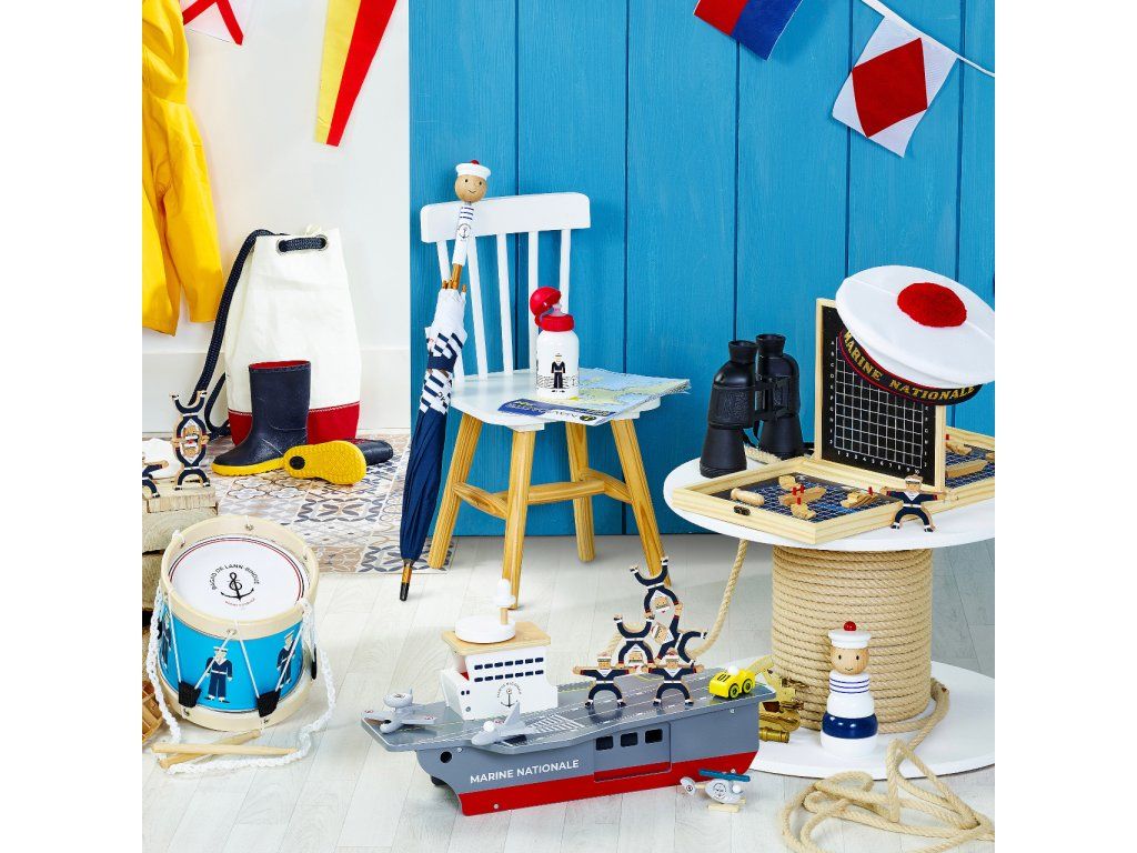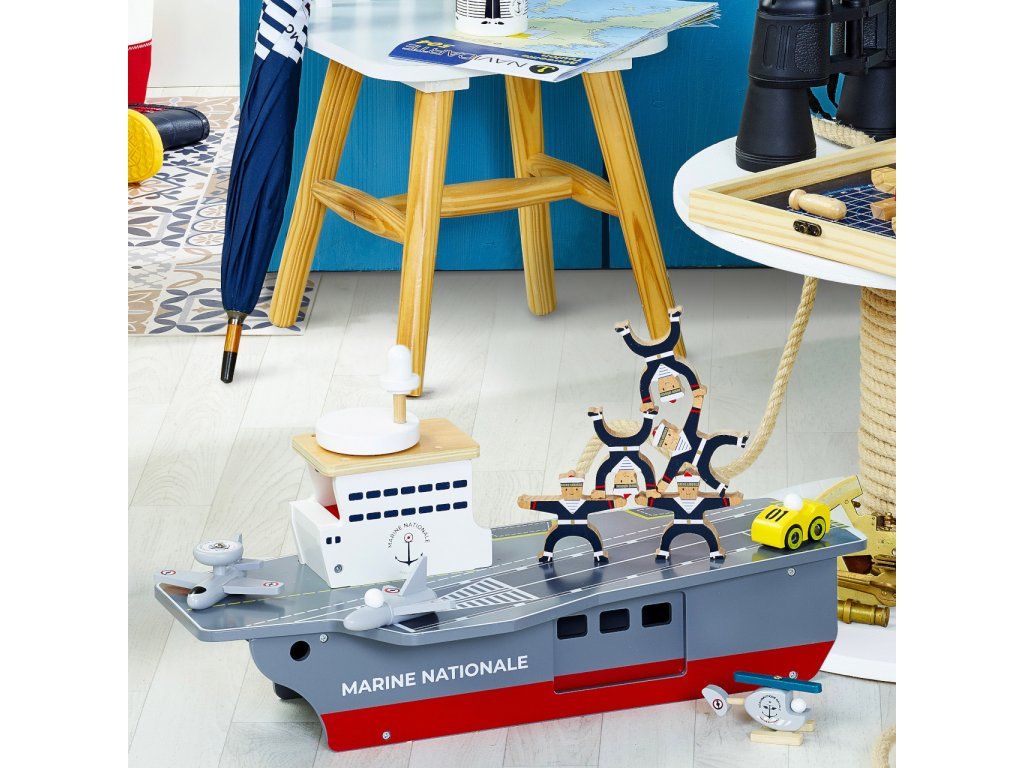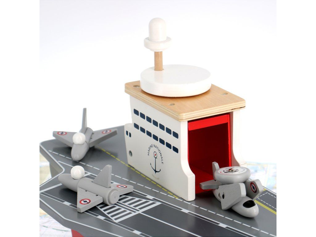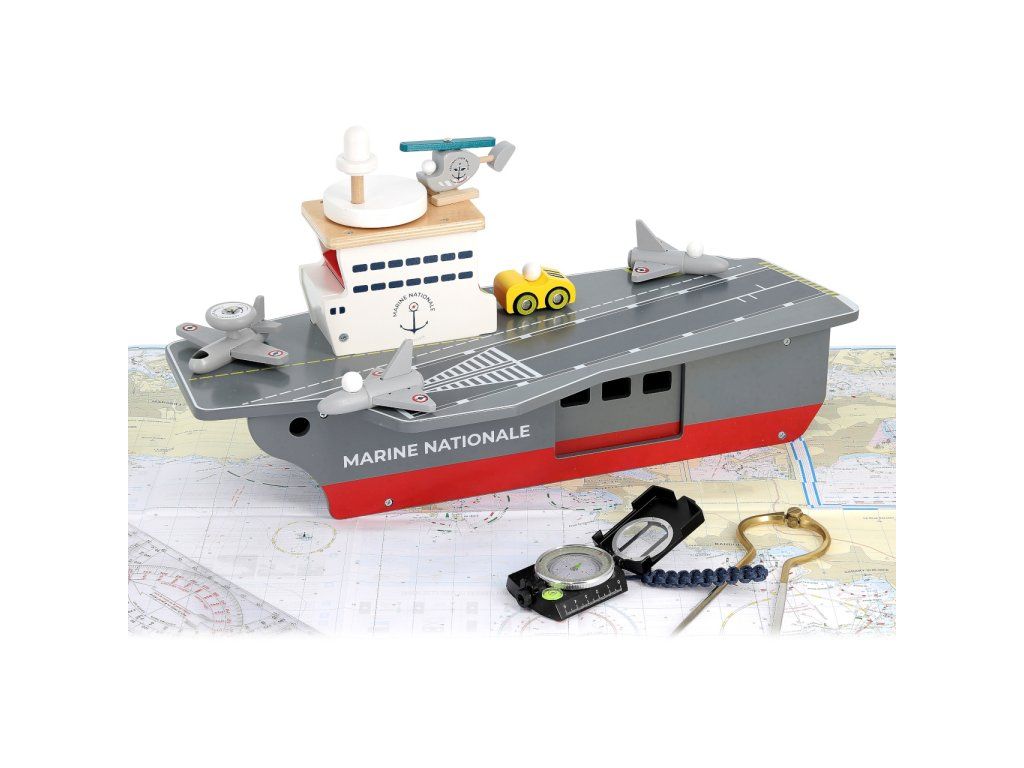 S lietadlovou loďou môžu Vaše deti vyraziť na šíre more brániť mier a bezpečie. Je vybavená radom lietadielok aj iných strojov a ponúka dostatok priestoru pre hry s figúrkami, alebo aj ďalšími hračkami. Ako praktický úložný priestor pre príslušenstvo dodávané s loďou môže slúžiť rozmerné podpalubie ukryté za dvojicou rôznych dvierok. S palubou je funkčne prepojené výťahom vo veži, ktorý je nápadito ovládaný kolesom v podobe radaru, umiestneným na streche. Hračka je vyrobená zo silnej a odolnej, pritom ale ľahkej preglejky. Svojou farebnosťou a maľovanými detailmi verne napodobňuje skutočné lietadlové lode, samozrejme nie sú zabudnuté ani výsostné znaky francúzskeho námorníctva. Hlavné vlastnosti: lietadlová loď, 2 stíhačky, 1 prieskumné lietadlo, helikoptéra a servisné vozidlopraktický úložný priestor v podpalubífunkčný výťah spájajúci palubu s podpalubímatraktívne a odolné drevené spracovanie Šťastnú plavbu! To je prianie námorníkom, ktorí vyrážajú na more. Toto praje aj Vilac, so svojou kolekciou, ktorú vyvinuli v spolupráci s francúzskym námorníctvom. Vôňu mora vietor dofúkal až do pohoria Jura, výsledok určite poteší malých námorníkov a námorníčky, tiež dospelých, ktorí sa starajú o svoje vnútorné dieťa!Dodatočné parametre