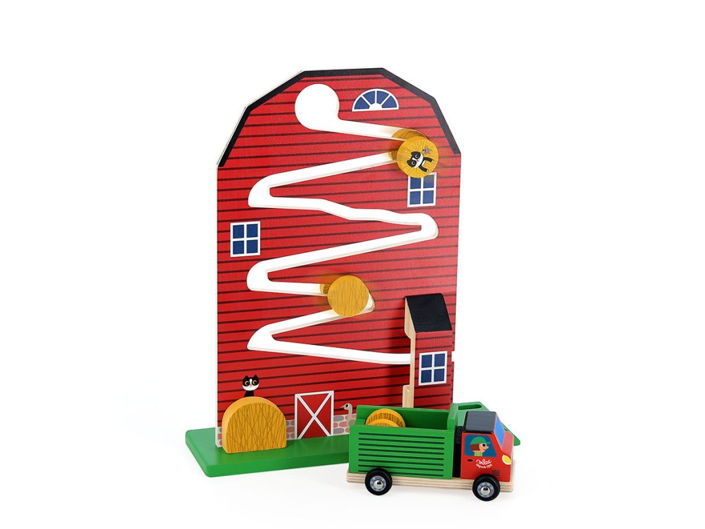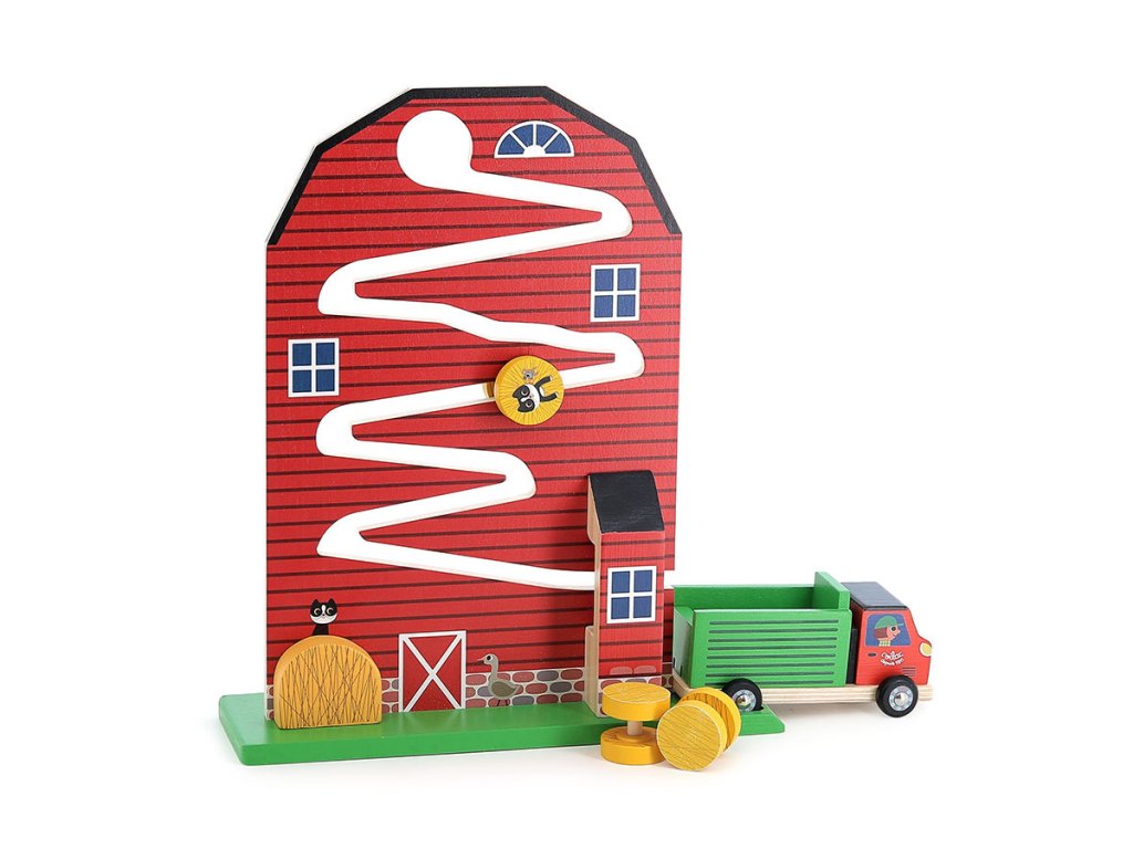 Drevená farma s ilustráciami Ingely P. Arrhenius ponúka deťom od 18 mesiacov hravý spôsob, ako rozvíjať motoriku, koordináciu a predstavivosť. Tri drevené balíky sena kĺžu po dráhe z farmy priamo do nákladiaka s otváracími dvierkami. Deti si precvičujú presnosť pohybov, učia sa vnímať príčinu a následok a vymýšľajú si vlastné príbehy o živote na vidieku. Hračka v sebe spája pohyb, logiku aj fantáziu, a pritom prináša radosť z objavovania a jednoduchej hry, ktorá nikdy neomrzí. Labyrint pomáha deťom pochopiť základný princíp príčiny a následku. Keď dieťa položí balík sena nahor, sleduje, ako skĺzne dole a skončí v aute. Jednoduchým spôsobom tiež zoznamuje s pojmami ako gravitácia a pohyb. Obsah balenia: 1 farma s dráhou3 balíky sena1 nákladiak s otváracími zadnými dvierkami Hlavné vlastnosti: odolné prevedenie z masívneho drevaideálna prvá motorická hračkarozvíja jemnú motoriku a koordináciu ruka-okoučí trpezlivosti a sústredenípodporuje predstavivosť a kreativituinšpirované Montessoripomáha chápať princíp príčiny a následkurozvíja logiku a napomáha poznávaniu svetailustrácie Ingela P. Arrheniusvhodné pre deti od 18 mesiacov Švédska umelkyňa Ingela Peterson Arrhenius sa narodila v roku 1967. Umenie a dizajn mali vždy miesto v jej živote a ako začala jej kariéra ilustrátorky, Ingela pracovala ako umelecká vedúca v Štokholme. Potom študovala reklamný a grafický dizajn na umeleckej škole tiež v Štokholme. V roku 1992 začala podnikať ako ilustrátorka na voľnej nohe a pracovala medzinárodne naprieč reklamou, dizajnom, nakladateľstvom… V minulosti vytvárala tlačové vzory pre tkaniny, tapety, papiernictva, tiež pracovala na obaloch, produktovom dizajne, bytových doplnkoch a hračkách. Jej plagáty a dizajnové hračky nájdete po celom svete. Má vášeň pre retro štýl, čo je jasne vidieť na jej dielach a tiež v jej nadšeniu pre typografiu a farby. Teraz žije v Štokholme s manželom a 2 synmi.Dodatočné parametre